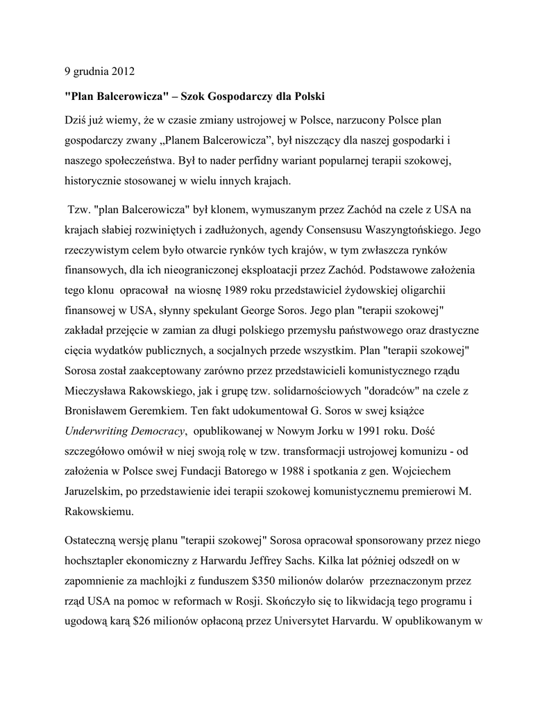 9 grudnia 2012 "Plan Balcerowicza" – Szok Gospodarczy dla Polski Dziś już wiemy, że w czasie zmiany ustrojowej w Polsce, narzucony Polsce plan gospodarczy zwany „Planem Balcerowicza”, był niszczący dla naszej gospodarki i naszego społeczeństwa. Był to nader perfidny wariant popularnej terapii szokowej, historycznie stosowanej w wielu innych krajach. Tzw. "plan Balcerowicza" był klonem, wymuszanym przez Zachód na czele z USA na krajach słabiej rozwiniętych i zadłużonych, agendy Consensusu Waszyngtońskiego. Jego rzeczywistym celem było otwarcie rynków tych krajów, w tym zwłaszcza rynków finansowych, dla ich nieograniczonej eksploatacji przez Zachód. Podstawowe założenia tego klonu opracował na wiosnę 1989 roku przedstawiciel żydowskiej oligarchii finansowej w USA, słynny spekulant George Soros. Jego plan "terapii szokowej" zakładał przejęcie w zamian za długi polskiego przemysłu państwowego oraz drastyczne cięcia wydatków publicznych, a socjalnych przede wszystkim. Plan "terapii szokowej" Sorosa został zaakceptowany zarówno przez przedstawicieli komunistycznego rządu Mieczysława Rakowskiego, jak i grupę tzw. solidarnościowych "doradców" na czele z Bronisławem Geremkiem. Ten fakt udokumentował G. Soros w swej książce Underwriting Democracy, opublikowanej w Nowym Jorku w 1991 roku. Dość szczegółowo omówił w niej swoją rolę w tzw. transformacji ustrojowej komunizu - od założenia w Polsce swej Fundacji Batorego w 1988 i spotkania z gen. Wojciechem Jaruzelskim, po przedstawienie idei terapii szokowej komunistycznemu premierowi M. Rakowskiemu. Ostateczną wersję planu "terapii szokowej" Sorosa opracował sponsorowany przez niego hochsztapler ekonomiczny z Harwardu Jeffrey Sachs. Kilka lat póżniej odszedł on w zapomnienie za machlojki z funduszem $350 milionów dolarów przeznaczonym przez rząd USA na pomoc w reformach w Rosji. Skończyło się to likwidacją tego programu i ugodową karą $26 milionów opłaconą przez Universytet Harvardu. W opublikowanym w 2006 roku polskim tłumaczeniu książki J. Sachsa Koniec walki z nędzą, przedstawił on szczegółowo okoliczności powstania ostatecznej wersji planu. W czerwcu już po częściowo wolnych wyborach wraz z przedstawicielem Międzynarodowego Funduszu Walutowego Davidem Liptonem, w redakcji informacyjnej „Gazety Wyborczej”, powstał ostatecznie tzw. plan Balcerowicza – „Pracowaliśmy całą noc do świtu, a w końcu wydrukowaliśmy piętnastostronicowy tekst, w którym przedstawiliśmy zasadnicze koncepcję i planowany chronologiczny porządek reform." Po jego akceptacji przez „triumwirat „Solidarności”, jak J. Sachs nazywa Adama Michnika, Jacka Kuronia i Bronisława Geremka i końcowej akceptacji Lecha Wałęsy, decydująca okazała się rozmowa w sierpniu 1989 roku z desygnowanym do roli nowego premiera T. Mazowieckim. „Musiał znaleźć kogoś, kto naprawdę byłby w stanie podjąć się tak ogromnego wysiłku. Wspomniał o Leszku Balcerowiczu, którego nie znałem - pisze J. Sachs - W końcu to właśnie Balcerowicz pokierował wykonaniem trudnych zadań gospodarczych." Plan w wersji J. Sachsa w ostatecznej ostał zaakceptowany na jesieni 1989 roku przez Międzynarodowy Fundusz Walutowy. Wszedł do realizacji w zaakceptowanym przez Sejm pakiecie 11 ustaw, a nazwano go "Planem Balcerowicza", choć sam Balcerowicz nigdy nie miał nic wspólnego z jego stworzeniem. Balcerowicz urodził się w 1947 roku w gospodarstwie średniorolnym. Dość wcześnie pokazał swój talent do abstrakcji cyfrowych i pewnie dzięki temu ukończył nie tylko studia magisterskie na SGPiS, ale nawet studia doktoranckie. To ogromny jego awans społeczno-zawodowy. Na studiach w SGPiS Balcerowicz zajmował się głównie ekonomią polityczną socjalizmu. Jak wspomina doc. Józef Kossecki, który poznał Balcerowicza na swoim seminarium w gmachu Komitetu Warszawskiego PZPR w 1980 roku, wykazał on całkowitą ignorancję w dziedzinie psychologii gospodarczej – w ogóle nie rozumiał problemu motywacji ludzi do pracy. Ta ignorancja mu została. Podczas swojego „szkolenia” w USA uchwycił tylko sprawę walki z inflacją. Bo to było najbardziej kompatybilne z ekonomią marksistowską, która stale borykała się z problemem w komunistycznej "gospodarki niedoboru". Problem konieczności dławienie popytu w gospodarce socjalistycznej, w związku ze stałymi w niej nieodoborami podaży, był bowiem nieustający. W 1980 roku Balcerowicz głosił bardzo oryginalną tezę, że Polskę zbawią banki. Trzeba przyznać, że temu podejściu został wierny. Wąska specjalizacja w dziedzinie finansów, za to bez uczuć emocjonalnych, czy też poczucia winy za krzywdy powstałe ze swoich działań, wskazuje na cechy psychopatyczne osobowości, a nawet na psychopatię. Psychopatię, czyli chorobę psychiczną, która jest niebezpieczna, ale nie wymaga hospitalizacji. Takiego właśnie człowieka potrzebowali do terapii szokowej w Polsce jej autorzy - USA i Zachód, amerykańska oligarchia finansowa, Bank Światowy i Międzynarodowy Fundusz Walutowy. Potrzebowali kogoś miernego, ale za to posłusznego i wiernego. Chłopskiego socjopatę z tytułem doktora ekonomii, czapkującego możnym tego świata. Kiedy w 1990 roku zostałem zarejestrowany jako kandydat na prezydenta, Leszek Balcerowicz od samego początku kampanii wyborczej był moim ulubionym "chłopcem do bicia". Donoszono mi z kuluarów Sejmu, że narzekał z tego powodu, ponieważ nigdy nie spodziewał się żadnej krytyki. Na każdym wiecu wyborczym powtarzałem hasło, które później przywłaszczył sobie Andrzej Lepper, „Balcerowicz musi odejść”. A było go za co bić. Za stały kurs dolara. Za podatek obrotowy. Za popiwek. Za złodziejską prywatyzację. Za chęć przekazania polskich banków w ręce zagranicznych inwestorów. Za niszczenie banków spółdzielczych. I za blokadę w tym samym czasie wszelkich inicjatyw powst