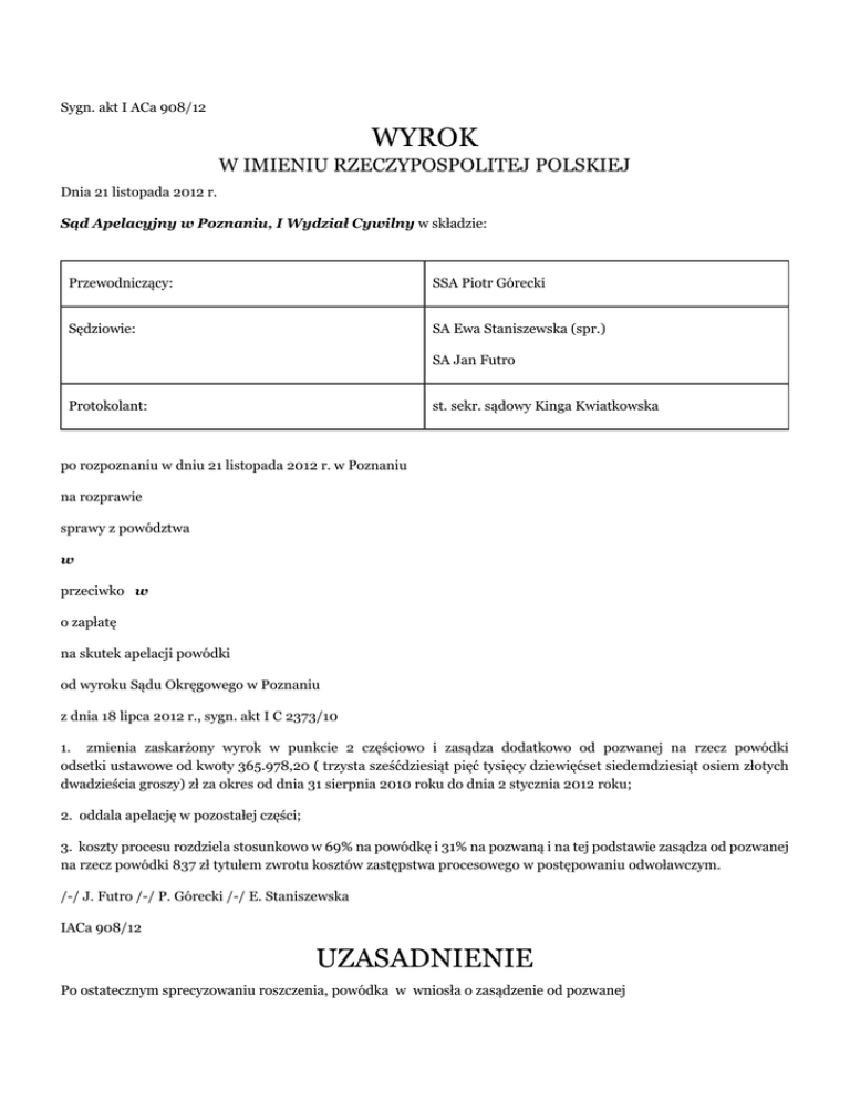Sygn. akt I ACa 908/12 WYROK W IMIENIU RZECZYPOSPOLITEJ POLSKIEJ Dnia 21 listopada 2012 r. Sąd Apelacyjny w Poznaniu, I Wydział Cywilny w składzie: Przewodniczący: SSA Piotr Górecki Sędziowie: SA Ewa Staniszewska (spr.) SA Jan Futro Protokolant: st. sekr. sądowy Kinga Kwiatkowska po rozpoznaniu w dniu 21 listopada 2012 r. w Poznaniu na rozprawie sprawy z powództwa w przeciwko w o zapłatę na skutek apelacji powódki od wyroku Sądu Okręgowego w Poznaniu z dnia 18 lipca 2012 r., sygn. akt I C 2373/10 1. zmienia zaskarżony wyrok w punkcie 2 częściowo i zasądza dodatkowo od pozwanej na rzecz powódki odsetki ustawowe od kwoty 365.978,20 ( trzysta sześćdziesiąt pięć tysięcy dziewięćset siedemdziesiąt osiem złotych dwadzieścia groszy) zł za okres od dnia 31 sierpnia 2010 roku do dnia 2 stycznia 2012 roku; 2. oddala apelację w pozostałej części; 3. koszty procesu rozdziela stosunkowo w 69% na powódkę i 31% na pozwaną i na tej podstawie zasądza od pozwanej na rzecz powódki 837 zł tytułem zwrotu kosztów zastępstwa procesowego w postępowaniu odwoławczym. /-/ J. Futro /-/ P. Górecki /-/ E. Staniszewska IACa 908/12 UZASADNIENIE Po ostatecznym sprecyzowaniu roszczenia, powódka w wniosła o zasądzenie od pozwanej w kwoty 384.378 zł. z ustawowymi odsetkami od dnia 28 listopada 2009r. do dnia zapłaty tytułem wynagrodzenia za bezumowne korzystanie z nieruchomości w zakresie służebności przesyłu. Pozwana wniosła o oddalenie powództwa podnosząc zarzut braku legitymacji czynnej i biernej, zarzut naruszenia art.5 k.c., a nadto powołując się na fakt, że posadowienie urządzeń przesyłowych na przedmiotowej nieruchomości znajduje umocowanie prawne w odpowiednich decyzjach administracyjnych. Wyrokiem z dnia 18 lipca 2012r. Sąd Okręgowy w Poznaniu zasądził od pozwanej na rzecz powódki kwotę 381.333,25 zł. z ustawowymi odsetkami od kwoty 365.978,20 zł od dnia 3 stycznia 2011r., a od kwoty 15.355,05 zł od dnia 14 kwietnia 2012r.; oddalił powództwo w pozostałej części i orzekł o kosztach procesu zasądzając m.in. od pozwanej na rzecz powódki kwotę 7200 zł tytułem kosztów zastępstwa procesowego. W uzasadnieniu wyroku Sąd powołał się na następujące ustalenia faktyczne i wnioski prawne. W okresie objętym sporem właścicielami nieruchomości o powierzchni 0,7562 ha położonej w przy byli kolejno: , i , i . Na nieruchomości tej, prawdopodobnie w latach 80 – tych ubiegłego wieku zostały posadowione urządzenia przesyłu energii elektrycznej. Ich eksploatacja skutkuje wyłączeniem z normalnego użytku 3.715,5 metrów kwadratowych powierzchni gruntu. Umową z dnia 30 czerwca 2007r. w zbyła na rzecz w poznaniu zorganizowaną część przedsiębiorstwa w postaci oddziału samodzielnie sporządzającego bilans, stanowiącego organizacyjnie i finansowo wyodrębniony zespół składników materialnych i niematerialnych przeznaczonych do realizacji zadań gospodarczych związanych z dystrybucją energii elektrycznej. W skład oddziału wchodziło m.in. prawo własności urządzeń przesyłowych posadowionych na położonej w w rejonie . Pozwem z dnia 20 kwietnia 2006r. ówcześni i wystąpili do Sądu Rejonowego Poznań – Nowe Miasto w z pozwem o zapłatę kwoty 500 zł tytułem wynagrodzenia za bezumowne korzystanie z nieruchomości za luty 2006r. Pismami z dnia 19 listopada 2009r. właściciele nieruchomości wezwali w do zapłaty na ich rzecz odpowiednich kwot wynagrodzeń z tytułu korzystania z nieruchomości w zakresie odpowiadającym służebności przesyłu. W odpowiedzi na wezwanie odmówiła zapłaty, wskazując, że na skutek przekształceń spółki został wydzielony nowy podmiot w , na rzecz której została zbyta własność urządzeń przebiegających przez nieruchomość . W dniu 18 sierpnia 2010r. właściciele nieruchomości na przestrzeni okresu od 13 marca 2001r. do sierpnia 2010r., tj. , i , w oraz Sp z o.o. w , zawarli z powódką umowy przelewu wierzytelności, których przedmiotem były wierzytelności z tytułu bezumownego korzystania z opinanej wyżej nieruchomości za okresy, w których byli jej właścicielami. W tak ustalonym stanie faktycznym Sąd Okręgowy uznał, że roszczenie znajduje uzasadnienie w treści art. 230 k.c. w zw. z art. 224§2 k.c. i 225 k.c., albowiem pozwana nie wykazała, aby jej korzystanie z nieruchomości w zakresie służebności przesyłu znajdowało umocowanie prawne w decyzji administracyjnej, umowie bądź orzeczeniu sądu. Legitymacja czynna powódki wynikała zaś z treści zawartych umów przelewu wierzytelności objętej sporem, natomiast legitymacja bierna pozwanej za okres do 30 czerwca 2007r. z treści umowy z o zbyciu zorganizowanej części przedsiębiorstwa i art. 55 ze zn.4 k.c. Z kolei wysokość roszczenia została dowiedziona opinią biegłego sądowego. Sąd nadto ocenił, że w sprawie nie zachodzą żadne szczególne okoliczności implikujące wniosek, że roszczenie jest sprzeczne z zasadami współżycia społecznego. O roszczeniu odsetkowym Sąd orzekł na podstawie art. 481 k.c. w zw. z art. 455 k.c. Powódka wskazywała, że przed wszczęciem procesu, pismami z dnia 19 listopada 2009r. (k. 78-86 akt), właściciele nieruchomości wezwali dłużnika do zapłaty na ich rzecz odpowiednich kwot tytułem wynagrodzenia za bezumowne korzystanie z nieruchomości, jednakże wezwanie to zostało skierowane do w , a więc spółki, która nie była stroną pozwaną w niniejszym postępowaniu. Powódka dołączyła do pozwu również wezwanie do zapłaty z dnia 24 sierpnia 2012r. ( k. 71- 72 akt) skierowane do pozwanej, jednakże nie dołączyła do niego żadnego dowodu, z którego wynikałoby, że pismo zostało faktycznie pozwanej doręczone. I w tym wypadku nie można przyjąć, że pozwana popadła w opóźnienie wcześniej niż z dniem zapoznania się z odpowiedzią na pozew. Sąd doszedł do przekonania, że roszczenie o zapłatę kwoty 365.978,20zł (o
