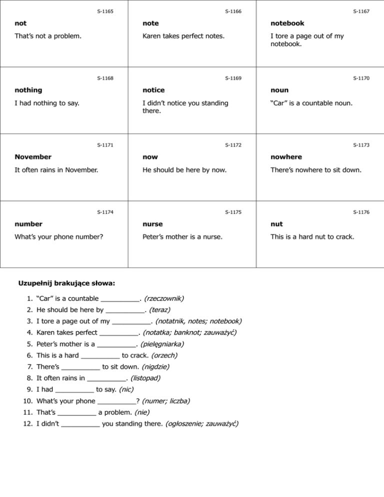 S-1165 S-1166 S-1167 not note notebook That’s not a problem. Karen takes perfect notes. I tore a page out of my notebook. S-1168 S-1169 S-1170 nothing notice noun I had nothing to say. I didn’t notice you standing there. “Car” is a countable noun. S-1171 S-1172 S-1173 November now nowhere It often rains in November. He should be here by now. There’s nowhere to sit down. S-1174 S-1175 S-1176 number nurse nut What’s your phone number? Peter’s mother is a nurse. This is a hard nut to crack. Uzupełnij brakujące słowa: 1. “Car” is a countable __________. (rzeczownik) 2. He should be here by __________. (teraz) 3. I tore a page out of my __________. (notatnik, notes; notebook) 4. Karen takes perfect __________. (notatka; banknot; zauważyć) 5. Peter’s mother is a __________. (pielęgniarka) 6. This is a hard __________ to crack. (orzech) 7. There’s __________ to sit down. (nigdzie) 8. It often rains in __________. (listopad) 9. I had __________ to say. (nic) 10. What’s your phone __________? (numer; liczba) 11. That’s __________ a problem. (nie) 12. I didn’t __________ you standing there. (ogłoszenie; zauważyć) S-1167 notatnik, notes; notebook Wydarłem kartkę z notatnika. S-1166 notatka; banknot; zauważyć S-1165 nie To nie problem. Karen robi świetne notatki. www.isel.edu.pl www.isel.edu.pl www.isel.edu.pl S-1170 S-1169 S-1168 rzeczownik ogłoszenie; zauważyć nic „Samochód” jest rzeczownikiem policzalnym. Nie zauważyłem, że tam stoisz. Nie miałem nic do powiedzenia. www.isel.edu.pl www.isel.edu.pl www.isel.edu.pl S-1173 S-1172 S-1171 nigdzie teraz listopad Nie można nigdzie usiąść. Powinien tu być do teraz. (Powinien już tu być.) W listopadzie często pada deszcz. www.isel.edu.pl www.isel.edu.pl www.isel.edu.pl S-1176 S-1175 S-1174 orzech pielęgniarka numer; liczba To ciężki orzech do zgryzienia. Matka Piotra jest pielęgniarką. Jaki jest twój numer telefonu? www.isel.edu.pl Odpowiedzi: 1. noun 2. now 3. notebook 4. notes 5. nurse 6. nut 7. nowhere 8. November 9. nothing 10. number 11. not 12. notice www.isel.edu.pl www.isel.edu.pl
