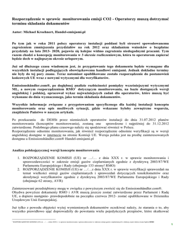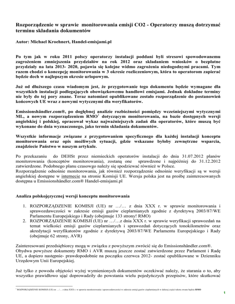 Rozporządzenie w sprawie monitorowania emisji CO2 - Operatorzy muszą dotrzymać terminu składania dokumentów Autor: Michael Kroehnert, Handel-emisjami.pl Po tym jak w roku 2011 polscy operatorzy instalacji poddani byli stresowi spowodowanemu zagrożeniem zmniejszenia przydziałów na rok 2012 oraz składaniem wniosków o bezpłatne przydziały na lata 2013- 2020, pojawia się kolejne widmo zagrożenia niedogodnymi pracami. Tym razem chodzi o koncepcję monitorowania w 3 okresie rozliczeniowym, która to operatorom zapierać będzie dech w najlepszym okresie urlopowym. Już od dłuższego czasu wiadomym jest, że przygotowanie tego dokumentu będzie wymagane dla wszystkich instalacji podlegających obowiązkowemu handlowi emisjami. Jednak dokładne terminy nie były do tej pory znane. Teraz natomiast opublikowane zostało rozporządzenie do postanowień końcowych UE wraz z nowymi wytycznymi dla weryfikatorów. Emissionshändler.com®, po dogłębnej analizie rozbieżności pomiędzy wcześniejszymi wytycznymi ML, a nowym rozporządzeniem RMO1 dotyczącym monitorowania, na bazie dostępnych wersji angielskiej i polskiej, opracował wykaz najważniejszych zadań dla operatorów, które muszą być wykonane do dnia wyznaczonego, jako termin składania dokumentów. Wszystkie informacje związane z przygotowaniem specyficznego dla każdej instalacji konceptu monitorowania oraz opis możliwych sytuacji, gdzie wskazane byłoby zewnętrzne wsparcia, znajdziecie Państwo w naszym artykule. Po przekazaniu do DEHSt przez niemieckich operatorów instalacji do dnia 31.07.2012 planów monitorowania (konceptów monitorowania), zostaną one sprawdzone i najpóźniej do 31.12.2012 zatwierdzone. Podobnego planu czasowgo należy się spodziewać również w Polsce. Rozporządzenie odnośnie monitorowania, jak również rozporządzenie odnośnie weryfikacji są w wersji angielskiej dostępne w internecie na stronie Komisji UE. Wersja polska jest na prośbę zainteresowanych dostępna u Emissionshändler.com® Handel-emisjami.pl Analiza polskojęzycznej wersji konceptu monitorowania 1. ROZPORZĄDZENIE KOMISJI (UE) nr …/… z dnia XXX r. w sprawie monitorowania i sprawozdawczości w zakresie emisji gazów cieplarnianych zgodnie z dyrektywą 2003/87/WE Parlamentu Europejskiego i Rady (obejmuje 133 strony! RMO) 2. ROZPORZĄDZENIE KOMISJI (UE) nr …/…z dnia XXX r. w sprawie weryfikacji sprawozdań na temat wielkości emisji gazów cieplarnianych i sprawozdań dotyczących tonokilometrów oraz akredytacji weryfikatorów zgodnie z dyrektywą 2003/87/WE Parlamentu Europejskiego i Rady (obejmuje 62 strony, AVR) Zainteresowani przedsiębiorcy mogą w związku z powyższym zwrócić się do Emissionshändler.com®. Obydwa powyższe dokumenty RMO i AVR muszą jeszcze zostać zatwierdzone przez Parlament i Radę UE, a dopiero następnie- prawdopodobnie na początku czerwca 2012- zostać opublikowane w Dzienniku Urzędowym Unii Europejskiej. Już tylko z powodu objętości wyżej wymienionych dokumentów oczekiwać należy, że starania o to, aby wszystko prawidłowo ująć doprowadziły do powstania wielu pojedyńczych przepisów, które skutkować 1 ROZPORZĄDZENIE KOMISJI (UE) nr …/… z dnia XXX r. w sprawie monitorowania i sprawozdawczości w zakresie emisji gazów cieplarnianych w dalszej części tekstu zwane będzie RMO 1 będą wzrostem nakładu pracy operatorów. Dokumenty te dotyczą zarówno instalacji stacjonarnych jak i ruchu lotniczego. Po dokonaniu oceny dokumentu angielskiego oraz po porównaniu go z posiadanym przez nas polskim tłumaczeniem, Emissionshändler.com® stwierdza, że najważniejsze zmiany w porównaniu do dotychczasowej koncepcji monitorowania to te, o których będzie mowa w poniższych rozdziałach. Ograniczymy się przy tym do istniejących instalacji stacjonarnych, pomijając ruch lotniczy. Ogolnie można już teraz powiedzieć, że z punktu widzenia operatorów szczególnej uwagi wymagać będzie przygotowanie dokumentów ze względu zarówno na ich zupełnie nową systematykę, jak i na znaczny wzrost wymagań dotyczących danych związanych z działalnością, czynników obliczeniowych, analiz, pobierania prób oraz czynników emisyjnych. Nowością jest również bardzo obszerna analiza źródeł niepewności oraz dowodzenie ciągłego ulepszania jakości monitorowania. Łącznie z konceptem monitorowania konieczne jest złożenie dokumentów stwierdzających zachowanie wymaganego poziomu, wyniku przeprowadzonej analizy ryzyka, oceny ryzyka, procedury i wytyczne dotyczące postępowania, regulacje dotyczące zmian oraz aktualizacji konceptu monitorowania, szczegółową dokumentację związaną z zarządzaniem danymi, informację o przeprowadzonych działaniach kontrolnych oraz sprawozdania dotyczącego ulepszeń. Wymagania te mogą dla znacznej większości małych i średnich operatotów stanowić całkowicie nowy wymiar, a conajmniej tak samo w zakresie knowhow jak i palnowania terminów mogą być równie stresujące jak składanie wniosków o przydziały uprawnień w roku 2011. Przebieg w czasie Obowiązujące do tej pory koncepcje monitorowania opierały się na wytycznych (ML). Te muszą teraz na podstawie rozporządzenia o monitorowaniu (RMO) zostać gruntownie zmienione. Jego obowiązywanie rozpoczyna się 01.01.2013 roku. Jeśli dla instalacji konieczne jest wprowadzenie zmian dotyczących gromadznia danych lub dokumentacji, muszą one zostać praktycznie przeprowadzone przed 01.01.2013. 2Wielkość emisji, które powstaną do końca 2012 roku zgodnie z wymaganiami określonymi przez ML, być muszą przekazane do odpowiedniego urzędu KOBIZE do dnia 31 marca 2013. Wielkość emisji, które powstaną po 1 stycznia 2013, są przez operatora określone na podstawie wymagań RMO. Sprawozdania odnośnie emisji w roku 2013 będą, analogicznie jak do tej pory, składane bezpośrednio w KOBIZE do dnia 31marca 2014. Dla weryfikacji sprawozdań emisyjnych za rok 2013 i 