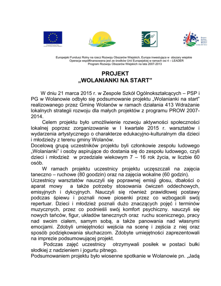 Europejski Fundusz Rolny na rzecz Rozwoju Obszarów Wiejskich, Europa inwestująca w obszary wiejskie Operacja współfinansowana jest ze środków Unii Europejskiej w ramach osi 4 – LEADER Program Rozwoju Obszarów Wiejskich na lata 2007-2013 PROJEKT „WOLANIANKI NA START” W dniu 21 marca 2015 r. w Zespole Szkół Ogólnokształcących – PSP i PG w Wolanowie odbyło się podsumowanie projektu „Wolanianki na start” realizowanego przez Gminę Wolanów w ramach działania 413 Wdrażanie lokalnych strategii rozwoju dla małych projektów z programu PROW 20072014. Celem projektu było umożliwienie rozwoju aktywności społeczności lokalnej poprzez zorganizowanie w I kwartale 2015 r. warsztatów i wydarzenia artystycznego o charakterze edukacyjno-kulturalnym dla dzieci i młodzieży z terenu gminy Wolanów. Docelową grupą uczestników projektu byli członkowie zespołu ludowego „Wolanianki” i osoby aspirujące do dostania się do zespołu ludowego, czyli dzieci i młodzież w przedziale wiekowym 7 – 16 rok życia, w liczbie 60 osób. W ramach projektu uczestnicy projektu uczęszczali na zajęcia taneczno – ruchowe (80 goodzin) oraz na zajęcia wokalne (60 godzin). Uczestnicy warsztatów nauczyli się poprawnej emisji głosu, dbałości o aparat mowy a także potrzeby stosowania ćwiczeń oddechowych, emisyjnych i dykcyjnych. Nauczyli się również prawidłowej postawy podczas śpiewu i poznali nowe piosenki przez co wzbogacili swój repertuar. Dzieci i młodzież poznali dużo znaczących pojęć i terminów muzycznych, przez co podnieśli swój komfort psychiczny. Nauczyli się nowych tańców, figur, układów tanecznych oraz ruchu scenicznego, pracy nad swoim ciałem, samym sobą, a także panowania nad własnymi emocjami. Zdobyli umiejętności wejścia na scenę i zejścia z niej oraz sposób podziękowania słuchaczom. Zdobyte umiejętności zaprezentowali na imprezie podsumowującej projekt. Podczas zajęć uczestnicy otrzymywali posiłek w postaci bułki słodkiej z nadzieniem i jogurtu pitnego. Podsumowaniem projektu było wiosenne spotkanie w Wolanowie pn. „Jadą goście, jadą….” w Wolanowie na ludowo!. które odbyło się w dniu 21 marca 2015 r. w miejscu realizacji projektu tj. Zespole Szkól Ogólnokształcących – PSP i PG w Wolanowie. W wydarzeniu tym udział wzięło 11 zespołów ludowych: 1. Zespół Ludowy „Wolanianki” 2. Dziecięcy Zespół Ludowy „Kukułeczki” ze Skrzyńska. 3. Zespół Śpiewaczy Ludowych z Bieniędzic. 4. Zespół Ludowy „Plejada” z Przytyka. 5. Dziecięcy Zespół Ludowy „Zakrzewianki” z Zakrzewa. 6. Dziecięcy Zespół Ludowy z Wrzosu. 7. Dziecięcy Zespół Ludowy z Bierwiec. 8.Zespół folklorystyczny „Wrzosowianki” z Wrzosu. 9. Zespół folklorystyczny Lokalnego stowarzyszenia Kobiet ze Skrzynna. 10. Grupa z Zespołu Szkół Muzycznych im. O. Kolberga w Radomiu. 11. Kapela Wiesławy Gromadzkiej. W spotkaniu uczestniczyło ponad 200 osób. Dla wszystkich uczestników przygotowany został poczęstunek – zgodnie z wybraną ofertą – obejmujący dania ciepłe: pierogi z mięsem i kapustą, bigos, paszteciki, barszcz czerwony jak również soki: pomarańczowy, jabłkowy, czarna porzeczka. Na poczęstunku nie zabrakło również dobrego ciasta, różnego rodzaju sałatek i przystawek jak również kawy i herbaty. Całość projektu nadzorowały: P. Barbara Waśkiewicz i P. Barbara Siuda.