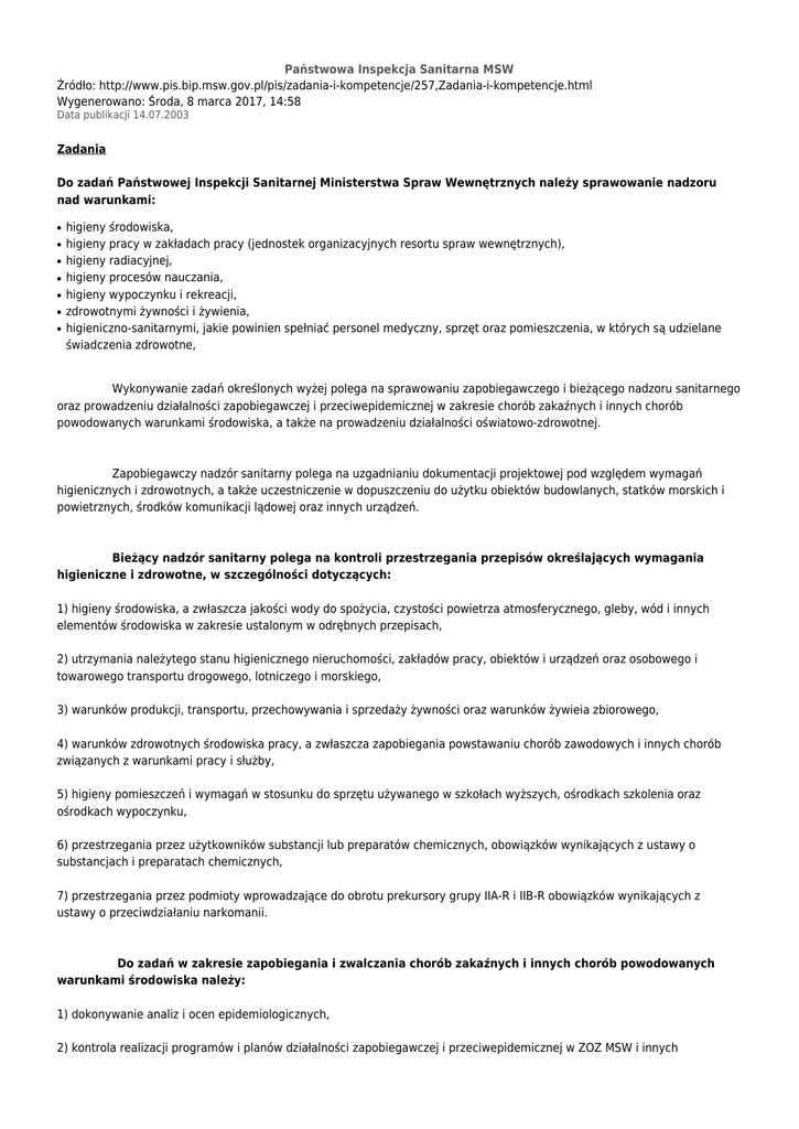 Państwowa Inspekcja Sanitarna MSW Źródło: http://www.pis.bip.msw.gov.pl/pis/zadania-i-kompetencje/257,Zadania-i-kompetencje.html Wygenerowano: Środa, 8 marca 2017, 14:58 Data publikacji 14.07.2003 Zadania Do zadań Państwowej Inspekcji Sanitarnej Ministerstwa Spraw Wewnętrznych należy sprawowanie nadzoru nad warunkami: ● ● ● ● ● ● ● higieny środowiska, higieny pracy w zakładach pracy (jednostek organizacyjnych resortu spraw wewnętrznych), higieny radiacyjnej, higieny procesów nauczania, higieny wypoczynku i rekreacji, zdrowotnymi żywności i żywienia, higieniczno-sanitarnymi, jakie powinien spełniać personel medyczny, sprzęt oraz pomieszczenia, w których są udzielane świadczenia zdrowotne, Wykonywanie zadań określonych wyżej polega na sprawowaniu zapobiegawczego i bieżącego nadzoru sanitarnego oraz prowadzeniu działalności zapobiegawczej i przeciwepidemicznej w zakresie chorób zakaźnych i innych chorób powodowanych warunkami środowiska, a także na prowadzeniu działalności oświatowo-zdrowotnej. Zapobiegawczy nadzór sanitarny polega na uzgadnianiu dokumentacji projektowej pod względem wymagań higienicznych i zdrowotnych, a także uczestniczenie w dopuszczeniu do użytku obiektów budowlanych, statków morskich i powietrznych, środków komunikacji lądowej oraz innych urządzeń. Bieżący nadzór sanitarny polega na kontroli przestrzegania przepisów określających wymagania higieniczne i zdrowotne, w szczególności dotyczących: 1) higieny środowiska, a zwłaszcza jakości wody do spożycia, czystości powietrza atmosferycznego, gleby, wód i innych elementów środowiska w zakresie ustalonym w odrębnych przepisach, 2) utrzymania należytego stanu higienicznego nieruchomości, zakładów pracy, obiektów i urządzeń oraz osobowego i towarowego transportu drogowego, lotniczego i morskiego, 3) warunków produkcji, transportu, przechowywania i sprzedaży żywności oraz warunków żywieia zbiorowego, 4) warunków zdrowotnych środowiska pracy, a zwłaszcza zapobiegania powstawaniu chorób zawodowych i innych chorób związanych z warunkami pracy i służby, 5) higieny pomieszczeń i wymagań w stosunku do sprzętu używanego w szkołach wyższych, ośrodkach szkolenia oraz ośrodkach wypoczynku, 6) przestrzegania przez użytkowników substancji lub preparatów chemicznych, obowiązków wynikających z ustawy o substancjach i preparatach chemicznych, 7) przestrzegania przez podmioty wprowadzające do obrotu prekursory grupy IIA-R i IIB-R obowiązków wynikających z ustawy o przeciwdziałaniu narkomanii. Do zadań w zakresie zapobiegania i zwalczania chorób zakaźnych i innych chorób powodowanych warunkami środowiska należy: 1) dokonywanie analiz i ocen epidemiologicznych, 2) kontrola realizacji programów i planów działalności zapobiegawczej i przeciwepidemicznej w ZOZ MSW i innych placówkach ochrony zdrowia, 3) wydawanie zarządzeń i decyzji lub występowanie do innych organów o ich wydanie - w przypadkach określonych w przepisach o zwalczaniu chorób zakaźnych, 4) wydawanie decyzji o stwierdzeniu choroby zawodowej lub decyzji o braku podstaw do jej stwierdzenia, 5) udział w kierowaniu akcją sanitarną przy masowych przemieszczeniach ludności, zjazdach i zgromadzeniach. Kompetencje Zadania, o których mowa wyżej, Państwowa Inspekcja Sanitarna MSW realizuje w odniesieniu do: 1) terenu, urzędu obsługującego ministra właściwego do spraw wewnętrznych oraz jednostek organizacyjnych podległych i nadzorowanych przez tego ministra (w tym: Policji, Państwowej Straży Pożarnej, Straży Granicznej, Biura Ochrony Rządu), 2) jednostek organizacyjnych Agencji Bezpieczeństwa Wewnętrznego i Agencji Wywiadu oraz stosunku do funkcjonariuszy tych agencji, 3) jednostek organizacyjnych Centralnego Biura Antykorupcyjnego oraz stosunku do funkcjonariuszy tych agencji 4) Podmiotów leczniczych tworzonych przez ministra właściwego do spraw wewnętrznych, 5) pracowników urzędu obsługującego ministra właściwego do spraw wewnętrznych oraz funkcjonariuszy Policji, Państwowej Straży Pożarnej, Straży Granicznej i Biura Ochrony Rządu. Państwowy Inspektor Sanitarny MSW na obszarze województwa lub upoważniony pracownik w związku z wykonywaną kontrolą ma prawo: 1) wstępu o każdej porze do obiektów jednostek organizacyjnych wskazanych w pkt 1 i 4, w tym również do środków transportu znajdujących się w dyspozycji jednostek organizacyjnych nadzorowanych przez ministra właściwego do spraw wewnętrznych, a w przypadku stwierdzenia albo podejrzenia choroby zakaźnej lub zagrożenia zdrowia czynnikami środowiskowymi - również do znajdujących się na ich terenie kwater i lokali mieszkalnych 2) żądania pisemnych lub ustnych informacji oraz wzywania i przesłuchiwania osób, 3) żądania okazania dokumentów i udostępnienia wszelkich danych niezbędnych w dochodzeniu epidemiologicznym lub dla ustalenia wykroczeń szwiązanych ze stanem sanitarnym, 4) pobierania nieodpłatnie próbek do badań, 5) nakazania, w drodze decyzji, usunięcia w określonym terminie stwierdzonych uchybień higienicznych i zdrowotnych, 6) wydania niezbędnych ze względu na ochronę zdrowia i życia ludzkiego decyzji o unieruchomieniu obiektu, zakładu pracy, jego części (stanowiska pracy lub urządzenia), wyłączeniu z eksploatacji środka transportu, wycofaniu z obrotu środka spożywczego, przedmiotu użytku lub innego wyrobu mogącego mieć wpływ na zdrowie ludzi albo o podjęciu lub zaprzestaniu innych działań, jeżeli naruszenie wymogów higienicznych i zdrowotnych spowodowało bezpośrednie zagrożenie życia lub zdrowia ludzi; decyzje w tych sprawach podlegają natychmiastowemu wykonaniu. Kontrola terenów obiektów (pomieszczeń) lub urządzeń niejawnych jednostek organizacyjnych podlegających nadzorowi Inspekcji wymaga posiadania przez Państwowego Inspektora Sanitarnego MSW lub pracownika Inspekcji stosownego poświadc