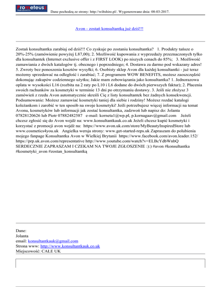 Dane pochodzą ze strony: http://wiltshire.pl/. Wygenerowano dnia: 08-03-2017. Avon - zostań konsultantką już dziś!!! Zostań konsultantka zarabiaj od dziś!!! Co zyskuje po zostaniu konsultantka? 1. Produkty tańsze o 20%-25% (zamówienie powyżej L87,00); 2. Możliwość kupowania z wyprzedaży przeznaczonych tylko dla konsultantek (Internet exclusive offer i z FIRST LOOK) po niszych cenach do 85%; 3. Możliwość zamawiania z dwóch katalogów tj. obecnego i poprzedniego; 4. Dostawa za darmo pod wskazany adres! 5. Zwroty bez ponoszenia kosztów wysyłki; 6. Osobisty sklep Avon dla każdej konsultantki - już teraz możemy sprzedawać na odległość i zarabiać; 7. Z programem WOW BENEFITS, możesz zaoszczędzić dokonując zakupów codziennego użytku; Jakie mam zobowiązania jako konsultantka? 1. Jednorazowa oplata w wysokości L16 (rozbita na 2 raty po L10 i L6 dodane do dwóch pierwszych faktur); 2. Płacenia swoich rachunków za kosmetyki w terminie 13 dni po otrzymaniu dostawy. 3. Jeśli nie złożysz 3 zamówień z rzedu Avon automatycznie skreśli Cię z listy konsultantek bez żadnych konsekwencji. Podsumowanie: Możesz zamawiać kosmetyki taniej dla siebie i rodziny! Możesz rozdać katalogi koleżankom i zarobić w ten sposób na swoje kosmetyki! Jeśli potrzebujesz więcej informacji na temat Avonu, kosmetyków lub informacji jak zostać konsultantka, zadzwoń lub napisz do: Jolanta 07828120626 lub Piotr 07882482587 e-mail: [email protected], [email protected] Jeżeli chcesz zgłosić się do Avon wejdź na: www.konsultantkauk.co.uk Jeżeli chcesz kupić kosmetyki i korzystać z promocji avon wejdź na: https://www.avon.uk.com/store/MyBeautyInspiredStore lub www.cosmetics4you.uk Angielka wersja strony: www.get-started-reps.uk Zapraszam do polubienia mojego fanpage Konsultantka Avon w Wielkiej Brytanii https://www.facebook.com/avon.leader.152/ https://prp.uk.avon.com/representative http://www.youtube.com/watch?v=ELBcYdbWnbQ SERDECZNIE ZAPRASZAM I CZEKAM NA TWOJE ZGŁOSZENIE :):) #avon #konsultantka #kosmetyki_avon #zostan_konsultantką Dane: Jolanta email: [email protected] Strona www: http://www.konsultantkauk.co.uk Miejscowość: CAŁE UK Dane pochodzą ze strony: http://wiltshire.pl/. Wygenerowano dnia: 08-03-2017.