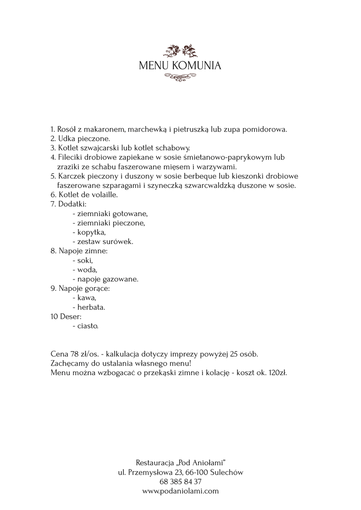 MENU KOMUNIA 1. Rosół z makaronem, marchewką i pietruszką lub zupa pomidorowa. 2. Udka pieczone. 3. Kotlet szwajcarski lub kotlet schabowy. 4. Fileciki drobiowe zapiekane w sosie śmietanowo-paprykowym lub zraziki ze schabu faszerowane mięsem i warzywami. 5. Karczek pieczony i duszony w sosie berbeque lub kieszonki drobiowe faszerowane szparagami i szyneczką szwarcwaldzką duszone w sosie. 6. Kotlet de volaille. 7. Dodatki: - ziemniaki gotowane, - ziemniaki pieczone, - kopytka, - zestaw surówek. 8. Napoje zimne: - soki, - woda, - napoje gazowane. 9. Napoje gorące: - kawa, - herbata. 10 Deser: - ciasto. Cena 78 zł/os. - kalkulacja dotyczy imprezy powyżej 25 osób. Zachęcamy do ustalania własnego menu! Menu można wzbogacać o przekąski zimne i kolację - koszt ok. 120zł. Restauracja „Pod Aniołami” ul. Przemysłowa 23, 66-100 Sulechów 68 385 84 37 www.podaniolami.com