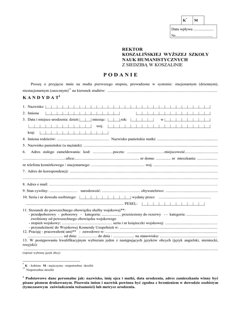 K* M Data wpływu .................... Nr..................................... REKTOR KOSZALIŃSKIEJ WYŻSZEJ SZKOŁY NAUK HUMANISTYCZNYCH Z SIEDZIBĄ W KOSZALINIE PODANIE Proszę o przyjęcie mnie na studia pierwszego stopnia, prowadzone w systemie: stacjonarnym (dziennym), niestacjonarnym (zaocznym)** na kierunek studiów: ............................................................................................................. K A N D Y D A T1 1. Nazwisko | | | | | | | | | | | | | | 2. Imiona | | | | | | | | | | | | 3. Data i miejsce urodzenia: dzień: | | | miesiąc: | | | | | | | | | | | | | woj. | kraj: | | | | | | | | | | | | | | | | | | | | | | | | | | | | | | | | | | | | | | | | | | | | | | rok: | | | | | w| | | | | | | | | | | | | | | | | | | | | | | | | | | | 4. Imiona rodziców: .................................................... Nazwisko panieńskie matki: ............................................................ 5. Nazwisko panieńskie (u mężatek): ..................................................................................................................................... 6. Adres stałego zameldowania: kod: ....................poczta: .....................................miejscowość................................. ...........................................ulica:................................................................ nr domu: ............... nr mieszkania: .................... nr telefonu komórkowego / stacjonarnego: ..................................................... woj. ................................................................ 7. Adres do korespondencji: ................................................................................................................................................... .................................................................................................................................................................................................. 8. Adres e mail: ………………………………………………………………………………………………………………. 9. Stan cywilny: ............................ narodowość: ...................................... obywatelstwo: .................................................... 10. Seria i nr dowodu osobistego: | | | | | | | | | | wydany przez: .................................................... ................................................................................................. PESEL: | | | | | | | | | | | | 11. Stosunek do powszechnego obowiązku służby wojskowej**: - przedpoborowy - poborowy - kategoria: ................... przeniesiony do rezerwy - - kategoria: ............................... zwolniony od powszechnego obowiązku wojskowego - stopień wojskowy: .................................................. seria i nr książeczki wojskowej: .................................................... - przynależność do Wojskowej Komendy Uzupełnień w: ................................................................................................. 12. Pracuję - pracowałem(-am)** - zawodowo w: ............................................................................................................... ................................... od dnia: ................... do dnia : ..................... na stanowisku: ......................................................... 13. W postępowaniu kwalifikacyjnym wybieram jeden z następujących języków obcych (język angielski, niemiecki, rosyjski): ................................................................................................................................................................................................. (wpisać wybrany język obcy) * K - kobieta: M - mężczyzna - niepotrzebne skreślić Niepotrzebne skreślić ** 1 Podstawowe dane personalne jak: nazwisko, imię ojca i matki, data urodzenia, adres zamieszkania winny być pisane pismem drukowanym. Pisownia imion i nazwisk powinna być zgodna z brzmieniem w dowodzie osobistym (tymczasowym zaświadczeniu tożsamości) lub metryce urodzenia. -2- RODZICE 14. Czy rodzice żyją : ojciec ................................................ matka ........................................................................................ 15. O j c i e c /wypełnić niezależnie od tego czy żyje, czy pozostaje we wspólnej rodzinie / gospodarstwie / i czy obecnie jeszcze pracuje / a/ zawód .................................................................................................................................................................................. 16. M a t k a /wypełnić niezależnie od tego czy żyje, czy pozostaje we wspólnej rodzinie / gospodarstwie / i czy obecnie jeszcze pracuje / a/ zawód ................................................................................................................................................................................. 17. O p i e k u n: Nazwisko i imię: ......................................................................................................................................... a/ zawód .................................................................................................................................................................................. Zgodność danych zawartych w podaniu stwierdzam własnoręcznym podpisem ............................... dnia ........................... r. Do podania załączam: L.p. ............................................................................................ (podpis kandydata) Spis dokumentów Świadectwo dojrzałości w oryginale lub odpis świadectwa dojrzałości ..................................................................................................... 1. w ............................................................... nr i seria.................. ..................................................................