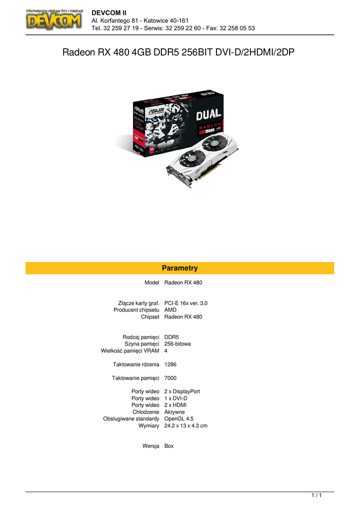 DEVCOM II Al. Korfantego 81 - Katowice 40-161 Tel. 32 259 27 19 - Serwis: 32 259 22 60 - Fax: 32 258 05 53 Radeon RX 480 4GB DDR5 256BIT DVI-D/2HDMI/2DP Parametry Model Radeon RX 480 Złącze karty graf. PCI-E 16x ver. 3.0 Producent chipsetu AMD Chipset Radeon RX 480 Rodzaj pamięci DDR5 Szyna pamięci 256-bitowa Wielkość pamięci VRAM 4 Taktowanie rdzenia 1286 Taktowanie pamięci 7000 Porty wideo Porty wideo Porty wideo Chłodzenie Obsługiwane standardy Wymiary 2 x DisplayPort 1 x DVI-D 2 x HDMI Aktywne OpenGL 4.5 24.2 x 13 x 4.3 cm Wersja Box 1/1 Powered by TCPDF (www.tcpdf.org)