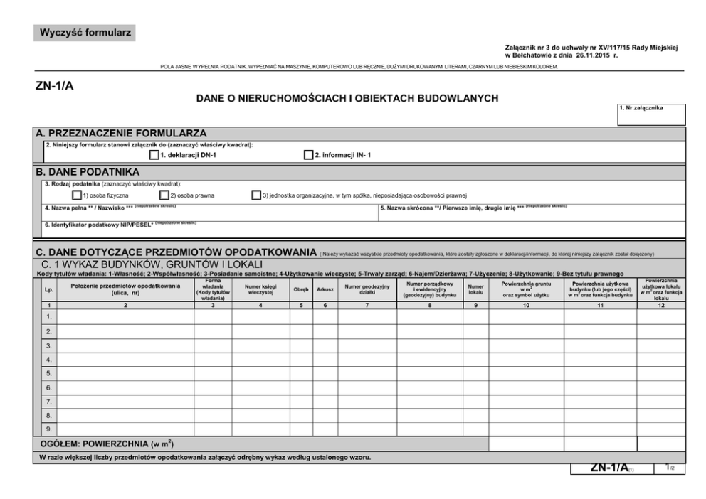Wyczyść formularz Załącznik nr 3 do uchwały nr XV/117/15 Rady Miejskiej w Bełchatowie z dnia 26.11.2015 r. POLA JASNE WYPEŁNIA PODATNIK. WYPEŁNIAĆ NA MASZYNIE, KOMPUTEROWO LUB RĘCZNIE, DUŻYMI DRUKOWANYMI LITERAMI, CZARNYM LUB NIEBIESKIM KOLOREM. ZN-1/A DANE O NIERUCHOMOŚCIACH I OBIEKTACH BUDOWLANYCH 1. Nr załącznika A. PRZEZNACZENIE FORMULARZA 2. Niniejszy formularz stanowi załącznik do (zaznaczyć właściwy kwadrat): 1. deklaracji DN-1 2. informacji IN- 1 B. DANE PODATNIKA 3. Rodzaj podatnika (zaznaczyć właściwy kwadrat): 1) osoba fizyczna 4. Nazwa pełna ** / Nazwisko *** 3) jednostka organizacyjna, w tym spółka, nieposiadająca osobowości prawnej 2) osoba prawna (niepotrzebne skreślić) 6. Identyfikator podatkowy NIP/PESEL* 5. Nazwa skrócona **/ Pierwsze imię, drugie imię *** (niepotrzebne skreślić) (niepotrzebne skreślić) C. DANE DOTYCZĄCE PRZEDMIOTÓW OPODATKOWANIA ( Należy wykazać wszystkie przedmioty opodatkowania, które zostały zgłoszone w deklaracji/informacji, do której niniejszy załącznik został dołączony) C. 1 WYKAZ BUDYNKÓW, GRUNTÓW I LOKALI Kody tytułów władania: 1-Własność; 2-Współwłasność; 3-Posiadanie samoistne; 4-Użytkowanie wieczyste; 5-Trwały zarząd; 6-Najem/Dzierżawa; 7-Użyczenie; 8-Użytkowanie; 9-Bez tytułu prawnego Lp. Położenie przedmiotów opodatkowania (ulica, nr) Forma władania (Kody tytułów władania) Numer księgi wieczystej Obręb Arkusz Numer geodezyjny działki Numer porządkowy i ewidencyjny (geodezyjny) budynku Numer lokalu Powierzchnia gruntu w m2 oraz symbol użytku Powierzchnia użytkowa budynku (lub jego części) w m2 oraz funkcja budynku Powierzchnia użytkowa lokalu w m2 oraz funkcja lokalu 1 2 3 4 5 6 7 8 9 10 11 12 1. 2. 3. 4. 5. 6. 7. 8. 9. OGÓŁEM: POWIERZCHNIA (w m2) W razie większej liczby przedmiotów opodatkowania załączyć odrębny wykaz według ustalonego wzoru. ZN-1/A (1) 1/2 POLA JASNE WYPEŁNIA PODATNIK. WYPEŁNIAĆ NA MASZYNIE, KOMPUTEROWO LUB RĘCZNIE, DUŻYMI DRUKOWANYMI LITERAMI, CZARNYM LUB NIEBIESKIM KOLOREM. C.2. WYKAZ BUDOWLI Lp. Położenie przedmiotów opodatkowania (ulica, nr) 1 2 Obręb Numer geodezyjny działki 3 4 Numer inwentarzowy budowli (jeżeli jest nadany) 5 Nazwa budowli 6 Wartość w zł (wartość określona na podstawie art. 4 ust. 1 pkt 3 i ust. 3-6 ustawy o podatkach i opłatach lokalnych) 7 1. 2.. 3. 4. 5. 6. 7. 8. 9. 10. 11. 12. 13. 14. RAZEM (w pełnych zł) W razie większej liczby budowli załączyć odrębny wykaz według ustalonego wzoru. * Należy wpisać odpowiednio: 1) numer PESEL - w przypadku podatników będących osobami fizycznymi objętymi rejestrem PESEL, nieprowadzących działalności gospodarczej lub niebędących zarejestrowanymi podatnikami podatku od towarów i usług; 2) NIP - w przypadku pozostałych podmiotów podlegających obowiązkowi ewidencyjnemu. ** dotyczy podatnika niebędącego osobą fizyczną *** dotyczy podatnika będącego osobą fizyczną Data wypełnienia (dzień - miesiąc - rok) ZN-1/A 2/2 __ __ ____ .................................................................................................................. Podpis podatnika / osoby reprezentującej podatnika