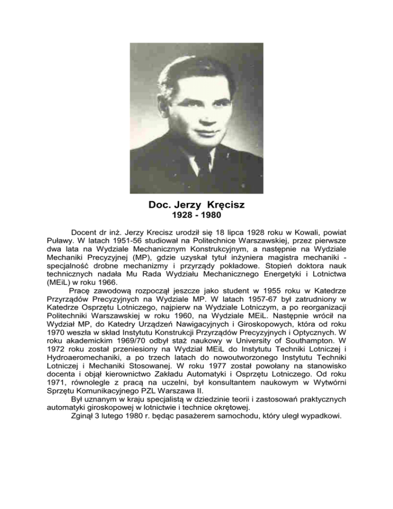 Doc. Jerzy Kręcisz 1928 - 1980 Docent dr inż. Jerzy Krecisz urodził się 18 lipca 1928 roku w Kowali, powiat Puławy. W latach 1951-56 studiował na Politechnice Warszawskiej, przez pierwsze dwa lata na Wydziale Mechanicznym Konstrukcyjnym, a następnie na Wydziale Mechaniki Precyzyjnej (MP), gdzie uzyskał tytuł inżyniera magistra mechaniki specjalność drobne mechanizmy i przyrządy pokładowe. Stopień doktora nauk technicznych nadała Mu Rada Wydziału Mechanicznego Energetyki i Lotnictwa (MEiL) w roku 1966. Pracę zawodową rozpoczął jeszcze jako student w 1955 roku w Katedrze Przyrządów Precyzyjnych na Wydziale MP. W latach 1957-67 był zatrudniony w Katedrze Osprzętu Lotniczego, najpierw na Wydziale Lotniczym, a po reorganizacji Politechniki Warszawskiej w roku 1960, na Wydziale MEiL. Następnie wrócił na Wydział MP, do Katedry Urządzeń Nawigacyjnych i Giroskopowych, która od roku 1970 weszła w skład Instytutu Konstrukcji Przyrządów Precyzyjnych i Optycznych. W roku akademickim 1969/70 odbył staż naukowy w University of Southampton. W 1972 roku został przeniesiony na Wydział MEiL do Instytutu Techniki Lotniczej i Hydroaeromechaniki, a po trzech latach do nowoutworzonego Instytutu Techniki Lotniczej i Mechaniki Stosowanej. W roku 1977 został powołany na stanowisko docenta i objął kierownictwo Zakładu Automatyki i Osprzętu Lotniczego. Od roku 1971, równolegle z pracą na uczelni, był konsultantem naukowym w Wytwórni Sprzętu Komunikacyjnego PZL Warszawa II. Był uznanym w kraju specjalistą w dziedzinie teorii i zastosowań praktycznych automatyki giroskopowej w lotnictwie i technice okrętowej. Zginął 3 lutego 1980 r. będąc pasażerem samochodu, który uległ wypadkowi.