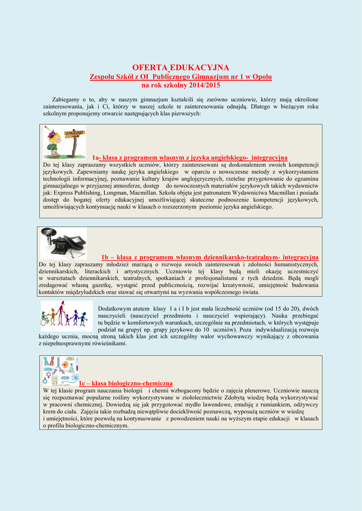 OFERTA EDUKACYJNA Zespołu Szkół z OI Publicznego Gimnazjum nr 1 w Opolu na rok szkolny 2014/2015 Zabiegamy o to, aby w naszym gimnazjum kształcili się zarówno uczniowie, którzy mają określone zainteresowania, jak i Ci, którzy w naszej szkole te zainteresowania odnajdą. Dlatego w bieżącym roku szkolnym proponujemy otwarcie następujących klas pierwszych: 1a- klasa z programem własnym z języka angielskiego- integracyjna Do tej klasy zapraszamy wszystkich uczniów, którzy zainteresowani są doskonaleniem swoich kompetencji językowych. Zapewniamy naukę języka angielskiego w oparciu o nowoczesne metody z wykorzystaniem technologii informacyjnej, poznawanie kultury krajów anglojęzycznych, rzetelne przygotowanie do egzaminu gimnazjalnego w przyjaznej atmosferze, dostęp do nowoczesnych materiałów językowych takich wydawnictw jak: Express Publishing, Longman, Macmillan. Szkoła objęta jest patronatem Wydawnictwa Macmillan i posiada dostęp do bogatej oferty edukacyjnej umożliwiającej skuteczne podnoszenie kompetencji językowych, umożliwiających kontynuację nauki w klasach o rozszerzonym poziomie języka angielskiego. 1b – klasa z programem własnym dziennikarsko-teatralnym- integracyjna Do tej klasy zapraszamy młodzież marzącą o rozwoju swoich zainteresowań i zdolności humanistycznych, dziennikarskich, literackich i artystycznych. Uczniowie tej klasy będą mieli okazję uczestniczyć w warsztatach dziennikarskich, teatralnych, spotkaniach z profesjonalistami z tych dziedzin. Będą mogli zredagować własną gazetkę, wystąpić przed publicznością, rozwijać kreatywność, umiejętność budowania kontaktów międzyludzkich oraz stawać się otwartymi na wyzwania współczesnego świata. Dodatkowym atutem klasy I a i I b jest mała liczebność uczniów (od 15 do 20), dwóch nauczycieli (nauczyciel przedmiotu i nauczyciel wspierający). Nauka przebiegać tu będzie w komfortowych warunkach, szczególnie na przedmiotach, w których występuje podział na grupy( np. grupy językowe do 10 uczniów). Poza indywidualizacją rozwoju każdego ucznia, mocną stroną takich klas jest ich szczególny walor wychowawczy wynikający z obcowania z niepełnosprawnymi rówieśnikami. 1c – klasa biologiczno-chemiczna W tej klasie program nauczania biologii i chemii wzbogacony będzie o zajęcia plenerowe. Uczniowie nauczą się rozpoznawać popularne rośliny wykorzystywane w ziołolecznictwie Zdobytą wiedzę będą wykorzystywać w pracowni chemicznej. Dowiedzą się jak przygotować mydło lawendowe, emulsję z rumiankiem, odżywczy krem do ciała. Zajęcia takie rozbudzą niewątpliwie dociekliwość poznawczą, wyposażą uczniów w wiedzę i umiejętności, które pozwolą na kontynuowanie z powodzeniem nauki na wyższym etapie edukacji w klasach o profilu biologiczno-chemicznym. 1d – klasa z programem własnym z matematyki i innowacją z informatyki W tym oddziale obowiązywać będzie zmodyfikowany program z matematyki ukierunkowany na rozwiązywanie zadań nietypowych, który na pewno zachęci młodzież do kreatywnego myślenia i rozwijania swoich zainteresowań w tym kierunku. Ciekawe projekty realizowane na lekcjach matematyki ukażą jej wszechobecność w różnych dziedzinach nauki i w życiu codziennym. Dodatkowo w tej klasie proponujemy innowację z informatyki uwzględniającą dodatkowe lekcje z modelowania 3D w oparciu o program Bender. Uczniowie zdobędą wiedzę na temat tworzenia obiektów w przestrzeni. Nabyte umiejętności pozwolą tworzyć w programie praktycznie wszystko, od projektu wizualizacji wnętrza, do postaci z gier komputerowych. 1e – klasa sportowa - grupa ze szkoleniem sportowym z pływania Jesteśmy jedyną szkołą w Opolu, która posiada własną pływalnię, więc umożliwiamy naszym uczniom doskonalenie umiejętności pływania. Szkolenie sportowe prowadzone jest przez trenerów pływania w grupie podstawowej i zaawansowanej. Współpracujemy z Uczniowskim Klubem Sportowym „5 plus 1 Opole” wspólnie organizując zawody i obozy pływackie w celu podniesienia sprawności fizycznej naszych uczniów oraz Politechniką Opolską. Szkolenie sportowe z pływania jest prowadzone w wymiarze 10 godzin tygodniowo. Grupa ze szkoleniem sportowym z piłki nożnej Zajęcia w tej popularnej dziedzinie sportu prowadzone będą w wymiarze 6 godzin tygodniowo, w formie zajęć ponadprogramowych doskonalących umiejętności techniczne i taktyczne dostosowane do wieku i płci, uwzględniających udział w nich chłopców i dziewcząt. Bardzo dobre warunki umożliwiające uprawianie tej dziedziny oraz doświadczona kadra nauczycieli wychowania fizycznego gwarantują przyszłym uczniom rozwijanie uzdolnień i zainteresowań piłką nożną oraz odnoszenie sukcesów na tym polu. Powyższe klasy z rozszerzonymi programami będą tworzone tylko wtedy, gdy liczba kandydatów umożliwi uruchomienie tych oddziału. Proponujemy obowiązkowe dwa języki obce: język angielski-kontynuacja język niemiecki, francuski - do wyboru