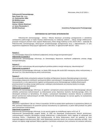 Warszawa, dnia 21.07.2015 r. Pełnomocnik Zamawiającego New Power Sp. z o.o. Ul. Chełmżyńska 180a 04-464Warszawa Reprezentujący Gminę i Miasto Stawiszyn ul. Szosa Pleszewska 3 62-820 Stawiszyn Uczestnicy Postępowania Przetargowego ODPOWIEDZI NA ZAPYTANIA WYKONAWCÓW Pełnomocnik Zamawiającego - Gminy i Miasta Stawiszyn prowadząc postępowanie o udzieleniu zamówienia publicznego w trybie licytacji elektronicznej na realizację zadania: „ Zakup energii elektrycznej” przesyła niniejszym pismem treść zapytań Wykonawcy, które drogą mailową w dniu 20.07.2015 r. wpłynęły do Pełnomocnika Zamawiającego, dotyczących przedmiotowego postępowania wraz z odpowiedziami, w celu wyjaśnienia wątpliwości dotyczących ogłoszenia L-236-2015, nr ogłoszenia BZP 181232 - 2015; Pytanie 1 Czy Zamawiający dopuszcza możliwość podpisania umowy drogą korespondencyjną? Odpowiedź na pytanie 1 Pełnomocnik Zamawiającego informuje, że Zamawiający dopuszcza możliwość podpisania umowy drogą korespondencyjną Pytanie 2 Jaki jest okres rozliczeniowy dla poszczególnych punktów poboru energii miesięczny, dwumiesięczny? Odpowiedź na pytanie 2 Pełnomocnik Zamawiającego informuje, że lokaly OSD stosuje dla taryfy B23 miesięczny okres rozliczeniowy, a dla taryf C1x i G1x dwumiesięczny okres rozliczeniowy. Pytanie 3 Czy w przypadku braku otrzymania wskazań liczników od Operatora Systemu Dystrybucyjnego w terminie Zamawiający dopuszcza możliwość wystawienia faktur szacunkowych ( korygowanych po otrzymaniu faktur rzeczywistych), w celu zapewnienia ciągłości przekazywania przez Zamawiającego środków finansowych przeznaczonych na zakup energii elektrycznej i uniknięcia skumulowania się znacznej kwoty za energię elektryczną na rzecz Sprzedawcy? Odpowiedź na pytanie 3 Pełnomocnik Zamawiającego informuje, że zgodnie z przepisami prawa powszechnie obowiązującego odczyty układów pomiarowo-rozliczeniowych są dokonywane przez Operatora Systemu Dystrybucyjnego, który ma obowiązek przekazać je Sprzedawcy. W związku z powyższym Sprzedawca wystawia fakturę na podstawie danych pomiarowo-rozliczeniowych od OSD. Pełnomocnik Zamawiającego nie wyraża zgodny na wystawianie faktur szacunkowych. Pytanie 4 Wnosimy o wykreślenie z §6 ust. 9 kary w wysokości 10 PLN za każdy dzień opóźnienia w wystawieniu faktury za PPE, ponieważ Wykonawca nie powinien ponosić konsekwencji za opóźnienie, w jakim OSD przekaże mu pełne dane pomiarowo-rozliczeniowe. Odpowiedź na pytanie 4 Pełnomocnik Zamawiającego informuje, że nie wyraża zgody na modyfikację zapisu w § 6 ust. 9. Pełnomocnik Zamawiajacego pragnie dodać, że OSD ma obowiązek przekazywania danych pomiaroworozliczeniowych nowemu sprzedawcy energii elektrycznej, a dokumentem, który reguluje te obowiązki jest Instrukcja Ruchu i Eksploatacji Sieci Dystrybucyjnej, na którą Wykonawca może się powołać w razie nieprzestrzegania instrukcji przez OSD. Jeżeli Wykonawca pomimo starań nie otrzyma odczytów od OSD, i tym samym nie będzie mógł wystawić faktury zgodnie z terminem umownym, kara umowna nie zostanie naliczona. 1 Wykonawca będzie jednak zobowiązany udowodnić na piśmie Zamawiającemu, iż nie mógł pozyskać danych i rzeczywiście nie wystawił faktury nie z własnej winy. W związku z powyższym zapis § 6 ust. 9 Projektu umowy pozostaje bez zmian. Pytanie 5 Wnosimy o wykreślenie z projektu umowy z §11 ust. 3, ponieważ wszystkie niezbędne dane do przeprowadzenia procesu zmiany sprzedawcy powinny być podane przez Zamawiającego. Odpowiedź na pytanie 5 Pełnomocnik Zamawiającego informuje, że na podstawie § 11 pkt. 3 Wykonawca nie jest zobligowany do pozyskania danych niezbędnych do zgłoszenia zmiany sprzedawcy, gdyż otrzyma je od Pełnomocnika Zamawiającego. Wykonawca, aby skutecznie przeprowadzić zmianę sprzedawcy zobowiązany jest natomiast do kontaktu z OSD chociażby w kwestii negatywnych weryfikacji punktów poboru. Mając wiedze, iż w obrębie któregokolwiek punktu poboru występują negatywne weryfikacje, Wykonawca zobligowany jest do niezwłocznego przekazania takiej informacji Zamawiającemu, aby ten mógł na bieżąco wyjaśniać nieprawidłowości. Zapis §11 ust. 3 pozostaje bez zmian. /-/Ewa Pacek Pełnomocnik Zamawiającego 2