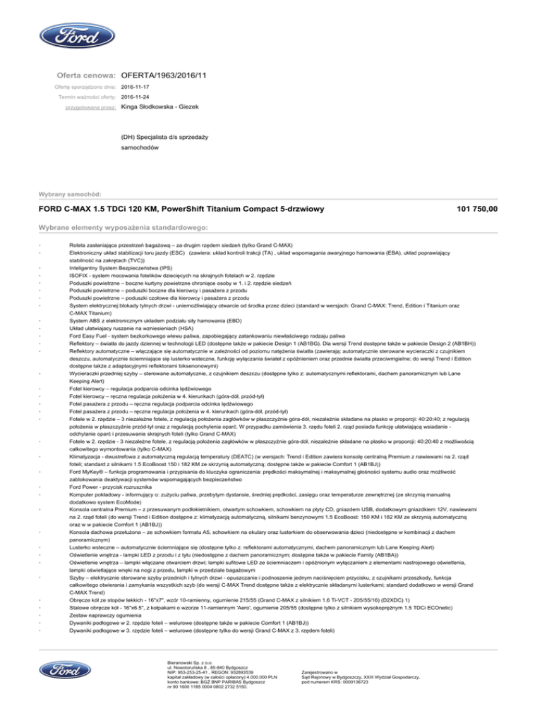 Oferta cenowa: OFERTA/1963/2016/11 Ofertę sporządzono dnia: 2016-11-17 Termin ważności oferty: 2016-11-24 przygotowana przez: Kinga Słodkowska - Giezek (DH) Specjalista d/s sprzedaży samochodów Wybrany samochód: FORD C-MAX 1.5 TDCi 120 KM, PowerShift Titanium Compact 5-drzwiowy 101 750,00 Wybrane elementy wyposażenia standardowego: * * Roleta zasłaniająca przestrzeń bagażową – za drugim rzędem siedzeń (tylko Grand C-MAX) Elektroniczny układ stabilizacji toru jazdy (ESC) (zawiera: układ kontroli trakcji (TA) , układ wspomagania awaryjnego hamowania (EBA), układ poprawiający stabilność na zakrętach (TVC)) * Inteligentny System Bezpieczeństwa (IPS) * ISOFIX - system mocowania fotelików dziecięcych na skrajnych fotelach w 2. rzędzie * Poduszki powietrzne – boczne kurtyny powietrzne chroniące osoby w 1. i 2. rzędzie siedzeń * Poduszki powietrzne – poduszki boczne dla kierowcy i pasażera z przodu * Poduszki powietrzne – poduszki czołowe dla kierowcy i pasażera z przodu * System elektrycznej blokady tylnych drzwi - uniemożliwiający otwarcie od środka przez dzieci (standard w wersjach: Grand C-MAX: Trend, Edition i Titanium oraz C-MAX Titanium) * System ABS z elektronicznym układem podziału siły hamowania (EBD) * Układ ułatwiajacy ruszanie na wzniesieniach (HSA) * Ford Easy Fuel - system bezkorkowego wlewu paliwa, zapobiegający zatankowaniu niewłaściwego rodzaju paliwa * Reflektory – światła do jazdy dziennej w technologii LED (dostępne także w pakiecie Design 1 (AB1BG). Dla wersji Trend dostępne także w pakiecie Design 2 (AB1BH)) * Reflektory automatyczne – włączające się automatycznie w zależności od poziomu natężenia światła (zawierają: automatycznie sterowane wycieraczki z czujnikiem deszczu, automatycznie ściemniające się lusterko wsteczne, funkcję wyłączania świateł z opóźnieniem oraz przednie światła przeciwmgielne; do wersji Trend i Edition dostępne także z adaptacyjnymi reflektorami biksenonowymi) * Wycieraczki przedniej szyby – sterowane automatycznie, z czujnikiem deszczu (dostępne tylko z: automatycznymi reflektorami, dachem panoramicznym lub Lane Keeping Alert) * Fotel kierowcy – regulacja podparcia odcinka lędźwiowego * Fotel kierowcy – ręczna regulacja położenia w 4. kierunkach (góra-dół, przód-tył) * Fotel pasażera z przodu – ręczna regulacja podparcia odcinka lędźwiowego * Fotel pasażera z przodu – ręczna regulacja położenia w 4. kierunkach (góra-dół, przód-tył) * Fotele w 2. rzędzie – 3 niezależne fotele, z regulacją położenia zagłówków w płaszczyźnie góra-dół, niezależnie składane na płasko w proporcji: 40:20:40; z regulacją położenia w płaszczyźnie przód-tył oraz z regulacją pochylenia oparć. W przypadku zamówienia 3. rzędu foteli 2. rząd posiada funkcję ułatwiającą wsiadanie odchylanie oparć i przesuwanie skrajnych foteli (tylko Grand C-MAX) * Fotele w 2. rzędzie - 3 niezależne fotele, z regulacją położenia zagłówków w płaszczyźnie góra-dół, niezależnie składane na płasko w proporcji: 40:20:40 z możliwością całkowitego wymontowania (tylko C-MAX) * Klimatyzacja - dwustrefowa z automatyczną regulacją temperatury (DEATC) (w wersjach: Trend i Edition zawiera konsolę centralną Premium z nawiewami na 2. rząd foteli; standard z silnikami 1.5 EcoBoost 150 i 182 KM ze skrzynią automatyczną; dostępne także w pakiecie Comfort 1 (AB1BJ)) * Ford MyKey® – funkcja programowania i przypisania do kluczyka ograniczenia: prędkości maksymalnej i maksymalnej głośności systemu audio oraz możliwość zablokowania deaktywacji systemów wspomagających bezpieczeństwo * Ford Power - przycisk rozrusznika * Komputer pokładowy - informujący o: zużyciu paliwa, przebytym dystansie, średniej prędkości, zasięgu oraz temperaturze zewnętrznej (ze skrzynią manualną * Konsola centralna Premium – z przesuwanym podłokietnikiem, otwartym schowkiem, schowkiem na płyty CD, gniazdem USB, dodatkowym gniazdkiem 12V, nawiewami dodatkowo system EcoMode) na 2. rząd foteli (do wersji Trend i Edition dostępne z: klimatyzacją automatyczną, silnikami benzynowymi 1.5 EcoBoost: 150 KM i 182 KM ze skrzynią automatyczną oraz w w pakiecie Comfort 1 (AB1BJ)) * Konsola dachowa przełużona – ze schowkiem formatu A5, schowkiem na okulary oraz lusterkiem do obserwowania dzieci (niedostępne w kombinacji z dachem panoramicznym) * Lusterko wsteczne – automatycznie ściemniające się (dostępne tylko z: reflektorami automatycznymi, dachem panoramicznym lub Lane Keeping Alert) * Oświetlenie wnętrza - lampki LED z przodu i z tyłu (niedostępne z dachem panoramicznym; dostępne także w pakiecie Family (AB1BA)) * Oświetlenie wnętrza – lampki włączane otwarciem drzwi; lampki sufitowe LED ze ściemniaczem i opóźnionym wyłączaniem z elementami nastrojowego oświetlenia, * Szyby – elektrycznie sterowane szyby przednich i tylnych drzwi - opuszczanie i podnoszenie jednym naciśnięciem przycisku, z czujnikami przeszkody, funkcja lampki oświetlające wnęki na nogi z przodu, lampki w przedziale bagażowym całkowitego otwierania i zamykania wszystkich szyb (do wersji C-MAX Trend dostępne także z elektrycznie składanymi lusterkami; standard dodatkowo w wersji Grand C-MAX Trend) * Obręcze kół ze stopów lekkich - 16"x7", wzór 10-ramienny, ogumienie 215/55 (Grand C-MAX z silnikiem 1.6 Ti-VCT - 205/55/16) (D2XDC) 1) * Stalowe obręcze kół - 16"x6.5", z kołpakami o wzorze 11-ramiennym 'Aero', ogumienie 205/55 (dostępne tylko z silnikiem wysokoprężnym 1.5 TDCi ECOnetic) * Zestaw naprawczy ogumienia * Dywaniki podłogowe w 2. rzędzie foteli – welurowe (dostępne także w pakiecie Comfort 1 (AB1BJ)) * Dywaniki podłogowe w 3. rzędzie foteli – welurowe (dostępne tylko do wersji Grand C-MAX z 3. rzędem foteli) Bieranowski Sp. z o.o. ul. Nowotoruńska 8 , 85-840 Bydgoszcz NIP: 953-253-25-41 , REGON: 93289