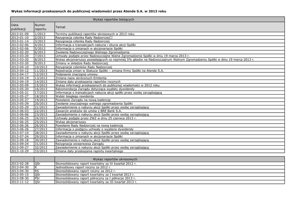 Wykaz informacji przekazanych do publicznej wiadomości przez Atende S.A. w 2013 roku Wykaz raportów bieżących Data publikacji Numer raportu Temat 2013-01-09 2013-01-10 2013-01-14 2013-02-06 2013-02-06 2013-02-20 2013-03-20 2013-03-20 2013-03-20 2013-04-10 2013-04-12 2013-04-17 2013-04-19 2013-04-19 2013-05-09 2013-05-20 2013-05-21 2013-05-27 2013-05-27 2013-05-29 2013-05-29 2013-06-03 2013-06-06 2013-06-25 2013-06-25 2013-06-26 2013-06-26 2013-07-10 2013-07-24 2013-09-18 2013-09-24 2013-09-27 2013-10-29 1/2013 2/2013 3/2013 4/2013 5/2013 6/2013 7/2013 8/2013 9/2013 10/2013 11/2013 12/2013 13/2013 14/2013 15/2013 16/2013 17/2013 18/2013 19/2013 20/2013 21/2013 22/2013 23/2013 24/2013 25/2013 26/2013 27/2013 28/2013 29/2013 30/2013 31/2013 32/2013 33/2013 Terminy publikacji raportów okresowych w 2013 roku Rezygnacja członka Rady Nadzorczej Rezygnacja członka Rady Nadzorczej Informacja o transakcjach nabycia i zbycia akcji Spółki Informacja o zmianach w akcjonariacie Spółki Zwołanie Nadzwyczajnego Walnego Zgromadzenia Uchwały podjęte przez Nadzwyczajne Walne Zgromadzenie Spółki w dniu 19 marca 2013 r. Wykaz akcjonariuszy posiadających co najmniej 5% głosów na Nadzwyczajnym Walnym Zgromadzeniu Spółki w dniu 19 marca 2013 r. Zmiany w składzie Rady Nadzorczej Rezygnacje członków Rady Nadzorczej Rejestracja zmian w Statucie Spółki – zmiana firmy Spółki na Atende S.A. Podpisanie znaczącej umowy Zmiana nazw skróconych Emitenta Zmiana daty przekazania raportów rocznych Wykaz informacji przekazanych do publicznej wiadomości w 2012 roku Rekomendacja Zarządu dotycząca wypłaty dywidendy Informacja o transakcjach nabycia akcji spółki przez osobę zarządzającą Wybór biegłego rewidenta Powołanie Zarządu na nową kadencję Zwołanie zwyczajnego walnego zgromadzenia Spółki Zawiadomienie o nabyciu akcji Spółki przez osobę zarządzającą Zawarcie aneksów do umów z BRE Bank S.A. Zawiadomienie o nabyciu akcji Spółki przez osobę zarządzającą Uchwały podjęte przez ZWZ w dniu 25 czerwca 2013 r. Wykaz akcjonariuszy Powołanie Rady Nadzorczej na nową kadencję Informacja o podjęciu uchwały o wypłacie dywidendy Zawiadomienie o nabyciu akcji Spółki przez osobę zarządzającą Informacja o zmianach w akcjonariacie Spółki Zawiadomienie o nabyciu akcji Spółki przez osobę zarządzającą Rezygnacja wiceprezesa Zarządu Zawiadomienie o nabyciu akcji Spółki przez osobę zarządzającą Zmiana daty przekazania raportu kwartalnego 2013-02-28 2013-04-30 2013-04-30 2013-05-15 2013-08-30 2013-11-12 QSr R RS QSr PSr QSr Skonsolidowany raport kwartalny za IV kwartał 2012 r. Jednostkowy raport roczny za 2012 r. Skonsolidowany raport roczny za 2012 r. Skonsolidowany raport kwartalny za I kwartał 2013 r. Skonsolidowany raport półroczny za I półrocze 2013 r. Skonsolidowany raport kwartalny za III kwartał 2013 r. Wykaz raportów okresowych