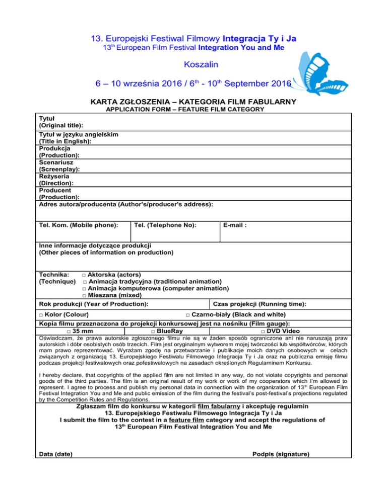 13. Europejski Festiwal Filmowy Integracja Ty i Ja 13th European Film Festival Integration You and Me Koszalin 6 – 10 września 2016 / 6th - 10th September 2016 KARTA ZGŁOSZENIA – KATEGORIA FILM FABULARNY APPLICATION FORM – FEATURE FILM CATEGORY Tytuł (Original title): Tytuł w języku angielskim (Title in English): Produkcja (Production): Scenariusz (Screenplay): Reżyseria (Direction): Producent (Production): Adres autora/producenta (Author’s/producer’s address): Tel. Kom. (Mobile phone): Tel. (Telephone No): E-mail : Inne informacje dotyczące produkcji (Other pieces of information on production) Technika: □ Aktorska (actors) (Technique) □ Animacja tradycyjna (traditional animation) □ Animacja komputerowa (computer animation) □ Mieszana (mixed) Rok produkcji (Year of Production): Czas projekcji (Running time): □ Kolor (Colour) □ Czarno-biały (Black and white) Kopia filmu przeznaczona do projekcji konkursowej jest na nośniku (Film gauge): □ 35 mm □ BlueRay □ DVD Video Oświadczam, że prawa autorskie zgłoszonego filmu nie są w żaden sposób ograniczone ani nie naruszają praw autorskich i dóbr osobistych osób trzecich. Film jest oryginalnym wytworem mojej twórczości lub współtwórców, których mam prawo reprezentować. Wyrażam zgodę na przetwarzanie i publikacje moich danych osobowych w celach związanych z organizacją 13. Europejskiego Festiwalu Filmowego Integracja Ty i Ja oraz na publiczna emisję filmu podczas projekcji festiwalowych oraz pofestiwalowych na zasadach określonych Regulaminem Konkursu. I hereby declare, that copyrights of the applied film are not limited in any way, do not violate copyrights and personal goods of the third parties. The film is an original result of my work or work of my cooperators which I’m allowed to represent. I agree to process and publish my personal data in connection with the organization of 13 th European Film Festival Integration You and Me and public emission of the film during the festival’s post-festival’s projections regulated by the Competition Rules and Regulations. Zgłaszam film do konkursu w kategorii film fabularny i akceptuję regulamin 13. Europejskiego Festiwalu Filmowego Integracja Ty i Ja I submit the film to the contest in a feature film category and accept the regulations of 13th European Film Festival Integration You and Me Data (date) Podpis (signature)