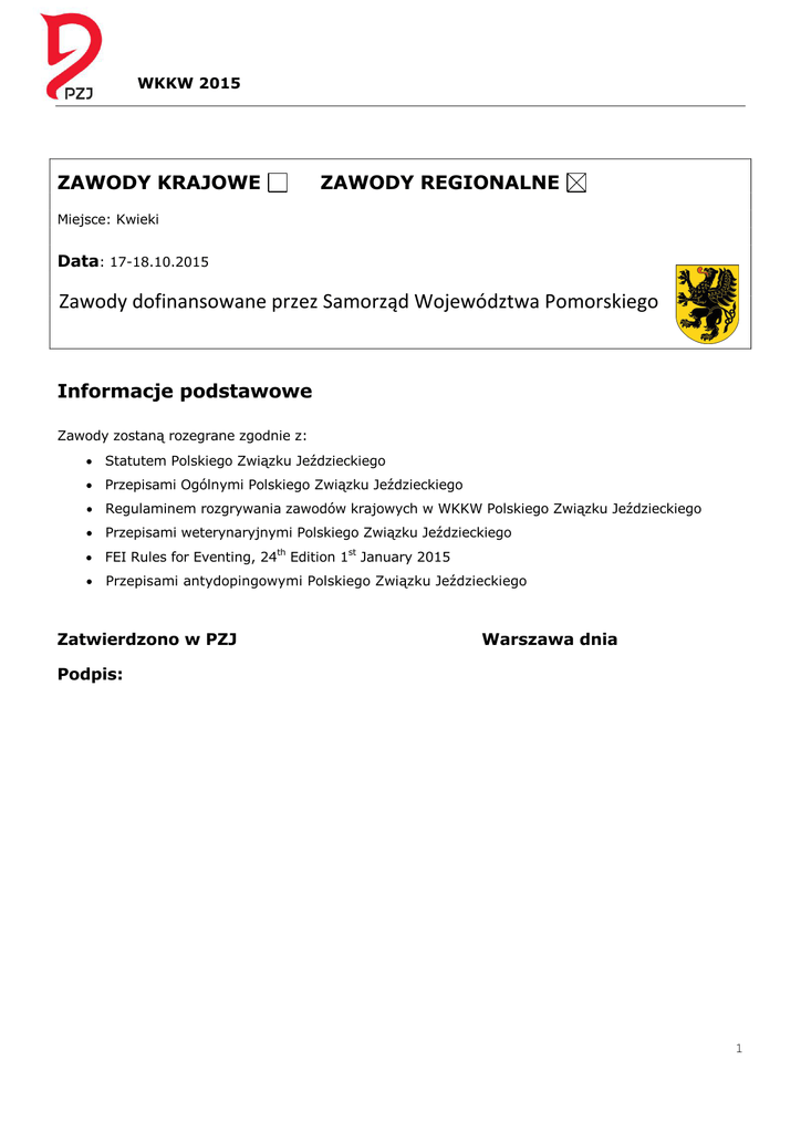WKKW 2015 ZAWODY KRAJOWE ZAWODY REGIONALNE Miejsce: Kwieki Data: 17-18.10.2015 Zawody dofinansowane przez Samorząd Województwa Pomorskiego Informacje podstawowe Zawody zostaną rozegrane zgodnie z: Statutem Polskiego Związku Jeździeckiego Przepisami Ogólnymi Polskiego Związku Jeździeckiego Regulaminem rozgrywania zawodów krajowych w WKKW Polskiego Związku Jeździeckiego Przepisami weterynaryjnymi Polskiego Związku Jeździeckiego FEI Rules for Eventing, 24th Edition 1st January 2015 Przepisami antydopingowymi Polskiego Związku Jeździeckiego Zatwierdzono w PZJ Warszawa dnia Podpis: 1 WKKW 2015 I. Sprawy Organizacyjne 1. Typ Zawodów Klasy: CNC 3* CNC/2* CNC/1* CNC/ P CNC/ L CNC/ LL Kuce PUCHAR POLSKI: ELIMINACJE MISTRZOSTWA POLSKI Kategoria: Seniorzy MISTRZOSTWA REGIONALNE Młodzi Jeźdźcy Data: 17-18.10.2015 Miejsce : Kwieki Region : Pomorskie FINAŁ Juniorzy Juniorzy Młodsi Młodzicy 2. Organizator (kompletny adres) Nazwa: Kaszubskie Stowarzyszenie Promowania Sportów Konnych Adres: Sienica 22 Kod pocztowy: 89-642 Rytel Telefon: 502642869 Email : [email protected] Internet: www.sportykonne.pl Fax : 3. Komitet Organizacyjny Przewodniczący: Zbigniew Sikorski Dyrektor Zawodów: Małgorzata Zdunek Biuro Zawodów: Tadeusz Helak Rzecznik Prasowy: Dyrektor Techniczny: Szef Stajni: Piotr Leper 4. Dane kontaktowe na miejscu zawodów: Adres: Sienica 22 Tel.: Telefon kom.: 502 642 869 2 WKKW 2015 II. Osoby oficjalne (zgodnie z załącznikiem nr.1 do Regulaminu WKKW 2014) 1. Komisja sędziowska Lp. Imię Nazwisko Funkcja KLASA 1. Agata Jarzycka-Stefańska Sędzia Główny zawodów LL,L,P 2. Małgorzata Chajęcka Sędzia LL,L,P 3. Paweł Sojecki Sędzia LL,L,P 4. 5. 6. 2. Delegat Techniczny 1. Delegat Techniczny Imię Nazwisko: 2. Tomasz Kowala Asystent Delegata Technicznego Imię Nazwisko: 3. Gospodarz Toru – próba terenowa Imię Nazwisko: Bogusław Jarecki Asystent Gospodarza Toru – próba terenowa Imię Nazwisko: 4. Gospodarz Toru – próba skoków Imię Nazwisko: 5. Bogusław Jarecki Komisarze Szef komisarzy Imię Nazwisko: Małgorzata Kasińska Komisarze: Imię Nazwisko: Imię Nazwisko: Imię Nazwisko: 6. Delegat Weterynaryjny PZJ Imię Nazwisko: 3 WKKW 2015 7. Lekarz weterynarii Zawodów Imię Nazwisko: Grzegorz Chajęcki Email: Adres: Tel. : 601 652 703 Fax : 8. Lekarz medycyny zawodów Imię Nazwisko: Mag-Med 9. Kowal Imię Nazwisko: 10. Komisja Odwoławcza (tylko na MP, Finał PP, Finał OOM) Imię Nazwisko: Imię Nazwisko: Imię Nazwisko: III. 1. Warunki Techniczne Program zawodów KLASA LL KLASA L KLASA P Data/Godz. Data/Godz. Data/Godz. Otwarte trasy krosu 16.10. 17:00 16.10. 17:00 16.10. 17:00 1szy Przegląd Koni - - - 1szy Start Ujeżdzenie 17.10. 9:00 18.10 9:00 17.10. 11:00 18.10 11:00 17.10. 12:30 18.10 12:30 3ci Przegląd Koni - - - 1szy Start Skoki 17.10 9:30 18.10 14:30 17:10 11:30 18.10 14:30 17.10 13:00 18.10 14:30 1szy Start kros Wręczanie nagród KLASA KLASA Data/Godz. Data/Godz. Program zawodów moze ulec zmianie gdy będzie znana ostateczna liczba zawodników. 4 WKKW 2015 2. Ujeżdżenie FEI 2015 3* A FEI 2015 3* B FEI 2015 2* A FEI 2015 2* B FEI 2015 1* A FEI 2015 1* B P,-*A, LL,L zgodnie z regulaminem WKKW 3. PRÓBA TERENOWA (klasy nie rozgrywane należy usunąć ) KLASA LL/ Mistrzostwa Województwa Pomorskiego JMł. duże konie/kuce odcinek Typ podłoża: Długość : Tempo Ilośc skoków D Trawa , piach 1600-2000 Max: 450m/min 12 - 16 KLASA L/ Mistrzostwa Województwa Pomorskiego Juiorów Odcinek Typ podłoża: Długość : Tempo Ilośc skoków D Trawa , piach 1600-2500 470-500 m/min 15 - 20 KLASA P/ Mistrzostwa Województwa Pomorskiego Seniorów odcinek Typ podłoża: Długość : Tempo Ilośc skoków odcinek Typ podłoża: Długość : Tempo Ilośc skoków D Trawa , piach 1600-2800 500 - 520 m/min 20 - 25 D Trawa , piach 2400-3200 520 m/min max. 29 5 WKKW 2015 odcinek Typ podłoża: Długość : Tempo Ilośc skoków D Trawa , piach 2800-3600 550 m/min max.32 odcinek Typ podłoża: Długość : Tempo Ilośc skoków D Trawa , piach 3200-4000 570 m/min max.36 4. SKOKI (klasy nie rozgrywane należy usunąć ) KLASA LL KLASA L KLASA P * 250-400 250-450 300-450 max.600 max.600 max.600 Tempo (m/min) 300 325 325 350 350 375 Ilośc przeszkód/skokó w Ilość przeszkód 9 11 11 13 14 15 8 8-10 10 10-11/13 10-11/14 11-12/15 Typ podłoża Dystans (m) IV. Nagrody Miejsce I II III IV V do podziału na pozostałych zawodników do liczby 25% startujących SUMA LL rzeczowe rzeczowe rzeczowe rzeczowe rzeczowe L 300 250 200 150 50 P 700 500 400 200 100 500 1000 1900 W Mistrzostwach Województwa Pomorskiego nagrody hoorowe oraz nagrody rzeczowe. 6 WKKW 2015 Flots dla min 25% koni uczestniczących w konkursie V. ZGŁOSZENIA 1. Terminy zgłoszeń Zgłoszenia ostateczne ( min.10 dni przed ) Data :07.10.2015 Prosimy o zaznaczenie w zgłoszeniach kategorię wiekową (JM,J,S) oraz konia zwolnionego z opłaty. Zgłoszenia należy nadsyłać: Nazwa Adres: Telefon: kod pocztowy: Email: [email protected] Listy startowe będą dostępne do wglądu od godz. 15:00 dnia: 16.10. na stronie www.sportykonne.pl 2. Opłaty Klasa LL L P CNC 1* CNC 2* CNC3* Opłata (PLN) 100 150 170 boks 225 Podłączenie do prądu 100/koniowóz 50/bus - krajowy program badań antydopingowych koni (od CNC1*) Uczestnicy Mistrzostw Pomorza zwolnieni są z opłaty wpisowej za jednego konia biorącego udział w Mistrzostwach Przedpłata w wysokości 225 PLN zostanie zapłacona do dnia 17.10.2015 Nazwa Banku: PKO BP SA Adres odbiorcy: Sienica 22 Kod pocz.odbiorcy: 89-642 Nazwa Odbiorcy: Kaszubskie Stowarzyszenie Promowania Sportów Konnych Numer konta: 10 1020 1491 0000 4602 0070 4932 3. Oferta pobytu 3.1 Zawodnicy i Luzacy: 7 WKKW 2015 Hotele: Lista hoteli : Hotel Roal Czersk, tel. 52 3984276 (12 km) Zajazd u Bodzia, tel. 52 39 86 297 (najbliżej położony) Robex Czersk, tel. 509 459 394 (12 km) Zajazd Fojutowo, tel. 52 3367830 (20 km) Motel Stary Młyn Łąg, tel. 52 3988709 (20 km) Hotel Piast Chojnice, 