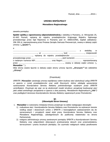 Poznań, dnia ………………..2016 r. UMOWA WSPÓŁPRACY Menadżera Regionalnego zawarta pomiędzy: Spektr spółką z ograniczoną odpowiedzialnością z siedzibą w Poznaniu, ul. Winogrady 25, 61-663 Poznań, wpisaną do rejestru przedsiębiorców Krajowego Rejestru Sądowego prowadzonego przez Sąd Rejonowy w Poznaniu pod nr: 0000153465, kapitał zakładowy: 296 250 zł, reprezentowaną przez Prezesa Zarządu Dariusza Piwowarczyk, zwaną w dalszej części umowy: („Spektr” ), a ………………………………………………………………………..……………………………… z siedzibą w ………………………………………., ul. ……………………………….., kod: …………………………, miejscowość ………………………………., wpisaną do rejestru przedsiębiorców …………………………………………. prowadzonego przez …………………………………………………, pod numerem …………………………….. o nadanym numerze NIP:………………………… oraz Regon:……………………………… reprezentowaną przez ……………………………………………………………………….…, zwaną w dalszej części umowy: („ Menadżer ” ). Obie strony zwane łącznie w dalszej części strony umowy łącznie „Stronam i” lub oddzielnie „Stroną” . [Preambuła] SPEKTR i M enadżer zawierają umowę współpracy celem budowy sieci dystrybucji usług SPEKTR w oparciu o rynek przedsiębiorców oraz osób fizycznych, którzy zdobędą uprawnienia wykonywania Koordynatora Serwisu Reklamy potwierdzonego wydanym przez SPEKTR certyfikatem. Przyjmuje się więc na tą okoliczność model struktury zarządczej budowanej sieci jako układ centralnego zarządzania w oparciu o dwa poziomy, Menadżerów Regionalnych („M R ”) oraz podległych terenowo Koordynatorów Serwisu Reklamy wspieranych przez Promotorów. §1 [Obowiązki Stron Umowy] 1. Menadżer w wykonaniu niniejszej Umowy przejmuje na siebie następujące obowiązki: 1) rozbudowa sieci Koordynatorów Serwisu Reklamy oraz Promotorów na wybranym terenie według zasad i stosownych umów z SPEKTR z bezwzględnym zastosowaniem się do opracowanych i przyjętych zasad etyki pracy Koordynatora Serwisu Reklamy oraz Menadżera Regionalnego, udostępnionych do publicznej wiadomości na strona Partnersclub; 2) wstępna administracja umową zawieranymi pomiędzy SPEKTR a Koordynatorami Serwisu Reklamy oraz załącznikiem dotyczącym przetwarzania danych oraz przeciwdziałaniu terroryzmowi i praniu brudnych pieniędzy. Do czynności wstępnych należy parafowanie -1- stron umowy oraz złącznika i dostarczenie wszystkich egzemplarzy do siedziby SPEKTR celem złożenia stosownych podpisów; 3) promocja i kształtowanie pozytywnego wizerunku SPEKTR, oraz wykreowanie zasad pracy i etyki stosowanej w codziennej działalności Koordynatorów Serwisu Reklamy oraz Promotorów, określonych wedle ogólnie przyjęty norm oraz warunków określonych w odrębnej umowie, zasad etyki lub regulaminach zawartych pomiędzy SPEKTR a Menadżerem; 4) organizacja oraz przeprowadzanie spotkań rekrutacyjnych, według zasad oraz standardów przyjętych w SPEKTR, nie rzadziej niż 4 razy w miesiącu; 5) rekrutacja oraz selekcja kandydatów na „Koordynatorów Serwisu Reklamy oraz Promotorów według kryteriów ustalonych przez Spektr; 6) organizacja pracy, szkolenia z zakresu obsługi programów i aplikacji służących obsłudze klienta i sprawnemu działaniu Koordynatorów Serwisu Reklamy oraz Promotorów w codziennej obsłudze CRM klienta; 7) wyznaczanie i realizacja celów sprzedażowych wraz z Koordynatorów Serwisu Reklamy, w oparciu o ustaloną z SPEKTR celową wielkość sprzedaży; 8) bieżąca kontrola realizacji zadań i celów krótko i długoterminowych, ustalonych wspólnie z Menadżerem, w zakresie prowadzonej sieci Koordynatorów Serwisu Reklamy oraz Promotorów; 9) prowadzenie ewidencji realizacji zadań nakierowanych na przyjęty cel oraz przesyłanie ewidencji do SPEKTR w okresach dekadowych; 10) raportowanie realizowanych zadań oraz wnioskowanie o zmiany w realizacji wyłączności terytorialnej gwarantowanej w umowie współpracy z Koordynatorami Serwisu Reklamy o ile taka wyłączność zostanie zagwarantowana; 11) realizacja planu sprzedażowego na poziomie ustalanym indywidualnie z Koordynatorem Serwisu Reklamy na zasadach budowy celów krótkoterminowych w przedziale czasowym jednego miesiąca: 12) zawieranie zamówień pakietów droga elektroniczną poprzez stronę www.partnersclub.pl lub w wyjątkowych sytuacjach droga papierową wraz z obowiązkiem wprowadzenia danych do elektronicznego systemu rejestracji na stronie www.partnersclub.pl 13) przyjmowanie zamówień na usługi i produkty do pozyskanych Partnerów na stosownych dokumentach przyjętych do stosowania w praktyce SPEKTR. 2. SPEKTR w wykonaniu niniejszej Umowy oświadcza, iż w kwestii organizacji sieci sprzedażowej nawiązał współprace z Firmą DarPiw sp. z o.o. i wraz z tym podmiotem przejmuje na siebie następujące obowiązki: 1. wspieranie merytoryczne oraz udział w szkoleniach sieci sprzedaży Koordynatorów Serwisu Reklamy oraz Promotorów z zastosowaniem zasad bezpłatnego szkolenia certyfikującego działalność Koordynatorów Serwisu Reklamy oraz Promotorów, co najmniej całodniowego (przy czym przyjmuje się czas promocji bezpłatnego realizowania szkoleń certyfikujących do dnia 31 Grudnia 2016 r.); 2. wypłacanie należnych prowizji zgodnie z terminami zawartymi w umowie współpracy lub innych regulaminach łączących SPEKTR z „Koordynatorami Serwisu Reklamy oraz Promotorami oraz postanowieniami tej umowy w zakresie wypłacania należnych prowizji i nagród (system nagród zostanie ustalony w odrębnym dokumencie, ustalonym wspólnie pomiędzy SPEKTR i DarPiw) zwanym „zasadami udziału w konkursie”; 3. utrzymywanie infor