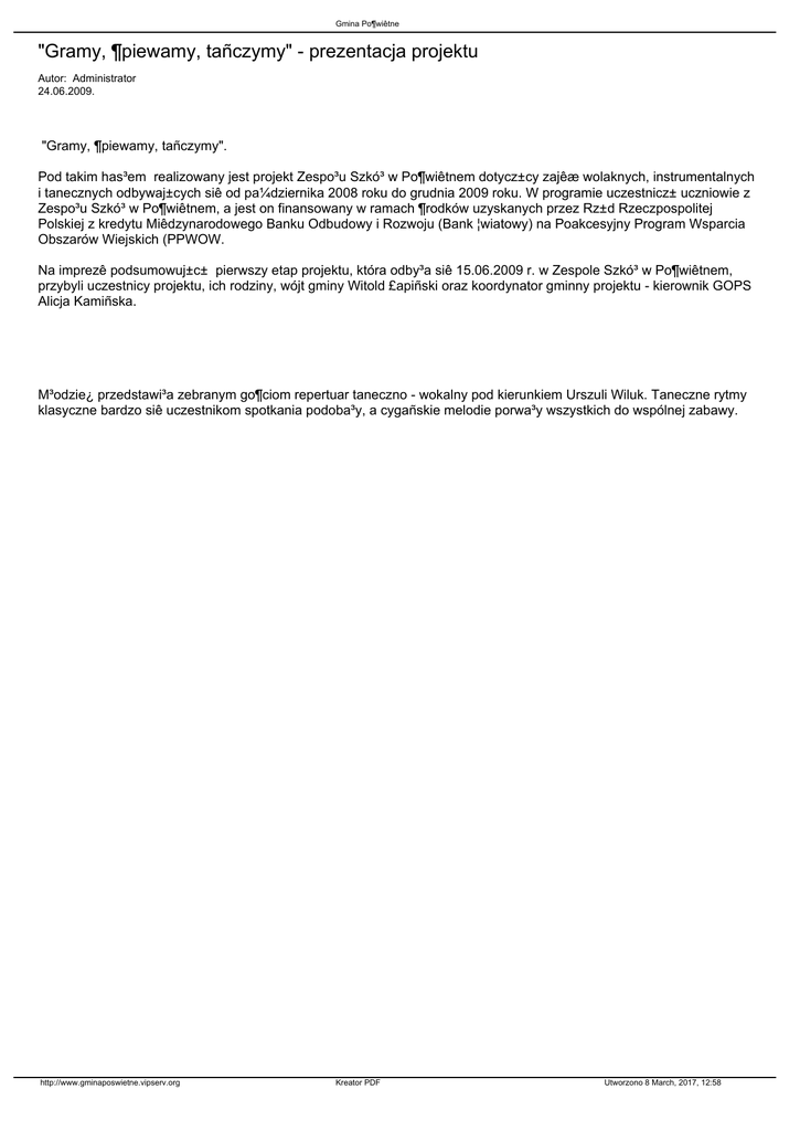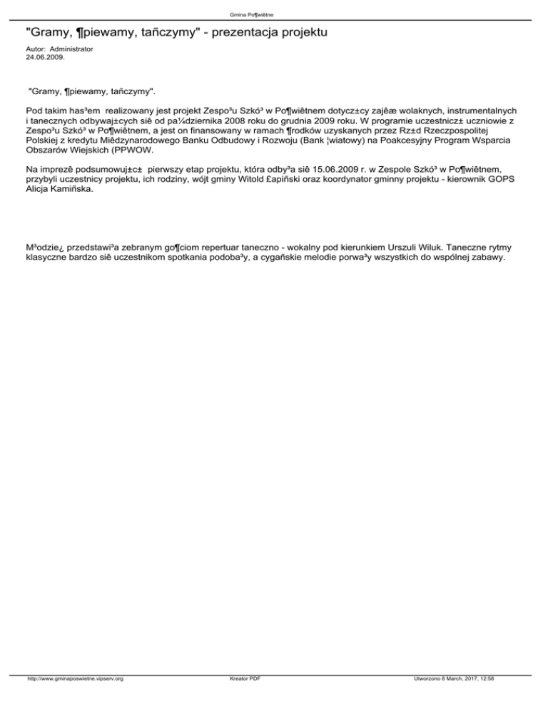 Gmina Po¶wiêtne "Gramy, ¶piewamy, tañczymy" - prezentacja projektu Autor: Administrator 24.06.2009. "Gramy, ¶piewamy, tañczymy". Pod takim has³em realizowany jest projekt Zespo³u Szkó³ w Po¶wiêtnem dotycz±cy zajêæ wolaknych, instrumentalnych i tanecznych odbywaj±cych siê od pa¼dziernika 2008 roku do grudnia 2009 roku. W programie uczestnicz± uczniowie z Zespo³u Szkó³ w Po¶wiêtnem, a jest on finansowany w ramach ¶rodków uzyskanych przez Rz±d Rzeczpospolitej Polskiej z kredytu Miêdzynarodowego Banku Odbudowy i Rozwoju (Bank ¦wiatowy) na Poakcesyjny Program Wsparcia Obszarów Wiejskich (PPWOW. Na imprezê podsumowuj±c± pierwszy etap projektu, która odby³a siê 15.06.2009 r. w Zespole Szkó³ w Po¶wiêtnem, przybyli uczestnicy projektu, ich rodziny, wójt gminy Witold £apiñski oraz koordynator gminny projektu - kierownik GOPS Alicja Kamiñska. M³odzie¿ przedstawi³a zebranym go¶ciom repertuar taneczno - wokalny pod kierunkiem Urszuli Wiluk. Taneczne rytmy klasyczne bardzo siê uczestnikom spotkania podoba³y, a cygañskie melodie porwa³y wszystkich do wspólnej zabawy. http://www.gminaposwietne.vipserv.org Kreator PDF Utworzono 8 March, 2017, 12:58