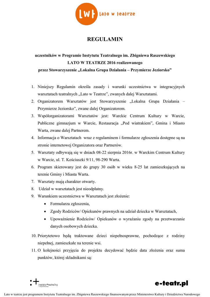 REGULAMIN uczestników w Programie Instytutu Teatralnego im. Zbigniewa Raszewskiego LATO W TEATRZE 2016 realizowanego przez Stowarzyszenie „Lokalna Grupa Działania – Przymierze Jeziorsko” 1. Niniejszy Regulamin określa zasady i warunki uczestnictwa w integracyjnych warsztatach teatralnych „Lato w Teatrze”, zwanych dalej Warsztatami. 2. Organizatorem Warsztatów jest Stowarzyszenie „Lokalna Grupa Działania – Przymierze Jeziorsko”, zwane dalej Organizatorem. 3. Współorganizatorami Warsztatów jest: Warckie Centrum Kultury w Warcie, Publiczne gimnazjum w Warcie, Restauracja „Pod wiatrakiem”, Gmina i Miasto Warta, zwane dalej Partnerem. 4. Informacja o Warsztatach wraz z regulaminem i formularze zgłoszenia dostępne są na stronie internetowej Organizatora oraz Partnerów. 5. Warsztaty odbywają się w dniach 08-22 sierpnia 2016r. w Warckim Centrum Kultury w Warcie, ul. T. Kościuszki 9/11, 98-290 Warta. 6. Program skierowany jest do grupy 30 osób w wieku 8-25 lat zamieszkujących na terenie Gminy i Miasta Warta. 7. Warsztaty mają charakter otwarty. 8. Udział w warsztatach jest nieodpłatny. 9. Warunkiem uczestnictwa w Warsztatach jest złożenie: Formularza zgłoszenia, Zgody Rodziców/ Opiekunów prawnych na udział dziecka w Warsztatach, Upoważnienie Rodziców/ Opiekunów o wyrażaniu zgody na przetwarzanie danych osobowych dziecka. 10. Priorytetowo będą traktowane dzieci niepełnosprawne, pochodzące z rodziny niepełnej, zamieszkałe na terenie wsi. 11. O kolejności przyjęcia do projektu decydować będzie data złożenia oraz suma punktów, której składnikami są: Lato w teatrze jest programem Instytutu Teatralnego im. Zbigniewa Raszewskiego finansowanym przez Ministerstwo Kultury i Dziedzictwa Narodowego Dzieci niepełnosprawne - 1pkt. Dzieci matek lub ojców samotnie wychowujących dzieci – 1 pkt. Dzieci zamieszkałe z terenu wiejskiego, które mają utrudniony dostęp do kultury/edukacji – 1 pkt. 12. Listę rankingową uprawniającą do udziału w poszczególnych zajęciach tworzy się od największej do najmniejszej liczby punktów. 13. W przypadku dzieci, które uzyskają jednakową liczbę punktów, o kolejności kandydatów decyduje pierwszeństwo złożenia wymaganych dokumentów. 14. Lista dzieci, które zostaną przyjęte do projektu zostanie wywieszona na tablicy ogłoszeń w Stowarzyszeniu „Lokalna Grupa Działania – Przymierze Jeziorsko”. 15. Zajęcia prowadzone są w czterech grupach: aktorskiej, scenograficzny, multimedialnej, muzycznej. O przydzieleniu uczestnika do grupy decyduje prowadzący zajęcia na podstawie predyspozycji i zainteresowań uczestnika. 16. Organizator zapewnia opiekę pedagogiczną i medyczną przewidzianą przepisami MEN. 17. Organizator odpowiada za dobór osób prowadzących warsztaty oraz merytoryczny program zajęć. 18. Organizator zapewnia pomieszczenia i materiały konieczne do prowadzenia zajęć. 19. Organizator zapewnia poczęstunek dla uczestników zajęć. 20. Zgłoszenie uczestnictwa jest równoznaczne z deklaracją Rodziców/ Opiekunów prawnych o udziale dziecka w Warsztatach w wymiarze czasowym 6 h dziennie w dniach 08-22 sierpnia 2015r. 21. W przypadku rezygnacji z Warsztatów Rodzice/Opiekunowie prawni są zobowiązani do wypełnienia rezygnacji z uczestnictwa z warsztatów. 22. Rodzice/Opiekunowie są zobowiązani do informowania Organizatora o każdorazowej nieobecności dziecka na zajęciach. 23. Rodzice/Opiekunowie są zobowiązani do punktualnego przyprowadzania dziecka na zajęcia o godz. 9.00 i odbierania z zajęć o godz. 15.00. 24. Uczestnicy Warsztatów przebywają pod opieką Organizatora od godz. 9.00 do godz. 15.00. 25. Uczestnicy Warsztatów mają obowiązek: Uczestniczyć we wszystkich zajęciach programu Warsztatów, Lato w teatrze jest programem Instytutu Teatralnego im. Zbigniewa Raszewskiego finansowanym przez Ministerstwo Kultury i Dziedzictwa Narodowego Przestrzegać ramowego harmonogramu dnia, Brać udział w realizowaniu programu Warsztatów, Przestrzegać poleceń instruktorów, Szanować mienie i pomoce dydaktyczne. 26. Samowolne oddalenie się od prowadzących, niezdyscyplinowanie, niewykonywanie poleceń, nieprzestrzeganie regulaminu będzie karane upomnieniem, naganą, a w ostateczności wykluczeniem Uczestnika z udziału w Warsztatach. Lato w teatrze jest programem Instytutu Teatralnego im. Zbigniewa Raszewskiego finansowanym przez Ministerstwo Kultury i Dziedzictwa Narodowego