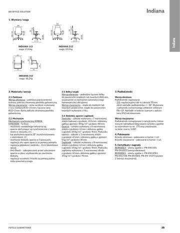 Indiana BN OFFICE SOLUTION 1. Wymiary / waga 715 Ø INDIANA 113 waga: 21,6 kg Indiana 465÷600 740 1185÷1320 465÷600 570 205÷280 1030÷1165 Ø 205÷280 640 640 715 INDIANA 213 waga: 22,2 kg 505 490 995 225 650 575 530 INDIANA 312 waga: 16,2 kg 2. Materiały / wersje 2.1. Podstawa Wersja obrotowa – podstawa pięcioramienna stalowa, pokryta chromową powłoka galwaniczną. Wersja stacjonarna – rama na płozie wykonanej z rury stalowej Ø 22 × 2,5 mm, łączyna ramy Ø 22 × 2 mm. Rama pokryta chromową powłoka galwaniczną. 2.2. Mechanizm Mechanizm synchroniczny EPRON SYNCRON – funkcje: – możliwość swobodnego kołysania się, – oparcie odchylające się synchronicznie z siedziskiem w stosunku 2:1, – kąt pochylenia oparcia 20 ° zsynchronizowany z siedziskiem 11 °, – możliwość blokady oparcia w 5 pozycjach, – regulacja siły oporu oparcia za pomocą pokrętła, – regulacja głębokości siedziska – 6 cm (dodatkowa opcja), – Anti-Shock – zabezpieczenie przed uderzeniem oparcia w plecy użytkownika po zwolnieniu blokady, – regulacja wysokości krzesła za pomocą podnośnika pneumatycznego. FOTELE GABINETOWE 2.3. Kółka / stopki Wersja obrotowa – podwójnie łączone kółka do powierzchni miękkich lub twardych Ø 65 mm, wyposażone w mechanizm automatycznego hamowania bez obciążenia. Wersja stacjonarna – stopki do miękkich lub twardych powierzchni, stopki do powierzchni twardych wykonane z filcu. 2.4. Siedzisko, oparcie i zagłówek Siedzisko – szkielet wykonany z 7 warstwowej sklejki bukowej o grubości 10,5 mm i obłożony gąbką o gęstości 30 kg / m³ i grubości 60 mm. Oparcie – szkielet wykonany z 8 warstwowej sklejki o grubości 12 mm i obłożony gąbką o gęstości 25 kg / m3 i grubości 9 mm. Poduszka oparcia – szkielet z 3 warstwowej sklejki o grubości 4,5 mm i obłożony gąbką o gęstości 5 kg / m³ i grubości 30 mm. Zagłówek – szkielet wykonany z 8 warstwowej sklejki o grubości 12 mm i obłożony gąbką o gęstości 25 kg / m3 i grubości 9 mm. Poduszka zagłówka wykonana z 3 warstwowej sklejki o grubości 4,5 mm, obłożona gąbką o gęstości 25 kg / m³ i grubości 70 mm. 3. Podłokietniki Wersja obrotowa: Podłokietniki regulowane: – 2-D: regulacja góra / dół w zakresie 70 mm, obrót nakładki podłokietnika +/− 30 °. Wykonane z poliamidu wzmacnianego włóknem szklanym PA + GF. Nakładki w kolorze czarnym z poliuretanu (PU) lub drewniane. Wersja stacjonarna: Podłokietniki zintegrowane z ramą krzesła z drewnianymi nakładkami (bejcowane na kolory zgodnie ze wzornikiem na str. 175 oraz emaliowane na kolor czarny 3.097. 4. Pakowanie Krzesło obrotowe – pakowanie w karton 1 szt. Krzesło stacjonarne – pakowanie w karton 1 szt. 5. Certyfikaty i nagrody REMODEX – atesty zgodne z: PN-EN1335; PN-EN1022 (wersja obrotowa). REMODEX – atesty zgodne z: PN-EN13761, PN-EN1728, PN-EN1022, PN-EN-15373 poziom 2 (wersja stacjonarna). 29 Indiana BN OFFICE SOLUTION OPCJE DLA LINII INDIANA – KRZESŁA OBROTOWE Wyposażenie dodatkowe / opis Symbol Dopłata Indiana Drewniane nakładki podłokietnika z regulacją wysokości i kąta obrotu nakładki R2W 30 Kółka Ø 65 mm do twardych powierzchni K2F bez dopłaty Wyposażenie dodatkowe / opis Symbol Dopłata Stopki do twardych powierzchni G4F 18 OPCJE DLA LINII INDIANA – KRZESŁA KONFERENCYJNE Przy składaniu zamówienia należy podać model produktu, kody opcji z tabeli „symbol” oraz kod wykończenia (tapicerki lub skóry). W standardzie kółka do miękkich powierzchni. Wszystkie ceny podane są w PLN i nie zawierają podatku VAT. 30 Indiana BN OFFICE SOLUTION INDIANA – KRZESŁA OBROTOWE Opis INDIANA 113 Ø 3 4 5* Krzesło obrotowe z mechanizmem synchronicznym z regulacją głębokości siedziska, w całości tapicerowane oparcie i siedzisko. Podłokietniki z regulacją wysokości i kąta obrotu nakładki (nakładki PU). Kółka Ø 65 mm do powierzchni miękkich. Podstawa stalowa chromowana (Z). 899 949 1026 1064 1269 Krzesło obrotowe z mechanizmem synchronicznym z regulacją głębokości siedziska, w całości tapicerowany zagłówek, oparcie i siedzisko. Podłokietniki z regulacją wysokości i kąta obrotu nakładki (nakładki PU). Kółka Ø 65 mm do powierzchni miękkich. Podstawa stalowa chromowana (Z). 985 1045 1120 1195 1415 1 2 3 4 5* 595 645 722 767 970 465÷600 740 640 205÷280 2 715 INDIANA 213 1185÷1320 1 465÷600 570 1030÷1165 205÷280 640 Grupa cenowa Indiana Model Ø 715 INDIANA – KRZESŁO KONFERENCYJNE Model Opis INDIANA 312 Krzesło konferencyjne na płozie. W całości tapicerowane siedzisko i oparcie. Zintegrowane z ramą krzesła podłokietniki z drewnianymi nakładkami. Stopki do miękkich powierzchni. Wersja chromowana (Z). 490 505 225 650 995 Grupa cenowa 575 530 GRUPA CENOWA 1: Bondai, Lucia, Sempre, Kaiman GRUPA CENOWA 2: Contract, Microfibra, Nexus, Valencia, Xtreme GRUPA CENOWA 3: King L Elast, Oxygen, Silvertex, Flex GRUPA CENOWA 4: Blazer, Fame GRUPA CENOWA 5: Skóra LE, Skóra SD, Skóra Q * Dopłata 15% do modeli tapicerowanych skórą LE15. FOTELE GABINETOWE ceny netto w PLN › KRZESŁA BIUROWE 2013 › PL 31