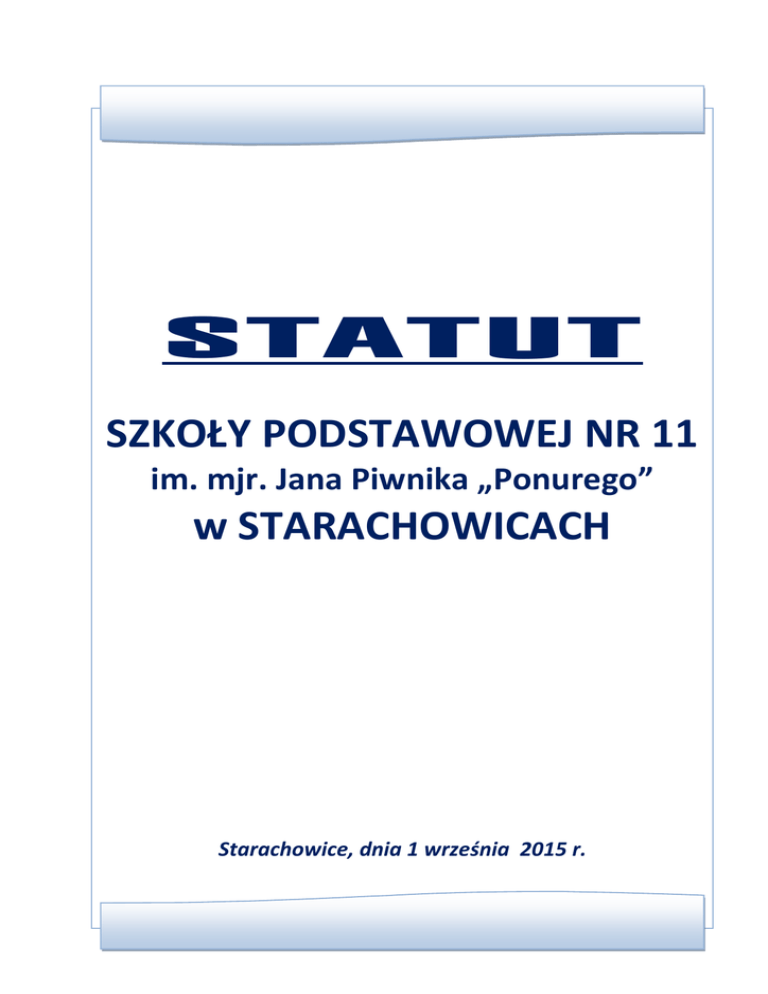 STATUT SZKOŁY PODSTAWOWEJ NR 11 im. mjr. Jana Piwnika „Ponurego” w STARACHOWICACH Starachowice, dnia 1 września 2015 r. ROZDZIAŁ 1 Nazwa szkoły i informacje o szkole §1 1. Szkoła jest szkołą podstawową noszącą nazwę im. mjr. Jana Piwnika „Ponurego” w Starachowicach. Szkoła Podstawowa nr 11 2. Siedzibą Szkoły jest budynek przy ul. Leśnej 2 w Starachowicach. 3. Szkoła Podstawowa nr 11 w Starachowicach jest szkołą publiczną, prowadzoną przez Gminę Starachowice. 4. Ilekroć w statucie jest mowa o szkole, należy przez to rozumieć Szkołę Podstawową nr 11 im. mjr. Jana Piwnika „Ponurego” w Starachowicach. ROZDZIAŁ 2 Cele i zadania szkoły §2 1. Szkoła realizuje cele i zadania określone w podstawach programowych oraz w oparciu o Program Wychowawczy Szkoły i Szkolny Program Profilaktyki. 2. Szkoła w zakresie nauczania zapewnia uczniom: 1) 2) 3) 4) 5) 6) 7) 8) 3. naukę poprawnego i swobodnego wypowiadania się, pisania i czytania ze zrozumieniem; poznawanie wymaganych pojęć i zdobywanie rzetelnej wiedzy na poziomie umożliwiającym, co najmniej kontynuację nauki na następnym etapie kształcenia; dochodzenie do rozumienia, a nie tylko do pamięciowego opanowania przekazywanych treści; rozwijanie zdolności dostrzegania różnego rodzaju związków i zależności (przyczynowo-skutkowych, funkcjonalnych, czasowych, przestrzennych itp.); rozwijanie zdolności myślenia analitycznego i syntetycznego; przekazywanie wiadomości przedmiotowych w sposób integralny, prowadzący do lepszego rozumienia świata, ludzi i siebie; poznawanie zasad rozwoju osobowego i życia społecznego; poznawanie dziedzictwa kultury narodowej postrzeganej w perspektywie kultury europejskiej. W szkole uczniowie kształcą swoje umiejętności wykorzystywania zdobytej wiedzy, aby lepiej przygotować się do pracy w warunkach współczesnego świata. Nauczyciele tworzą uczniom warunki do zdobywania następujących umiejętności: 1) planowania, organizowania i oceniania własnej nauki, przyjmowania za nią coraz większej odpowiedzialności; 2 2) 3) 4) 5) 6) 7) 8) 4. skutecznego porozumiewania się w różnych sytuacjach, prezentacji własnego punktu widzenia i uwzględniania poglądów innych ludzi, poprawnego posługiwania się językiem ojczystym, przygotowania do publicznych wystąpień; efektywnego współdziałania w zespole i pracy w grupie, budowania więzi międzyludzkich, podejmowania indywidualnych i grupowych decyzji, skutecznego działania na gruncie zachowania obowiązujących norm; rozwiązywania problemów w twórczy sposób;, poszukiwania, porządkowania i wykorzystywania informacji z różnych źródeł oraz efektywnego posługiwania się technologią informacyjną; odnoszenia do praktyki zdobytej wiedzy oraz tworzenia potrzebnych doświadczeń i nawyków; rozwijania sprawności umysłowych oraz osobistych zainteresowań; przyswajania sobie metod i technik negocjacyjnego rozwiązywania konfliktów i problemów społecznych. Nauczyciele w pracy wychowawczej, wspierając w tym zakresie obowiązki rodziców, zmierzają do tego aby uczniowie w szczególności: 1) 2) 3) 4) 5) 6) 7) 8) znajdowali w szkole środowisko wszechstronnego rozwoju osobowego (w wymiarze intelektualnym, psychicznym, społecznym, zdrowotnym, estetycznym, moralnym, duchowym); rozwijali w sobie dociekliwość poznawczą, ukierunkowaną na poszukiwanie prawdy, dobra i piękna w świecie; mieli świadomość życiowej użyteczności zarówno poszczególnych przedmiotów nauczania, jak i całej edukacji na danym etapie; stawali się coraz bardziej samodzielni w dążeniu do dobra w jego wymiarze indywidualnym i społecznym, godząc dążenie do dobra własnego z dobrem innych, odpowiedzialność za siebie z odpowiedzialnością za innych, wolność własną z wolnością innych; poszukiwali, odkrywali i dążyli na drodze rzetelnej pracy do osiągnięcia celów życiowych i wartości ważnych dla odnalezienia własnego miejsca w świecie; uczyli się szacunku dla dobra wspólnego jako podstawy życia społecznego oraz przygotowywali się do życia w rodzinie w społeczności lokalnej i w państwie; przygotowywali się do rozpoznawania wartości moralnych, dokonywania wyborów i hierarchizacji wartości oraz mieli możliwość doskonalenia się; kształtowali w sobie postawę dialogu, umiejętność słuchania i rozumienia ich poglądów: umieli współdziałać i współtworzyć w szkole wspólnotę nauczycieli i uczniów. §3 1. Nauczyciele, mając na uwadze osobowy rozwój ucznia, współdziałają na rzecz tworzenia w świadomości uczniów zintegrowanego systemu wiedzy, umiejętności i postaw. 2. Realizacja zadań szkoły obejmuje: 1) realizację rocznego przygotowania przedszkolnego w oddziale przedszkolnym, 3 2) 3) 4) 5) 6) 7) 3. W zależności od możliwości szkoły mogą być prowadzone dodatkowe nieobowiązkowe zajęcia edukacyjne wykraczające poza podstawę programową wychowania przedszkolnego. Przygotowanie polega na zapewnieniu opieki, wychowaniu i uczeniu w atmosferze akceptacji i bezpieczeństwa w celu osiągnięcia przez dziecko gotowości szkolnej. I etap edukacyjny obejmujący klasy I – III. Kształcenie na tym etapie jest łagodnym przejściem od wychowania przedszkolnego do edukacji prowadzonej w systemie szkolnym. Ma ono charakter zintegrowany. Zajęcia edukacyjne prowadzi nauczyciel według ustalonego przez siebie planu, dostosowując czas zajęć i przerw do aktywności uczniów; II etap edukacyjny obejmujący klasy IV – VI. Kształcenie na tym etapie polega na realizowaniu podstawy programowej poszczególnych przedmiotów zgodnie z ramowymi planami nauczania. Działalność edukacyjna szkoły jest określona przez: 1. 2. 3. Szkolny Zestaw Programów Nauczania, który uwzględniając wymiar wychowawczy, obejmuje całą działalność szkoły z punktu widzenia dydaktycznego; Program Wychowawczy Szkoły, który omawia w sposób całościowy wszystkie treści i działania