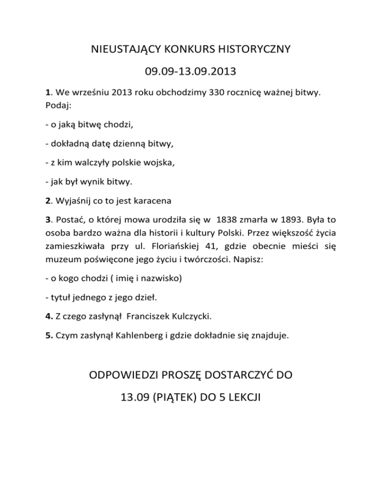 NIEUSTAJĄCY KONKURS HISTORYCZNY 09.09-13.09.2013 1. We wrześniu 2013 roku obchodzimy 330 rocznicę ważnej bitwy. Podaj: - o jaką bitwę chodzi, - dokładną datę dzienną bitwy, - z kim walczyły polskie wojska, - jak był wynik bitwy. 2. Wyjaśnij co to jest karacena 3. Postad, o której mowa urodziła się w 1838 zmarła w 1893. Była to osoba bardzo ważna dla historii i kultury Polski. Przez większośd życia zamieszkiwała przy ul. Floriaoskiej 41, gdzie obecnie mieści się muzeum poświęcone jego życiu i twórczości. Napisz: - o kogo chodzi ( imię i nazwisko) - tytuł jednego z jego dzieł. 4. Z czego zasłynął Franciszek Kulczycki. 5. Czym zasłynął Kahlenberg i gdzie dokładnie się znajduje. ODPOWIEDZI PROSZĘ DOSTARCZYD DO 13.09 (PIĄTEK) DO 5 LEKCJI