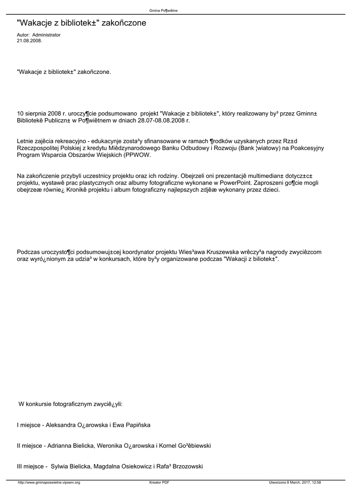 Gmina Po¶wiêtne "Wakacje z bibliotek±" zakoñczone Autor: Administrator 21.08.2008. "Wakacje z bibliotek±" zakoñczone. 10 sierpnia 2008 r. uroczy¶cie podsumowano projekt "Wakacje z bibliotek±", który realizowany by³ przez Gminn± Bibliotekê Publiczn± w Po¶wiêtnem w dniach 28.07-08.08.2008 r. Letnie zajêcia rekreacyjno - edukacynje zosta³y sfinansowane w ramach ¶rodków uzyskanych przez Rz±d Rzeczpospolitej Polskiej z kredytu Miêdzynarodowego Banku Odbudowy i Rozwoju (Bank ¦wiatowy) na Poakcesyjny Program Wsparcia Obszarów Wiejskich (PPWOW. Na zakoñczenie przybyli uczestnicy projektu oraz ich rodziny. Obejrzeli oni prezentacjê multimedian± dotycz±c± projektu, wystawê prac plastycznych oraz albumy fotograficzne wykonane w PowerPoint. Zaproszeni go¶cie mogli obejrzeæ równie¿ Kronikê projektu i album fotograficzny najlepszych zdjêæ wykonany przez dzieci. Podczas uroczysto¶ci podsumowuj±cej koordynator projektu Wies³awa Kruszewska wrêczy³a nagrody zwyciêzcom oraz wyró¿nionym za udzia³ w konkursach, które by³y organizowane podczas "Wakacji z biliotek±". W konkursie fotograficznym zwyciê¿yli: I miejsce - Aleksandra O¿arowska i Ewa Papiñska II miejsce - Adrianna Bielicka, Weronika O¿arowska i Kornel Go³êbiewski III miejsce - Sylwia Bielicka, Magdalna Osiekowicz i Rafa³ Brzozowski http://www.gminaposwietne.vipserv.org Kreator PDF Utworzono 8 March, 2017, 12:58 Gmina Po¶wiêtne W konkursie plastycznym "Ilustracja do ulubionej ksi±¿ki najlepsi byli: I miejsce - Sylwia Bielicka i Sylwia Urbasz II miejsce - Aleksandra O¿arowska i Aleksandra Brzozowska III miejsce - Karolina Kamiñska i Anna Papiñska W turnieju czytelniczym "Z ksi±¿k± za pan brat" punktowane miejsca zajêli: I miejsce - Aleksandra £apiñska II miejsce - Ewa Papiñska III miejsce - Aleksandra Kamiñska, Martyna Falkowska i Joanna £apiñska. Pozostali otrzymali wyró¿nienia: Na zakoñczenie uczestnicy projektu, ich rodziny oraz zaproszeni go¶cie mogli pokrzepiæ siê przy s³odkim stole. http://www.gminaposwietne.vipserv.org Kreator PDF Utworzono 8 March, 2017, 12:58