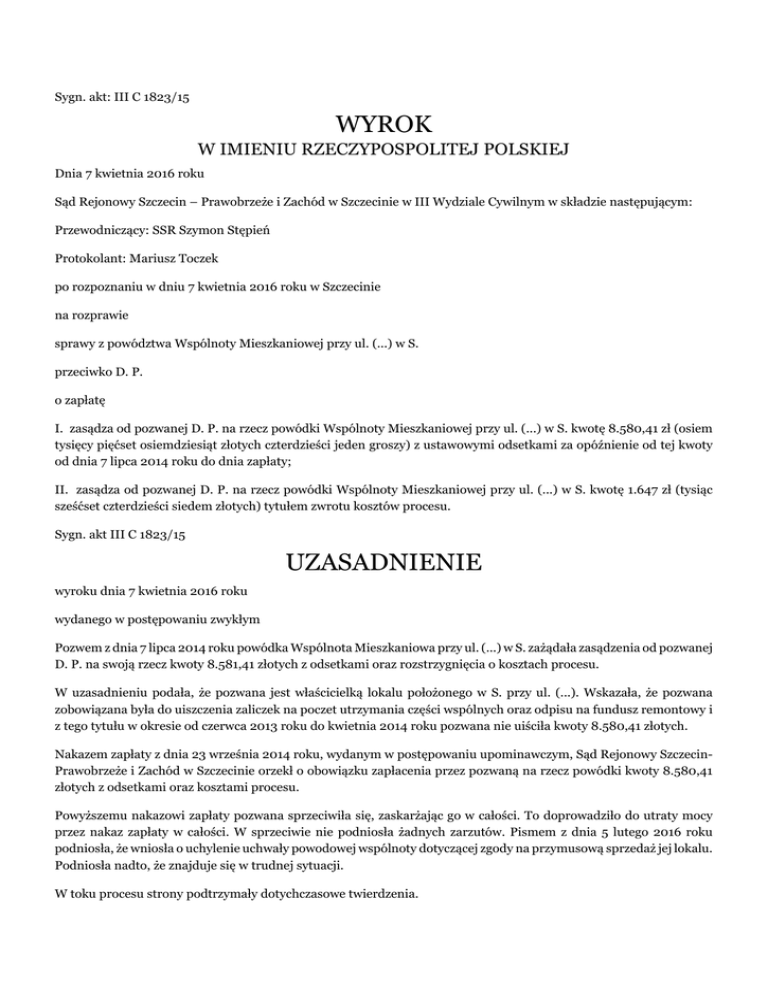 Sygn. akt: III C 1823/15 WYROK W IMIENIU RZECZYPOSPOLITEJ POLSKIEJ Dnia 7 kwietnia 2016 roku Sąd Rejonowy Szczecin – Prawobrzeże i Zachód w Szczecinie w III Wydziale Cywilnym w składzie następującym: Przewodniczący: SSR Szymon Stępień Protokolant: Mariusz Toczek po rozpoznaniu w dniu 7 kwietnia 2016 roku w Szczecinie na rozprawie sprawy z powództwa Wspólnoty Mieszkaniowej przy ul. (...) w S. przeciwko D. P. o zapłatę I. zasądza od pozwanej D. P. na rzecz powódki Wspólnoty Mieszkaniowej przy ul. (...) w S. kwotę 8.580,41 zł (osiem tysięcy pięćset osiemdziesiąt złotych czterdzieści jeden groszy) z ustawowymi odsetkami za opóźnienie od tej kwoty od dnia 7 lipca 2014 roku do dnia zapłaty; II. zasądza od pozwanej D. P. na rzecz powódki Wspólnoty Mieszkaniowej przy ul. (...) w S. kwotę 1.647 zł (tysiąc sześćset czterdzieści siedem złotych) tytułem zwrotu kosztów procesu. Sygn. akt III C 1823/15 UZASADNIENIE wyroku dnia 7 kwietnia 2016 roku wydanego w postępowaniu zwykłym Pozwem z dnia 7 lipca 2014 roku powódka Wspólnota Mieszkaniowa przy ul. (...) w S. zażądała zasądzenia od pozwanej D. P. na swoją rzecz kwoty 8.581,41 złotych z odsetkami oraz rozstrzygnięcia o kosztach procesu. W uzasadnieniu podała, że pozwana jest właścicielką lokalu położonego w S. przy ul. (...). Wskazała, że pozwana zobowiązana była do uiszczenia zaliczek na poczet utrzymania części wspólnych oraz odpisu na fundusz remontowy i z tego tytułu w okresie od czerwca 2013 roku do kwietnia 2014 roku pozwana nie uiściła kwoty 8.580,41 złotych. Nakazem zapłaty z dnia 23 września 2014 roku, wydanym w postępowaniu upominawczym, Sąd Rejonowy SzczecinPrawobrzeże i Zachód w Szczecinie orzekł o obowiązku zapłacenia przez pozwaną na rzecz powódki kwoty 8.580,41 złotych z odsetkami oraz kosztami procesu. Powyższemu nakazowi zapłaty pozwana sprzeciwiła się, zaskarżając go w całości. To doprowadziło do utraty mocy przez nakaz zapłaty w całości. W sprzeciwie nie podniosła żadnych zarzutów. Pismem z dnia 5 lutego 2016 roku podniosła, że wniosła o uchylenie uchwały powodowej wspólnoty dotyczącej zgody na przymusową sprzedaż jej lokalu. Podniosła nadto, że znajduje się w trudnej sytuacji. W toku procesu strony podtrzymały dotychczasowe twierdzenia. Sąd ustalił następujący stan faktyczny: Pozwana jest właścicielką lokalu mieszkalnego położonego w S. przy ul. (...). Okoliczność bezsporna Z tytułu utrzymania części wspólnych przypadających na wskazany wyżej lokal pozwana zobowiązana była uiścić w czerwcu 2013 roku kwotę 551,08 złotych, w lipcu 2013 roku kwotę 573,58 złotych, od sierpnia do grudnia 2013 roku kwoty po 581,58 złotych miesięcznie, od stycznia do marca 2014 roku kwoty po 586,22 złotych miesięcznie i w kwietniu 2014 roku kwotę 578,22 złotych. W tym okresie odpis na fundusz remontowy wynosił po 162,10 złotych miesięcznie. Łączna kwota zobowiązań pozwanej z tytułu zaliczek na poczet utrzymania części wspólnych oraz fundusz remontowy w okresie dochodzonym pozwem wyniosła 8.152,54 złotych. Nadto z tytułu rozliczenia centralnego ogrzewania za 2012 i 2013 roku pozwana zobowiązana była do zapłaty łącznie kwoty 945,41 złotych, zaś z tytułu rozliczenia pozostałych mediów kwotę 938,14 złotych. Z tego tytułu pozwana zapłaciła kwotę 1.455,68 złotych. Okoliczność bezsporna, a nadto: • kartoteka konta, k. 11-12; Sąd zważył, co następuje: Powództwo zasługiwało na uwzględnienie w całości. Podstawę żądania art. 13 ust. 1 ustawy z dnia 24 czerwca 1994 roku o własności lokali (t.j. Dz.U. z 2015 roku, poz. 1892), zgodnie z którym właściciel lokalu właściciel ponosi wydatki związane z utrzymaniem jego lokalu, jest obowiązany uczestniczyć w kosztach zarządu związanych z utrzymaniem nieruchomości wspólnej. Zgodnie z art. 14 pkt 1 przywołanej ustawy na koszty zarządu nieruchomością wspólną składają się w szczególności wydatki na remonty i bieżącą konserwację, opłaty za dostawę energii elektrycznej i cieplnej, gazu i wody, w części dotyczącej nieruchomości wspólnej, oraz opłaty za antenę zbiorczą i windę, ubezpieczenia, podatki i inne opłaty publicznoprawne, chyba że są pokrywane bezpośrednio przez właścicieli poszczególnych lokali, wydatki na utrzymanie porządku i czystości, wynagrodzenie członków zarządu lub zarządcy. Na pokrycie kosztów zarządu właściciele lokali uiszczają zaliczki w formie bieżących opłat, płatne z góry do dnia 10 każdego miesiąca (art. 15 ust. 1 przywołanej ustawy). W takim stanie rzeczy powódka winna była wykazać, że pozwana jest właścicielką lokalu i tym samym tworzy powodową wspólnotę mieszkaniową. Winna również udowodnić wysokość należności obciążających pozwaną w rozumieniu art. 13 przywołanej ustawy. Jednocześnie zgodnie z treścią art. 230 k.p.c. gdy strona nie wypowie się co do twierdzeń strony przeciwnej o faktach, sąd, mając na uwadze wyniki całej rozprawy, może fakty te uznać za przyznane. Fakty przyznane w toku postępowania przez stronę przeciwną nie wymagają dowodu, jeżeli przyznanie nie budzi wątpliwości (art. 229 k.p.c.). Wskazać należy, że pozwana nie kwestionowała, by była właścicielką lokalu położonego w S. przy ul. (...) i tym samym tworzyła powodową wspólnotę mieszkaniową. W takiej sytuacji przyjąć należało, że pozwana winna ponosić wydatki związane z utrzymaniem jego lokalu, jest obowiązany uczestniczyć w kosztach zarządu związanych z utrzymaniem nieruchomości wspólnej, o których mowa w art. 13 przywołanej ustawy o własności lokali. Wysokość tych należności nie była również przez pozwaną kwestionowana. Co więcej, pozwana nie tylko nie kwestionowała wysokości tych należności, ale podejmowała próby zmierzające do zawarcia ugody w sprawie ich spłaty. Przedstawione przez pozwaną warunk