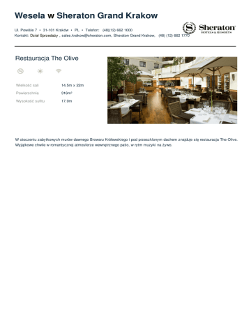 Wesela w Sheraton Grand Krakow Ul. Powiśle 7 • 31-101 Kraków • PL • Telefon: (48)(12) 662 1000 Kontakt: Dział Sprzedaży , [email protected], Sheraton Grand Krakow, (48) (12) 662 1770 Restauracja The Olive Wielkość sali 14.5m x 22m Powierzchnia 316m² Wysokość sufitu 17.0m W otoczeniu zabytkowych murów dawnego Browaru Królewskiego i pod przeszklonym dachem znajduje się restauracja The Olive. Wyjątkowe chwile w romantycznej atmosferze wewnętrznego patio, w rytm muzyki na żywo.