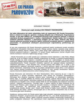 Warszawa, 18 kwietnia 2014 r. KOMUNIKAT PRASOWY Znamy już część atrakcji XXI PARADY PAROWOZÓW Już tylko kilkanaście dni dzieli miłośników kolei od rozpoczęcia XXI Parady Parowozów, która w dniach 3-4 maja br. zgodnie z tradycją odbędzie się w Wolsztynie. Organizatorzy Parady, w tym PKP CARGO S.A., przedstawili pierwszą część programu imprezy, w którym najwięcej atrakcji przygotowano z myślą o najmłodszych. Jednak każdy, kto w majowy weekend odwiedzi Wolsztyn, z pewnością znajdzie coś dla siebie. Podczas XXI edycji imprezy głównym punktem programu będzie możliwość przejazdu jednym z zabytkowych parowozów. O pozostałych atrakcjach parowozowych organizatorzy poinformują już niebawem. W tym roku organizatorzy XXI Parady Parowozów postanowili spełnić oczekiwania przede wszystkim najmłodszych entuzjastów lokomotyw parowych. Dlatego podczas imprezy najwięcej uwagi zostanie poświęcone edukacji poprzez zabawę. Temu celowi służyć będą zaplanowane liczne animacje oraz konkursy popularno-naukowe z nagrodami. W ramach Parady zaplanowano również oficjalne bicie rekordu Guinessa w tworzeniu najdłuższego pociągu z ciasta. - Parada Parowozów już na stałe wpisała się w kalendarze fanów kolejnictwa z całej Polski, dlatego cieszę się, że po raz kolejny możemy wspólnie zorganizować tę imprezę. W zespole przygotowującym Paradę znajdują się osoby związane z projektem od wielu lat i odpowiadające za wysoką jakość wydarzenia, dlatego podczas tegorocznej edycji każda osoba, która nas odwiedzi, powinna być w pełni usatysfakcjonowana. Przede wszystkim chcieliśmy zapewnić jak najwięcej atrakcji najmłodszym miłośnikom lokomotyw – mówi Mirosław Kuk, rzecznik prasowy PKP CARGO S.A. Z myślą o nich zaplanowaliśmy większość elementów programu, z których głównym będzie z pewnością sobotnia Parada Parowozów. Organizacja Parady to nie jedyne zaangażowanie naszej firmy w tym obszarze. Poza majową imprezą prowadzimy równolegle działania na rzecz rozwoju Parowozowni Wolsztyn poprzez stworzenie dedykowanej temu celowi instytucji kultury – dodaje. Parada Parowozów jest elementem Dni Ziemi Wolsztyńskich, które rozpoczną się już 1 maja br. Organizatorzy w ramach obchodów zaplanowali wiele atrakcji dla wszystkich odwiedzających. Pierwszego dnia oficjalnie rozpoczęty zostanie sezon motocyklowy na wolsztyńskim targowisku. Oprócz tego, w czwartek odbędą się również liczne koncerty, podczas których każdy fan muzyki niezależnie od swoich gustów z pewnością znajdzie coś dla siebie. Piątkowy dzień upłynie pod znakiem świętowania na miejskim rynku 10-lecia wejścia Polski do Unii Europejskiej oraz kolejnych koncertów znanych i lubianych wykonawców. Trzeciego maja, w sobotę, impreza na dobre przeniesie się do Parowozowni Wolsztyn, gdzie nastąpi jej uroczyste otwarcie, a następnie właściwe rozpoczęcie XXI Parady Parowozów. Na zakończenie dnia organizatorzy przygotowali również wyjątkowe przedstawienie „Światło, dźwięk i para”. Ostatni dzień Parady to między innymi możliwość odwiedzin strefy animacji dla rodzin z dziećmi, emocjonujące jak co roku zawody maszynistów oraz na koniec musicalowa gala teatru Broadway. Dodatkowo, podczas dwóch dni Parady goście będą „Bezpieczny Przejazd”, zorganizowane przez spółkę wykorzystując elementy zabawy, będzie możliwość pobliżu przejazdów kolejowych. Dla najmłodszych mogli odwiedzić miasteczko edukacyjne kampanii PKP PLK S.A., oraz Strefę Bezpieczeństwa, gdzie poznania podstaw bezpiecznego przebywania w dzieci organizatorzy przewidzieli również Strefę Malucha, która zapewni liczne atrakcje. Dla starszych dzieci i młodzieży największą atrakcję z pewnością będzie stanowić Strefa Eko, gdzie poprzez gry i zabawy, takie jak między innymi budowa lokomotywy z pustych butelek czy tworzenie metodą kolażu eko-pociągów, podkreślane będzie, jak istotne w dzisiejszych czasach jest dbanie o środowisko naturalne oraz korzystanie z najbardziej ekologicznych środków transportu. Organizatorami XXI Parady Parowozów jest PKP CARGO S.A., Gmina Wolsztyn oraz Fundacja Era Parowozów. Patronat honorowy nad wydarzeniem objęły: PKP Polskie Linie Kolejowe S.A., Polska Organizacja Turystyczna i Wielkopolska Organizacja Turystyczna. Impreza znalazła uznanie magazynu PRESS, które umieściło Paradę Parowozów wśród „101 eventów, które należy znać”, czyli w publikacji prezentującej eventy, które kształtują wizerunek marek i miejsc. Więcej szczegółów na temat www.facebook.com/pkpcargo XXI Parady Parowozów dostępne jest na stronie: Mirosław Kuk Rzecznik Prasowy PKP CARGO S.A. (+48) 783 91 51 34 [email protected] *** Grupa PKP CARGO Logistics jest liderem kolejowych przewozów towarowych w Polsce i drugim największym operatorem w Unii Europejskiej. Powstała w 2001 r. W zakresie usług logistycznych wykorzystuje transport lądowy (kolejowy i samochodowy) oraz morski (promowy). Posiada największą flotę kolejowego taboru towarowego w Polsce. Dziennie przewoźnik uruchamia średnio 1 tys. pociągów i obsługuje ok. 10 tys. klientów. Świadczy samodzielne przewozy towarowe na terenie Słowacji, Czech, Niemiec, Austrii, Belgii, Holandii i na Węgrzech. W skład Grupy PKP CARGO Logistics, wchodzą spółki zależne, m.in. Cargosped (odpowiedzialna za przewozy intermodalne) oraz PS Trade Trans (krajowa i międzynarodowa spedycja kolejowa). W 2013 roku Grupa PKP CARGO Logistics osiągnęła 4,8 mld zł przychodów i 65mln zł zysku netto, przewożąc 114 mln ton ładunków. 30 października 2013 roku PKP CARGO S.A. zadebiutowała na Giełdzie Papierów Wartościowych w Warszawie, stając się pierwszym kolejowym przewoźnikiem towarowym w UE notowanym na giełdzie. Wartość oferty publicznej, w której PKP S.A. sprzedało niemal 50 proc. akcji PKP CARGO S.A., wyniosła 1,42 mld zł. Spółka obecnie 