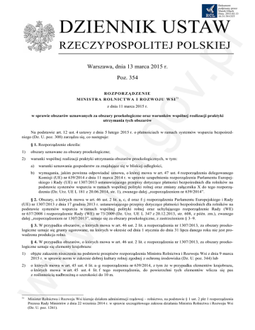 Dokument podpisany przez Marek Głuch Data: 2015.03.13 16:31:58 CET l.g ov .pl DZIENNIK USTAW RZECZYPOSPOLITEJ POLSKIEJ Warszawa, dnia 13 marca 2015 r. Poz. 354 RO ZP O R ZĄ D ZE N I E M INI S TR A R O L N IC T WA I RO ZW O J U W S I 1) z dnia 11 marca 2015 r. w sprawie obszarów uznawanych za obszary proekologiczne oraz warunków wspólnej realizacji praktyki utrzymania tych obszarów Na podstawie art. 12 ust. 4 ustawy z dnia 5 lutego 2015 r. o płatnościach w ramach systemów wsparcia bezpośredniego (Dz. U. poz. 308) zarządza się, co następuje: § 1. Rozporządzenie określa: 1) obszary uznawane za obszary proekologiczne; 2) warunki wspólnej realizacji praktyki utrzymania obszarów proekologicznych, w tym: a) warunki uznawania gospodarstw za znajdujące się w bliskiej odległości, w. rc b) wymagania, jakim powinna odpowiadać umowa, o której mowa w art. 47 ust. 4 rozporządzenia delegowanego Komisji (UE) nr 639/2014 z dnia 11 marca 2014 r. w sprawie uzupełnienia rozporządzenia Parlamentu Europejskiego i Rady (UE) nr 1307/2013 ustanawiającego przepisy dotyczące płatności bezpośrednich dla rolników na podstawie systemów wsparcia w ramach wspólnej polityki rolnej oraz zmiany załącznika X do tego rozporządzenia (Dz. Urz. UE L 181 z 20.06.2014, str. 1), zwanego dalej „rozporządzeniem nr 639/2014”. § 2. Obszary, o których mowa w art. 46 ust. 2 lit. a, c, d oraz f–j rozporządzenia Parlamentu Europejskiego i Rady (UE) nr 1307/2013 z dnia 17 grudnia 2013 r. ustanawiającego przepisy dotyczące płatności bezpośrednich dla rolników na podstawie systemów wsparcia w ramach wspólnej polityki rolnej oraz uchylającego rozporządzenie Rady (WE) nr 637/2008 i rozporządzenie Rady (WE) nr 73/2009 (Dz. Urz. UE L 347 z 20.12.2013, str. 608, z późn. zm.), zwanego dalej „rozporządzeniem nr 1307/2013”, uznaje się za obszary proekologiczne, z zastrzeżeniem § 3–9. § 3. W przypadku obszarów, o których mowa w art. 46 ust. 2 lit. a rozporządzenia nr 1307/2013, za obszary proekologiczne uznaje się grunty ugorowane, na których w okresie od dnia 1 stycznia do dnia 31 lipca danego roku nie jest prowadzona produkcja rolna. ww § 4. W przypadku obszarów, o których mowa w art. 46 ust. 2 lit. c rozporządzenia nr 1307/2013, za obszary proekologiczne uznaje się elementy krajobrazu: 1) objęte zakazem niszczenia na podstawie przepisów rozporządzenia Ministra Rolnictwa i Rozwoju Wsi z dnia 9 marca 2015 r. w sprawie norm w zakresie dobrej kultury rolnej zgodnej z ochroną środowiska (Dz. U. poz. 344) lub 2) o których mowa w art. 45 ust. 4 lit. a–g rozporządzenia nr 639/2014, z tym że w przypadku elementów krajobrazu, o których mowa w art. 45 ust. 4 lit. f tego rozporządzenia, do powierzchni tych elementów wlicza się pas z roślinnością nadbrzeżną o szerokości do 10 m. 1) Minister Rolnictwa i Rozwoju Wsi kieruje działem administracji rządowej – rolnictwo, na podstawie § 1 ust. 2 pkt 1 rozporządzenia Prezesa Rady Ministrów z dnia 22 września 2014 r. w sprawie szczegółowego zakresu działania Ministra Rolnictwa i Rozwoju Wsi (Dz. U. poz. 1261). Dziennik Ustaw –2– Poz. 354 1) l.g ov .pl § 5. 1. W przypadku obszarów, o których mowa w art. 46 ust. 2 lit. d rozporządzenia nr 1307/2013, za obszary proekologiczne uznaje się: strefy buforowe spełniające wymagania: a) w zakresie odległości, w jakich stosuje się nawozy na gruntach rolnych graniczących z obiektami, o których mowa w § 3 ust. 1 rozporządzenia Ministra Rolnictwa i Rozwoju Wsi z dnia 9 marca 2015 r. w sprawie norm w zakresie dobrej kultury rolnej zgodnej z ochroną środowiska, określone na podstawie przepisów w sprawie szczegółowego sposobu stosowania nawozów oraz prowadzenia szkoleń z zakresu ich stosowania, oraz b) o których mowa w art. 45 ust. 5 rozporządzenia nr 639/2014, lub 2) inne strefy ustanowione zgodnie z art. 45 ust. 5 rozporządzenia nr 639/2014 o szerokości nie mniejszej niż 1 metr i nie większej niż 10 metrów, do których powierzchni dopuszcza się wliczenie wzdłuż cieku wodnego pasa z roślinnością nadbrzeżną o szerokości do 10 m. 2. Obszary, o których mowa w ust. 1, na których jest prowadzony wypas lub koszenie, uznaje się za obszary proekologiczne, jeżeli został spełniony warunek, o którym mowa w art. 45 ust. 5 zdanie ostatnie rozporządzenia nr 639/2014. § 6. 1. W przypadku obszarów, o których mowa w art. 46 ust. 2 lit. f rozporządzenia nr 1307/2013, za obszary proekologiczne uznaje się pasy kwalifikujących się hektarów wzdłuż obrzeży lasu o szerokości nie mniejszej niż 1 metr i nie większej niż 10 metrów, na których: 1) nie jest prowadzona produkcja rolna albo 2) jest prowadzona produkcja rolna. 2. Na obszarach, o których mowa w ust. 1 pkt 1, dopuszcza się prowadzenie wypasu lub koszenia, jeżeli został spełniony warunek, o którym mowa w art. 45 ust. 7 zdanie drugie rozporządzenia nr 639/2014. § 7. W przypadku obszarów, o których mowa w art. 46 ust. 2 lit. g rozporządzenia nr 1307/2013, za obszary proekologiczne uznaje się zagajniki o krótkiej rotacji: które zostały utworzone przez uprawę gatunków drzew z rodzaju wierzba, brzoza albo topola czarna lub jej krzyżówki oraz 2) na których nie stosuje się środków ochrony roślin, a stosowanie nawozów mineralnych jest dopuszczone w dawkach nieprzekraczających: w. rc 1) a) 20 kg/ha N, 20 kg/ha P2O5 i 40 kg/ha K2O – w roku założenia plantacji oraz b) 80 kg/ha N, 30 kg/ha P2O5 i 80 kg/ha K2O – w roku następującym po zbiorze roślin. § 8. 1. W przypadku obszarów, o których mowa w art. 46 ust. 2 lit. i rozporządzenia nr 1307/2013, za obszary proekologiczne uznaje się obszary, które zostały utworzone przez: 1) 2) wsiewki trawy w uprawę główną albo wysianie mieszanki składającej się co najmniej z dwóch gatunków roślin z następujących grup: a) zboża, b) oleiste, c) pastewne, ww d) bobowate drobnonasienne, e) bobowate gru