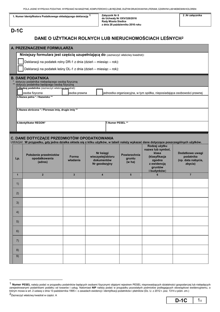 POLA JASNE WYPEŁNIA PODATNIK. WYPEŁNIAĆ NA MASZYNIE, KOMPUTEROWO LUB RĘCZNIE, DUŻYMI DRUKOWANYMI LITERAMI, CZARNYM LUB NIEBIESKIM KOLOREM. 1. Numer Identyfikatora Podatkowego składającego deklarację 1 Załącznik Nr 8 do Uchwały Nr XXV/326/2016 Rady Miasta Siedlce z dnia 28 października 2016 roku 2 .Nr załącznika D-1C DANE O UŻYTKACH ROLNYCH LUB NIERUCHOMOŚCIACH LEŚNYCH 2 A. PRZEZNACZENIE FORMULARZA Niniejszy formularz jest częścią uzupełniającą do (zaznaczyć właściwy kwadrat): Deklaracji na podatek rolny DR-1 z dnia (dzień – miesiąc – rok): Deklaracji na podatek leśny DL-1 z dnia (dzień – miesiąc – rok): B. DANE PODATNIKA * dotyczy podatnika niebędącego osobą fizyczną ** dotyczy podatnika będącego osobą fizyczną 3.Rodzaj podatnika (zaznaczyć właściwy kwadrat): osoba fizyczna osoba prawna jednostka organizacyjna, w tym spółka, nieposiadająca osobowości prawnej 4.Nazwa pełna * / Nazwisko ** 5.Nazwa skrócona * / Pierwsze imię, drugie imię ** 6.Identyfikator REGON* 7.Numer PESEL ** C. DANE DOTYCZĄCE PRZEDMIOTÓW OPODATKOWANIA UWAGA! W przypadku, gdy jedna działka składa się z kilku użytków, w tabeli należy wykazać dane dotyczące poszczególnych użytków. Rodzaj użytku nazwa lub symbol, Nr księgi klasa Dodatkowe uwagi Położenie przedmiotów Powierzchnia Forma wieczystej/zbioru (klasyfikacja podatnika Lp. opodatkowania gruntu władania dokumentów zgodna (np. data nabycia, (adres) (w ha) Nr geodezyjny z ewidencją zbycia) gruntów i budynków) 1 2 3 4 5 6 7 1) 2) 3) 4) 5) 6) 7) 8) 9) 1 Numer PESEL należy podać w przypadku podatników będących osobami fizycznymi objętymi rejestrem PESEL nieprowadzących działalności gospodarczej lub niebędących zarejestrowanymi podatnikami podatku od towarów i usług. Natomiast NIP należy podać w przypadku pozostałych podmiotów podlegających obowiązkowi ewidencyjnemu, o którym mowa w art. 2 ustawy z dnia 13 października 1995 r. o zasadach ewidencji i identyfikacji podatników i płatników (Dz. U. z 2012 r. poz. 1314 z późn. zm.) 2Zaznaczyć właściwy kwadrat w części. A D-1C 1/2 POLA JASNE WYPEŁNIA PODATNIK. WYPEŁNIAĆ NA MASZYNIE, KOMPUTEROWO LUB RĘCZNIE, DUŻYMI DRUKOWANYMI LITERAMI, CZARNYM LUB NIEBIESKIM KOLOREM. 1 2 3 4 5 6 7 10) 11) 12) 13) 14) 15) 16) 17) OGÓŁEM - POWIERZCHNIA (w ha) D. PODPIS PODATNIKA LUB OSOBY REPREZENTUJĄCEJ PODATNIKA 8. Imię 9. Nazwisko 10. Data wypełnienia załącznika (dzień – miesiąc – rok) 11. Imię, nazwisko, podpis i pieczęć osoby składającej deklarację 12. Imię, nazwisko, podpis i pieczęć osoby reprezentującej składającego deklarację WYZERUJ D-1C 2/2 DRUKUJ