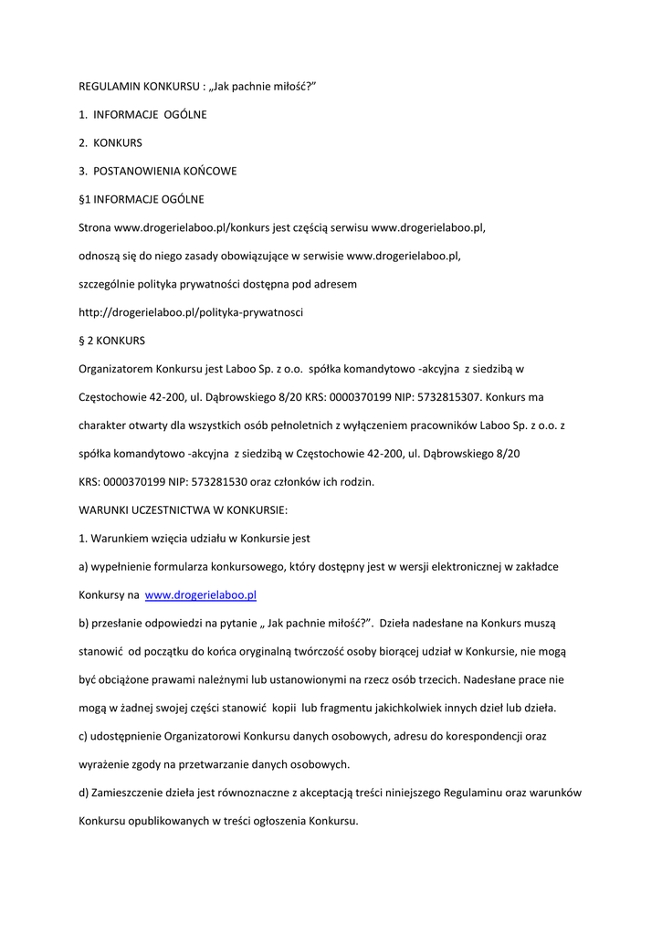 REGULAMIN KONKURSU : „Jak pachnie miłośd?” 1. INFORMACJE OGÓLNE 2. KONKURS 3. POSTANOWIENIA KOOCOWE §1 INFORMACJE OGÓLNE Strona www.drogerielaboo.pl/konkurs jest częścią serwisu www.drogerielaboo.pl, odnoszą się do niego zasady obowiązujące w serwisie www.drogerielaboo.pl, szczególnie polityka prywatności dostępna pod adresem http://drogerielaboo.pl/polityka-prywatnosci § 2 KONKURS Organizatorem Konkursu jest Laboo Sp. z o.o. spółka komandytowo -akcyjna z siedzibą w Częstochowie 42-200, ul. Dąbrowskiego 8/20 KRS: 0000370199 NIP: 5732815307. Konkurs ma charakter otwarty dla wszystkich osób pełnoletnich z wyłączeniem pracowników Laboo Sp. z o.o. z spółka komandytowo -akcyjna z siedzibą w Częstochowie 42-200, ul. Dąbrowskiego 8/20 KRS: 0000370199 NIP: 573281530 oraz członków ich rodzin. WARUNKI UCZESTNICTWA W KONKURSIE: 1. Warunkiem wzięcia udziału w Konkursie jest a) wypełnienie formularza konkursowego, który dostępny jest w wersji elektronicznej w zakładce Konkursy na www.drogerielaboo.pl b) przesłanie odpowiedzi na pytanie „ Jak pachnie miłośd?”. Dzieła nadesłane na Konkurs muszą stanowid od początku do kooca oryginalną twórczośd osoby biorącej udział w Konkursie, nie mogą byd obciążone prawami należnymi lub ustanowionymi na rzecz osób trzecich. Nadesłane prace nie mogą w żadnej swojej części stanowid kopii lub fragmentu jakichkolwiek innych dzieł lub dzieła. c) udostępnienie Organizatorowi Konkursu danych osobowych, adresu do korespondencji oraz wyrażenie zgody na przetwarzanie danych osobowych. d) Zamieszczenie dzieła jest równoznaczne z akceptacją treści niniejszego Regulaminu oraz warunków Konkursu opublikowanych w treści ogłoszenia Konkursu. e)wzięcie udziału w konkursie jest jednoznaczne z wyrażeniem zgody na publikacje dzieła. 2. Podczas przyznawania nagród będą brane pod uwagę wyłącznie zgłoszenia, w których uczestnik wypełni wszystkie wymagane w Regulaminie pola. Organizator nie odpowiada za brak możliwości dokonania zgłoszenia z przyczyn niezależnych od Organizatora np. ze względu na czasowe usterki serwera. 3. Podczas przyznawania nagród będą brane pod uwagę wyłącznie zgłoszenia osób, które podały adres na terytorium Rzeczpospolitej Polskiej. 4. O terminowości zgłoszenia się do Konkursu decyduje termin wpłynięcia do Organizatora wypełnionego Formularza. 5. Przesłane zgłoszenia nie mogą byd wycofane. 6. Lista Zwycięzców zostanie opublikowana w serwisie www.drogerielaboo.pl/konkurs. Konkurs zostanie rozstrzygnięty do 10.10.2013 r. O wyniku rozstrzygnięcia poinformujemy Zwycięzców drogą mailową oraz na stronie www.drogerielaboo.pl/konkurs Organizator nie odpowiada za czynniki nie leżące po stronie Organizatora, mogące wpłynąd na opóźnienie lub niedostarczenie informacji do Zwycięzcy. CZAS TRWANIA KONKURSU 7. Decyzja o wyłonieniu Zwycięzców jest ostateczna. Konkurs trwa w okresie od 17.09.2013 do 01.10.2013 PRZYZNAWANIE NAGRÓD: Jury konkursowe powołane przez Organizatora wyłoni Zwycięzcę spośród osób, które spełniły warunki Konkursu i nadesłały swoje zgłoszenia w podanym w Regulaminie terminie. NAGRODĄ W KONKURSIE JEST: Dla autorów 5 najciekawszych odpowiedzi zestawy wód perfumowanych JFENZI. Prace zostaną wybrane przez jury. 22§ 3. POSTANOWIENIA KOOCOWE 1. Do spraw nie ujętych w niniejszym Regulaminie, stosuje się odpowiednio przepisy Kodeksu Cywilnego oraz ustawy o prawie autorskim i prawach pokrewnych. 2. Organizator zastrzega sobie prawo do przedłużenia okresu Konkursu oraz zmiany daty i zasad ogłoszenia wyników Konkursu. 3. Osoby wypełniające Formularz jednocześnie wyrażają zgodę, że z chwilą zgłoszenia przekazują nieodpłatnie na rzecz Organizatora wszelkie prawa autorskie majątkowe do eksploatacji zgłoszonych projektów na wszelkich polach eksploatacji oraz wyrażają zgodę na dowolną ich modyfikację. 4. Zgłoszenie do udziału w Konkursie jest równoznaczne z akceptacją niniejszego Regulaminu. 5. Organizator zastrzega sobie prawo do przerwania lub zmiany zasad Konkursu w każdym momencie jego trwania bez konieczności podawania przyczyn. 6. Osoby biorące udział w Konkursie wyrażają zgodę na umieszczenie swoich danych osobowych w bazie danych Organizatora oraz na ich przetwarzanie dla potrzeb konkursu, zgodnie z ustawą z dnia 29. 08. 1997 o Ochronie Danych Osobowych. Poprzez przetwarzanie danych na potrzeby konkursu rozumie się w szczególności działania w celu opublikowania wyników Konkursu oraz przekazania laureatom nagród konkursowych. Uczestnikowi Konkursu przysługuje prawo wglądu do swoich danych oraz ich poprawiania. Organizator informuje, iż dane osobowe laureatów mogą zostad opublikowane na stronach internetowych sieci Drogerii Laboo przy okazji podawania wyników jego rozstrzygnięcia. 7. Do spraw nie ujętych w niniejszym Regulaminie, stosuje się odpowiednio przepisy Kodeksu Cywilnego oraz ustawy z dnia 4 lutego 1994 r. o prawie autorskim i prawach pokrewnych. Laboo Sp. z o.o. SKA zastrzega sobie prawo zmiany zasad postanowieo Regulaminu. 8. Sądem właściwym dla rozpatrywania wszelkich sporów jest sąd właściwy dla Laboo Sp. z o.o. SKA 9. Zgłoszenie do udziału w Konkursie jest równoznaczne z akceptacją niniejszego Regulaminu. 10. Organizator zastrzega sobie prawo do przerwania lub zmiany zasad konkursu w każdym momencie jego trwania bez konieczności podawania przyczyn.