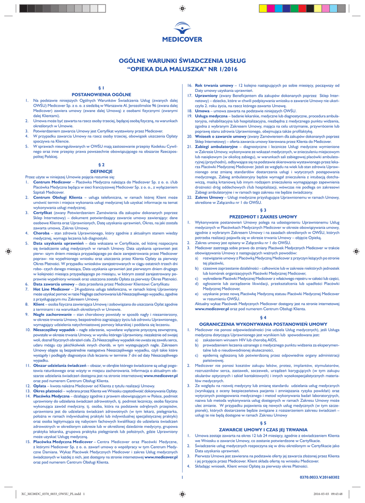 OGÓLNE WARUNKI ŚWIADCZENIA USŁUG “OPIEKA DLA MALUSZKA” NR 1/2016 16. Rok trwania umowy – 12 kolejno następujących po sobie miesięcy, począwszy od Daty umowy uzyskania uprawnień. 17. Uprawniony (zwany Beneficjentem dla zakupów dokonanych poprzez Sklep Internetowy) – dziecko, które w chwili podpisywania wniosku o zawarcie Umowy nie ukończyło 2. roku życia, na rzecz którego zawarto Umowę. 18. Umowa – umowa zawarta na podstawie niniejszych OWŚU. 19. Usługa medyczna – badanie lekarskie, medyczne lub diagnostyczne, procedura ambulatoryjna, rehabilitacyjna lub hospitalizacyjna, niezbędna z medycznego punktu widzenia, zgodna z wybranym Zakresem Umowy, mająca na celu utrzymanie, przywrócenie lub poprawę stanu zdrowia Uprawnionego, obejmująca także profilaktykę. 20. Wniosek o zawarcie umowy (zwany Zamówieniem dla zakupów dokonanych poprzez Sklep Internetowy) – oferta zawarcia umowy kierowana przez Klienta do Medicover. 21. Zabiegi ambulatoryjne – diagnostyczne i lecznicze Usługi medyczne wymienione w Zakresie Umowy, wykonywane ze wskazań medycznych, w znieczuleniu miejscowym lub nasiękowym (w okolicę zabiegu), w warunkach sali zabiegowej placówki ambulatoryjnej (przychodni), odbywające się na podstawie skierowania wystawionego przez lekarza Placówki Medycznej Medicover. Jeżeli ze względu na wiek lub stan zdrowia Uprawnionego oraz zmianę standardów dostarczenia usługi i wytycznych postępowania medycznego, Zabieg ambulatoryjny będzie wymagał znieczulenia z intubacją dotchawiczą, maską krtaniową lub innym rodzajem znieczulenia wymagającego zapewnienia drożności dróg oddechowych i/lub hospitalizacji, wówczas nie podlega on zakresowi Zabiegi ambulatoryjne i w ramach tego zakresu nie będzie świadczony. 22. Zakres Umowy – Usługi medyczne przysługujące Uprawnionemu w ramach Umowy, określone w Załączniku nr 1 do OWŚU. §1 POSTANOWIENIA OGÓLNE 1. 2. 3. 4. 5. Na podstawie niniejszych Ogólnych Warunków Świadczenia Usług (zwanych dalej OWŚU) Medicover Sp. z o. o. z siedzibą w Warszawie Al. Jerozolimskie 96 (zwana dalej Medicover) zawiera umowy (zwane dalej Umową) z osobami fizycznymi (zwanymi dalej Klientami). Umowa może być zawarta na rzecz osoby trzeciej, będącej osobą fizyczną, na warunkach określonych w Umowie. Potwierdzeniem zawarcia Umowy jest Certyfikat wystawiony przez Medicover. W przypadku zawarcia Umowy na rzecz osoby trzeciej, obowiązek uiszczenia Opłaty spoczywa na Kliencie. W sprawach nieuregulowanych w OWŚU mają zastosowanie przepisy Kodeksu Cywilnego oraz inne przepisy prawa powszechnie obowiązującego na obszarze Rzeczpospolitej Polskiej. §2 DEFINICJE Przez użyte w niniejszej Umowie pojęcia rozumie się: 1. Centrum Medicover – Placówka Medyczna należąca do Medicover Sp. z o. o. i/lub Placówka Medyczna będąca w sieci franczyzowej Medicover Sp. z o. o., z wyłączeniem Szpitali Medicover. 2. Centrum Obsługi Klienta – usługa telefoniczna, w ramach której Klient może umówić termin i miejsce wykonania usługi medycznej lub uzyskać informacje na temat wykonywania usługi medycznej. 3. Certyfikat (zwany Potwierdzeniem Zamówienia dla zakupów dokonanych poprzez Sklep Internetowy) – dokument potwierdzający zawarcie umowy zawierający: dane osobowe Klienta oraz Uprawnionych, Datę uzyskania uprawnień, Okres, na jaki została zawarta umowa, Zakres Umowy. 4. Choroba – stan zdrowia Uprawnionego, który zgodnie z aktualnym stanem wiedzy medycznej, wymaga leczenia lub diagnostyki. 5. Data uzyskania uprawnień – data wskazana w Certyfikacie, od której rozpoczyna się świadczenie usług medycznych w ramach Umowy. Data uzyskania uprawnień jest pierw- szym dniem miesiąca przypadającego po dacie zarejestrowania przez Medicover popraw- nie wypełnionego wniosku oraz uiszczenia przez Klienta Opłaty za pierwszy Okres Płatności. W przypadku wniosków zarejestrowanych w ciągu ostatnich trzech dni robo- czych danego miesiąca, Data uzyskania uprawnień jest pierwszym dniem drugiego w kolejności miesiąca przypadającego po miesiącu, w którym został zarejestrowany poprawnie wypełniony wniosek oraz uiszczona została Opłata za pierwszy Okres Płatności. 6. Data zawarcia umowy – data przesłania przez Medicover Klientowi Certyfikatu 7. Hot Line Medicover – 24-godzinna usługa telefoniczna, w ramach której Uprawniony może uzyskać pomoc w razie Nagłego zachorowania lub Nieszczęśliwego wypadku, zgodnie z przysługującym mu Zakresem Umowy. 8. Klient – osoba fizyczna zawierająca Umowę i zobowiązana do uiszczania Opłat zgodnie z terminami i na warunkach określonych w Umowie. 9. Nagłe zachorowanie – stan chorobowy powstały w sposób nagły i niezamierzony, w okresie trwania Umowy, bezpośrednio zagrażający życiu lub zdrowiu Uprawnionego, wymagający udzielenia natychmiastowej pomocy lekarskiej i poddania się leczeniu. 10. Nieszczęśliwy wypadek – nagłe zdarzenie, wywołane wyłącznie przyczyną zewnętrzną, powstałe w okresie trwania Umowy, w wyniku którego Uprawniony, niezależnie od swojej woli, doznał fizycznych obrażeń ciała. Za Nieszczęśliwy wypadek nie uważa się zawału serca, udaru mózgu czy jakichkolwiek innych chorób, w tym występujących nagle. Zakresem Umowy objęte są bezpośrednie następstwa Nieszczęśliwego wypadku, czyli takie które wystąpiły i podlegały diagnostyce i/lub leczeniu w terminie 7 dni od daty Nieszczęśliwego wypadku. 11. Obszar udzielania świadczeń – obszar, w obrębie którego świadczone są usługi pogotowia ratunkowego oraz wizyty w miejscu zachorowania. Informacja o aktualnym obszarze udzielania świadczeń dostępna jest na stronie internetowej www.medicover.pl oraz pod numerem Centrum Obsługi Klienta. 12. Opłata – kwota należna Medicover od Klienta z tytułu realizacji Umowy. 13. Okres płatności – wybrana przez Klienta we Wniosku częstotliwość dokonywania Opłaty. 14. Placówka Medyczn