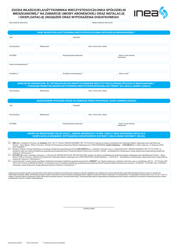 ZGODA WŁAŚCICIELA/UŻYTKOWNIKA WIECZYSTEGO/CZŁONKA SPÓŁDZIELNI MIESZKANIOWEJ* NA ZAWARCIE UMOWY ABONENCKIEJ ORAZ INSTALACJĘ I EKSPLOATACJĘ URZĄDZEŃ ORAZ WYPOSAŻENIA DODATKOWEGO Data złożenia dokumentu: Miejsce złożenia dokumentu: DANE WŁAŚCICIELA/UŻYTKOWNIKA WIECZYSTEGO/CZŁONKA SPÓŁDZIELNI MIESZKANIOWEJ * Imię Nazwisko Kod pocztowy Miejscowość Nr PESEL Ulica, numer domu, lokalu Rodzaj dowodu tożsamości Seria i numer dowodu tożsamości Adres do korespondencji ** Nr telefonu ** Nr telefonu komórkowego ** Adres e-mail ** NINIEJSZYM OŚWIADCZAM, ŻE JESTEM WŁAŚCICIELEM/UŻYTKOWNIKIEM WIECZYSTYM/CZŁONKIEM SPÓŁDZIELNI MIESZKANIOWEJ * I POSIADAM PRAWO WŁASNOŚCI/UŻYTKOWANIA WIECZYSTEGO/SPÓŁDZIELCZE PRAWO* DO LOKALU (ADRES LOKALU) Kod pocztowy Miejscowość Ulica, numer domu, lokalu JEDNOCZEŚNIE WYRAŻAM ZGODĘ NA ZAWARCIE PRZEZ PANA/PANIĄ* (DANE ZAMAWIAJĄCEGO) Imię Nazwisko Kod pocztowy Miejscowość Nr PESEL Ulica, numer domu, lokalu Rodzaj dowodu tożsamości Seria i numer dowodu tożsamości UMOWY NA ŚWIADCZENIE USŁUG (DALEJ „UMOWA ABONENCKA”) W WW. LOKALU ORAZ DOKONANIE INSTALACJI I EKSPLOATACJI URZĄDZEŃ I WYPOSAŻENIA DODATKOWEGO DOSTAWCY USŁUG (DANE DOSTAWCY USŁUG): INEA S.A. z siedzibą w Poznaniu, ul. Kolejowa 19/21, 60-717 Poznań, REGON 630239680, NIP 779-10-02-618, wpisana do rejestru przedsiębiorców Krajowego Rejestru Sądowego przez Sąd Rejonowy Poznań – Nowe Miasto i Wilda w Poznaniu, Wydział VIII Gospodarczy Krajowego Rejestru Sądowego pod nr KRS 0000056936, kapitał zakładowy – 4.533.000,00 zł, w całości wpłacony, nr rejestrowy GIOŚ: E0011196WBW.*** Mirosław Warguła i Tomasz Wąsikowski, prowadzący działalność gospodarczą pod firmą PUH ANTECH s.c. z siedzibą w Poznaniu, przy ul. Głogowskiej 93/21, REGON 632268762, NIP 779-10-75-876, na podstawie wpisu do ewidencji działalności gospodarczej prowadzonej przez Prezydenta Miasta Poznania pod numerem 1220/90 – przedsiębiorców świadczących usługi dostarczania drogą kablową programów radiowych i telewizyjnych,*** CITY-NET Sp. z o.o. z siedzibą w Poznaniu, ul. Gronowa 22, REGON 631017242, NIP 972-08-24-656, wpisana do rejestru przedsiębiorców Krajowego Rejestru Sądowego przez Sąd Rejonowy Poznań – Nowe Miasto i Wilda w Poznaniu, Wydział VIII Gospodarczy Krajowego Rejestru Sądowego pod nr KRS 0000105789, kapitał zakładowy – 4.340.000 zł, – przedsiębiorcy świadczącego usługi dostarczania drogą kablową programów radiowych i telewizyjnych,*** Leszek Kamiński, Leszek Chęcik oraz Marcin Sedlaczek prowadzący działalność gospodarczą pod firmą „PROSAT” s.c. Systemy Antenowe z siedzibą w Poznaniu, przy ul. Umińskiego 10E, 61 – 517 Poznań, NIP 783-10-02-318 oraz nr REGON 631528741 na podstawie wpisu do ewidencji działalności gospodarczej prowadzonej przez Prezydenta Miasta Poznania pod numerami: 13182/2001, 13181/2001 oraz 13183/2001 – świadczący usługi dostarczania drogą kablową programów radiowych i telewizyjnych.*** Jednoczesnie wyrażam zgodę na przetwarzanie moich danych osobowych wymienionych powyżej w zakresie niezbędnym do realizacji w/w Umowy abonenckiej, przez Administratorów danych, przez co rozumie się właściwego Dostawcę Usług, określonego powyżej. Osobie, której dane osobowe dotyczą, przysługuje prawo wglądu do własnych danych osobowych i ich poprawiania. W przypadkach wymienionych w art. 23 ust. 1 pkt 4 i 5 ustawy o ochronie danych osobowych osoba, której dane osobowe dotyczą, ma prawo pisemnego, umotywowanego żądania zaprzestania przetwarzania swoich danych osobowych oraz prawo wniesienia sprzeciwu wobec przetwarzania danych w celach marketingowych. Czytelny podpis *niepotrzebne skreślić **dane dobrowolne *** właściwe zaznaczyć krzyżykiem