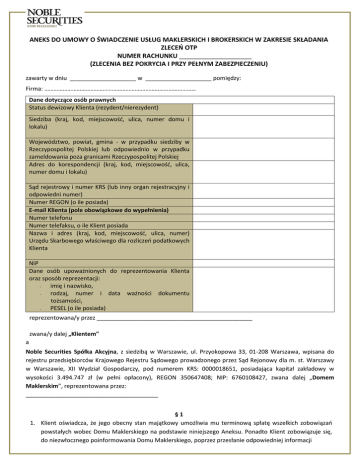 ANEKS DO UMOWY O ŚWIADCZENIE USŁUG MAKLERSKICH I BROKERSKICH W ZAKRESIE SKŁADANIA ZLECEŃ OTP NUMER RACHUNKU ____________________ (ZLECENIA BEZ POKRYCIA I PRZY PEŁNYM ZABEZPIECZENIU) zawarty w dniu ____________________ w ____________________ pomiędzy: Firma: ……………………………………………………………………………………… Dane dotyczące osób prawnych Status dewizowy Klienta (rezydent/nierezydent) Siedziba (kraj, kod, miejscowość, ulica, numer domu i lokalu) Województwo, powiat, gmina - w przypadku siedziby w Rzeczypospolitej Polskiej lub odpowiednio w przypadku zameldowania poza granicami Rzeczypospolitej Polskiej Adres do korespondencji (kraj, kod, miejscowość, ulica, numer domu i lokalu) Sąd rejestrowy i numer KRS (lub inny organ rejestracyjny i odpowiedni numer) Numer REGON (o ile posiada) E-mail Klienta (pole obowiązkowe do wypełnienia) Numer telefonu Numer telefaksu, o ile Klient posiada Nazwa i adres (kraj, kod, miejscowość, ulica, numer) Urzędu Skarbowego właściwego dla rozliczeń podatkowych Klienta NIP Dane osób upoważnionych do reprezentowania Klienta oraz sposób reprezentacji: imię i nazwisko, rodzaj, numer i data ważności dokumentu tożsamości, PESEL (o ile posiada) reprezentowana/y przez _______________________________________________ zwana/y dalej „Klientem" a Noble Securities Spółka Akcyjna, z siedzibą w Warszawie, ul. Przyokopowa 33, 01-208 Warszawa, wpisana do rejestru przedsiębiorców Krajowego Rejestru Sądowego prowadzonego przez Sąd Rejonowy dla m. st. Warszawy w Warszawie, XII Wydział Gospodarczy, pod numerem KRS: 0000018651, posiadająca kapitał zakładowy w wysokości 3.494.747 zł (w pełni opłacony), REGON 350647408; NIP: 6760108427, zwana dalej „Domem Maklerskim”, reprezentowana przez: ________________________________________ §1 1. Klient oświadcza, że jego obecny stan majątkowy umożliwia mu terminową spłatę wszelkich zobowiązań powstałych wobec Domu Maklerskiego na podstawie niniejszego Aneksu. Ponadto Klient zobowiązuje się, do niezwłocznego poinformowania Domu Maklerskiego, poprzez przesłanie odpowiedniej informacji 2. 3. 4. 5. z e-mail Klienta na e-mail Domu Maklerskiego, o każdej zmianie stanu majątkowego Klienta uniemożliwiającej lub ograniczającej terminową spłatę zobowiązań powstałych wobec Domu Maklerskiego na podstawie niniejszego Aneksu. Klient i Dom Maklerski ustalają, że: 1) niniejszy Aneks stanowi integralną część „Umowy o świadczenie usług brokerskich i maklerskich" zawartej pomiędzy Domem Maklerskim i Klientem, 2) do w/w „Umowy o świadczenie usług brokerskich i maklerskich" wprowadzają niżej ustalone uzupełnienia w zakresie umożliwiającym Klientowi składanie Zleceń OTP na podstawie § 42 ust. 1 pkt 3 Rozporządzenia Ministra Finansów z dnia 28 grudnia 2005r. w sprawie trybu i warunków postępowania firm inwestycyjnych oraz banków powierniczych (Dz.U. z 2006 r. Nr 2, poz. 8), zwanego dalej „Rozporządzeniem", o ile Klient, w chwili wystawienia przez Dom Maklerski zlecenia brokerskiego, posiada ustanowione zabezpieczenia określone w § 45 ust. 2 lub 3 Rozporządzenia na całkowitą wartość zlecenia i przewidywanej prowizji, w rozumieniu „Regulaminu świadczenia przez NOBLE Securities S.A. usług maklerskich i brokerskich oraz prowadzenia rachunków papierów wartościowych i rachunków pieniężnych", zwanego dalej „Regulaminem", stanowiącego załącznik do w/w umowy, 3) zabezpieczenie, o którym mowa w pkt 2, stanowią, określone w Uchwale Zarządu Domu Maklerskiego, MIF Klienta zapisane na w/w Rachunku Klienta, a Klient zobowiązuje się, że, do czasu zapłaty za MIF zakupione na podstawie Zlecenia OTP, wystawianego na podstawie niniejszego Aneksu, na w/w Rachunku Klienta, będzie utrzymywał na w/w Rachunku Klienta zabezpieczenie w MIF i w wysokości określonych w Uchwale Zarządu Domu Maklerskiego. Klient jest zobowiązany dokonać zapłaty za MIF zakupione na podstawie Zlecenia OTP, wystawianego na podstawie niniejszego Aneksu, na w/w Rachunku Klienta, najpóźniej w dniu rozrachunku transakcji we właściwej izbie rozrachunkowej, w wysokości zobowiązań Klienta wobec Domu Maklerskiego z tytułu zawartych transakcji kupna MIF, pomniejszonych o należności Klienta z tytułu zawartych transakcji sprzedaży MIF, rozliczanych we właściwej izbie rozrachunkowej w tym dniu. Zasady dokonania zapłaty określa Regulamin. Klient oświadcza, że niniejszym udziela pełnomocnictwa dla Domu Maklerskiego do: 1) sprzedaży MIF lub praw do otrzymania MIF stanowiących zabezpieczenie do wysokości roszczenia Domu Maklerskiego z tytułu nieopłacenia przez Klienta transakcji kupna MIF wraz z prowizją zrealizowanych na podstawie Zleceń OTP, wystawianych na podstawie niniejszego Aneksu, na w/w Rachunku Klienta, a także wraz z ewentualnymi innymi opłatami należnymi dla Domu Maklerskiego zgodnie z Tabelą opłat i prowizji, 2) sprzedaży dowolnych MIF lub praw do otrzymania MIF znajdujących się na w/w Rachunku Klienta, jeżeli, w czasie trwania danej sesji, wartość aktywów na w/w Rachunku Klienta, obniży się do wysokości zobowiązań Klienta z tytułu Zleceń OTP, wystawianych na podstawie niniejszego Aneksu, na w/w Rachunku Klienta, 3) do zaspokojenia się z aktywów Klienta znajdujących się na wszystkich rachunkach Klienta, w ewidencji i w rejestrze operacyjnym Klienta prowadzonych przez Dom Maklerski lub przechowywanych przez Dom Maklerski na rzecz Klienta w Domu Maklerskim do wysokości roszczenia Domu Maklerskiego z tytułu nieopłacenia przez Klienta transakcji kupna MIF wraz z prowizją zrealizowanych na podstawie Zleceń OTP, wystawianych na podstawie niniejszego Aneksu, na w/w Rachunku Klienta, a także wraz z ewentualnymi innymi opłatami należnymi dla Domu Maklerskiego zgodnie z Tabelą opłat i prowizji. Opłaty skarbowe, podatki lub inne wydatki z tytułu udzielonych przez Klienta pełnomocnic