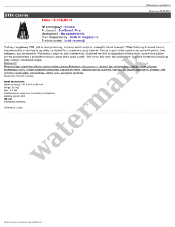 Informacje o produkcie Utworzono 08-03-2017 STIX czarny Cena : 8.036,82 zł Nr katalogowy : EFOSX Producent : EcoSmart Fire Dostępność : Na zamówienie Stan magazynowy : brak w magazynie Średnia ocena : brak recenzji Projektant: Hiroshi Tsunoda er m ar k Stylowy i wyjątkowy STIX jest w pełni przenośny, inspiruje każde wnętrze, wewnątrz lub na zewnątrz. Wszechstronny kominek tworzy niepowtarzalną atmosferę w ogrodzie, na dziedzińcu, tarasie oraz przy basenie. Tworzy czysty taniec ognia przez ponad 8 godzin, (bez bałaganu, bez problemów). Wykonany z odpornej stali nierdzewnej. EcoSmart kominki są napędzane bioetanolem, odnawialne paliwo płynne produkowane z produktów rolnych, przez które spala czyste - bez dymu, bez iskry, bez problemów. Spalania bioetanolu produkuje pary cieplne i dwutlenek węgla. Bioetanol? Bioetanol jest absolutny alkohol zwany także spirytus Bioetanol - lub po prostu "etanol" jest odnawialnym źródłem energii przez fermentacji cukru i skrobi składniki produktów ubocznych roślin - głównie trzcinę cukrową i uprawy jak zboża, przy użyciu drożdży. Jest również z kukurydzy, ziemniaków, mleka, ryżu, winogron buraków. Dane techniczne: Wymiary w/s/g: 780 x 557 x 556 mm Waga: 20,7kg Moc: 1,7 kW Zastosowanie: wewnątrz i na wolnym powietrzu Zgodny palnik: AB3 Opcja: Pokrowiec ochronny w at Gwarancja 2 lata. Wygenerowano w programie www.oscGold.com