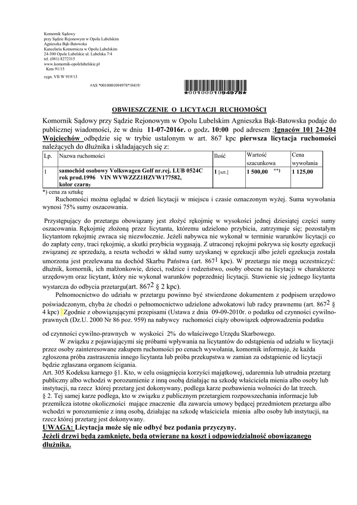 Komornik Sądowy przy Sądzie Rejonowym w Opolu Lubelskim Agnieszka Bąk-Batowska Kancelaria Komornicza w Opolu Lubelskim 24-300 Opole Lubelskie ul. Lubelska 7/4 tel. (081) 8272315 www.komornik-opolelubelskie.pl Kms 91/15 sygn. VII W 919/13 #AS *0010001094978*/0419/ *0010001094978* OBWIESZCZENIE O LICYTACJI RUCHOMOŚCI Komornik Sądowy przy Sądzie Rejonowym w Opolu Lubelskim Agnieszka Bąk-Batowska podaje do publicznej wiadomości, że w dniu 11-07-2016r. o godz. 10:00 pod adresem :Ignaców 101 24-204 Wojciechów odbędzie się w trybie ustalonym w art. 867 kpc pierwsza licytacja ruchomości należących do dłużnika i składających się z: Lp. Nazwa ruchomości samochód osobowy Volkswagen Golf nr.rej. LUB 0524C rok prod.1996 . VIN WVWZZZ1HZVW177582, kolor czarny *) cena za sztukę 1 Ilość 1 [szt.] Wartość szacunkowa 1 500,00 **) Cena wywołania 1 125,00 Ruchomości można oglądać w dzień licytacji w miejscu i czasie oznaczonym wyżej. Suma wywołania wynosi 75% sumy oszacowania. Przystępujący do przetargu obowiązany jest złożyć rękojmię w wysokości jednej dziesiątej części sumy oszacowania. Rękojmię złożoną przez licytanta, któremu udzielono przybicia, zatrzymuje się; pozostałym licytantom rękojmię zwraca się niezwłocznie. Jeżeli nabywca nie wykonał w terminie warunków licytacji co do zapłaty ceny, traci rękojmię, a skutki przybicia wygasają. Z utraconej rękojmi pokrywa się koszty egzekucji związanej ze sprzedażą, a reszta wchodzi w skład sumy uzyskanej w egzekucji albo jeżeli egzekucja została umorzona jest przelewana na dochód Skarbu Państwa (art. 8671 kpc). W przetargu nie mogą uczestniczyć: dłużnik, komornik, ich małżonkowie, dzieci, rodzice i rodzeństwo, osoby obecne na licytacji w charakterze urzędowym oraz licytant, który nie wykonał warunków poprzedniej licytacji. Stawienie się jednego licytanta wystarcza do odbycia przetargu(art. 8672 § 2 kpc). Pełnomocnictwo do udziału w przetargu powinno być stwierdzone dokumentem z podpisem urzędowo poświadczonym, chyba że chodzi o pełnomocnictwo udzielone adwokatowi lub radcy prawnemu (art. 8672 § 4 kpc) Zgodnie z obowiązującymi przepisami (Ustawa z dnia 09-09-2010r. o podatku od czynności cywilnoprawnych (Dz.U. 2000 Nr 86 poz. 959) na nabywcy ruchomości ciąży obowiązek odprowadzenia podatku od czynności cywilno-prawnych w wyskości 2% do właściwego Urzędu Skarbowego. W związku z pojawiającymi się próbami wpływania na licytantów do odstąpienia od udziału w licytacji przez osoby zainteresowane zakupem ruchomości po cenach wywołania, komornik informuje, że każda zgłoszona próba zastraszenia innego licytanta lub próba przekupstwa w zamian za odstąpienie od licytacji będzie zgłaszana organom ścigania. Art. 305 Kodeksu karnego §1. Kto, w celu osiągnięcia korzyści majątkowej, udaremnia lub utrudnia przetarg publiczny albo wchodzi w porozumienie z inną osobą działając na szkodę właściciela mienia albo osoby lub instytucji, na rzecz której przetarg jest dokonywany, podlega karze pozbawienia wolności do lat trzech. § 2. Tej samej karze podlega, kto w związku z publicznym przetargiem rozpowszechania informacje lub przemilcza istotne okoliczności mające znaczenie dla zawarcia umowy będącej przedmiotem przetargu albo wchodzi w porozumienie z inną osobą, działając na szkodę właściciela mienia albo osoby lub instytucji, na rzecz której przetarg jest dokonywany. UWAGA: Licytacja może się nie odbyć bez podania przyczyny. Jeżeli drzwi będą zamknięte, będą otwierane na koszt i odpowiedzialność obowiązanego dłużnika.
