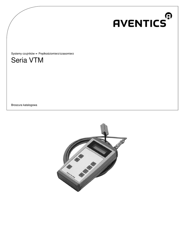 Systemy czujników ► Prędkościomierz/czasomierz Seria VTM Broszura katalogowa 2 Systemy czujników ► Prędkościomierz/czasomierz Seria VTM Prędkościomierz/czasomierz, Seria VTM Skrzynka sterująca z kablem zasilającym i adapterem Walizka z wkładką kształtową dla modułu VTM i kompletem akcesoriów. 3 Akcesoria Pogrubione numery materiałowe są dostępne w centralnym magazynie w Niemczech, informacje szczegółowe patrz Koszyk Katalog elementów pneumatycznych, PDF online, stan 2016-07-21, © AVENTICS S.à r.l., zmiany zastrzeżone 4 4 3 Systemy czujników ► Prędkościomierz/czasomierz Prędkościomierz/czasomierz, Seria VTM 00133562 Zakres pomiaru Min. 0,1 m/s Zakres pomiaru Maks. 9,99 m/s Rozdzielczość 0,01 m/s Dokładność w % (wartości końcowej) <± 0,5 % Pole magnetyczne Min. 2 mT Zakres pomiaru Min. 0,001 s Zakres pomiaru Maks. 59,9 s stopień ochrony IP40 Temperatura otoczenia min./maks. +0°C / +50°C Materiały: Obudowa Poliamid Uwagi Techniczne ■ Jeżeli na rurze cylindra zamontowany jest (objęty zakresem dostawy) czujnik prędkości, wyświetlana jest prędkość tłoka w m/s. ■ Po wybraniu przyłącza elektrycznego lub nastawnika pozycji (nie objęte zakresem dostawy) wyświetlany jest czas cyklu w ms. ■ Pasuje do wszystkich cylindrów z tłokami magnetycznymi firmy AVENTICS. Rodzaj zestyku elektroniczny PNP Numer materiałowy R402002202 Rozmiary C B A On/Off Cal. Reset Reset Enter Cal. Velocity-Time-Meter 00123799 Enter Velocity-Time-Meter 00133566 Numer materiałowy R402002202 A B C 92 165 31 Pogrubione numery materiałowe są dostępne w centralnym magazynie w Niemczech, informacje szczegółowe patrz Koszyk Katalog elementów pneumatycznych, PDF online, stan 2016-07-21, © AVENTICS S.à r.l., zmiany zastrzeżone 4 Systemy czujników ► Prędkościomierz/czasomierz Seria VTM Akcesoria Skrzynka sterująca z kablem zasilającym i adapterem 1) 3) Return 0 Start 2) 00133563 4) 5) Numer materiałowy Typ stopień ochrony R402002203 Skrzynka sterująca z kablem zasilającym i adapterem IP40 Napięcie robocze DC, max. [V] 24 Temperatura otoczenia min./max. Materiał Ad. +0 / +50 Poliamid 1) 001237990 Ruch cylindra w obu kierunkach można regulować pokrętłem skrzynki sterowniczej. Może być przyłączany tylko do zaworów z wymiennym zaworem sterującym. 1) Zakres dostawy: 1) skrzynka sterująca zaworów, 2) zasilacz, 3) kabel sterujący z wtyczką M12 (2x) , 4) kabel przedłużający do czujnika (2x), 5) kabel przyłączeniowy M8 Walizka z wkładką kształtową dla modułu VTM i kompletem akcesoriów. C A B 00133567 00133573 Numer materiałowy R402002204 A B C 370 442 90 Pogrubione numery materiałowe są dostępne w centralnym magazynie w Niemczech, informacje szczegółowe patrz Koszyk Katalog elementów pneumatycznych, PDF online, stan 2016-07-21, © AVENTICS S.à r.l., zmiany zastrzeżone AVENTICS GmbH Ulmer Straße 4 30880 Laatzen, GERMANY Phone +49 511 2136-0 Fax +49 511 2136-269 www.aventics.com [email protected] Dalsze adresy znajdują się na stronie www.aventics.com/contact Przedstawione produkty AVENTICS nadają się wyłącznie do zastosowań przemysłowych. Przed zastosowaniem produktu prosimy o dokładne zapoznanie się z całą dokumentacją danego wyrobu. Należy przestrzegać regulacji i przepisów prawnych obowiązujących w danym kraju. W przypadku integracji produktu z aplikacjami należy stosować się do informacji podanych przez producenta urządzenia, aby zagwarantować bezpieczne stosowanie produktów. Podane dane służą jedynie do opisu produktu. Z naszych danych nie można wnioskować o określonych właściwościach lub przydatności do określonego celu. Dane te nie zwalniają użytkownika z własnej oceny i kontroli. Należy pamiętać, że nasze produkty podlegają naturalnemu procesowi zużycia i starzenia. 21-07-2016 Strona tytułowa przedstawia przykładową konfigurację. Dlatego dostarczony produkt może różnić się od produktu przedstawionego na ilustracji. Zmiany zastrzeżone. © AVENTICS S.à r.l., również w przypadku praw ochronnych. Posiadamy upoważnienie do kopiowania, dalszego przekazywania i wszelkie inne upoważnienia. PDF online