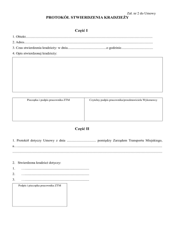 Zał. nr 2 do Umowy PROTOKÓŁ STWIERDZENIA KRADZIEŻY Część I 1. Obiekt................................................................................................................................................ 2. Adres.................................................................................................................................................. 3. Czas stwierdzenia kradzieży: w dniu............................................o godzinie.................................... 4. Opis stwierdzonej kradzieży: Pieczątka i podpis pracownika ZTM Czytelny podpis pracownika/przedstawiciela Wykonawcy Część II 1. Protokół dotyczy Umowy z dnia ................................. pomiędzy Zarządem Transportu Miejskiego, a….................................................................................................................................................................... .......................................................................................................................................................................... 2. Stwierdzona kradzież dotyczy: 1. …......................................................................... 2. …......................................................................... 3. …......................................................................... Podpis i pieczątka pracownika ZTM
