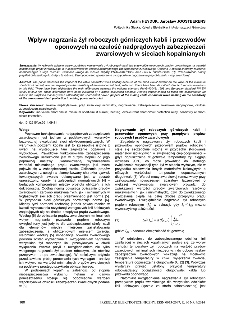 Adam HEYDUK, Jarosław JOOSTBERENS Politechnika Śląska, Katedra Elektryfikacji i Automatyzacji Górnictwa Wpływ nagrzania żył roboczych górniczych kabli i przewodów oponowych na czułość nadprądowych zabezpieczeń zwarciowych w sieciach kopalnianych Streszczenie. W referacie opisano wpływ przebiegu nagrzewania żył roboczych kabli lub przewodów oponowych prądem zwarciowym na wartość minimalnego prądu zwarciowego, a w konsekwencji na czułość nadprądowego zabezpieczenia zwarciowego. Opisano w sposób skrótowy zalecenia normalizacyjne z tego zakresu. Zwrócono uwagę na różnice między PN-G-42042:1998 oraz PN-EN 60909-0:2002 (U). Przedstawiono prosty przykład obliczeniowy ilustrujący te różnice. Zaproponowano uproszczone uwzględnienie nagrzewania przy obliczaniu mocy zwarciowej. Abstract. The paper describes the impact of the cable conductor wires heating because of the short circuit current on the value of the minimum short-circuit current, and consequently on the sensitivity of the over-current fault protection. There have been described standard recommendations in this field. There have been highlighted the main differences between the national standard PN-G-42042: 1998 and European standard PN EN 60909-0:2002 (U). These differences have been illustrated by a simple calculation example. Heating impact should be taken into consideration (at least in the simplified manner) when calculating the short circuit power. (Impact of the mining cable conductor wires heating on the sensitivity of the over-current fault protection in mining power networks). Słowa kluczowe: zwarcie międzyfazowe, prąd zwarciowy minimalny, nagrzewanie, zabezpieczenie zwarciowe nadprądowe, czułość zabezpieczeń zwarciowych. Keywords: line-to-line short circuit, minimum short-circuit current, heating, over-current short-circuit protection relay, sensitivity of shortcircuit protection. doi:10.12915/pe.2014.09.41 Wstęp Poprawne funkcjonowanie nadprądowych zabezpieczeń zwarciowych jest jednym z podstawowych warunków bezpiecznej eksploatacji sieci elektroenergetycznych. W warunkach podziemi kopalń jest to szczególnie istotne z uwagi na występujące tam zagrożenie pożarowe i wybuchowe. Prawidłowe funkcjonowanie zabezpieczenia zwarciowego uzależnione jest w dużym stopniu od jego poprawnej nastawy, uwarunkowanej wyznaczeniem wartości minimalnego prądu zwarciowego jaki może pojawić się w zabezpieczanej strefie. Obliczanie prądów zwarciowych z uwagi na skomplikowany charakter zjawisk towarzyszących zwarciu dokonywane jest w sposób uproszczony, oparty na zaleceniach normatywnych [4] – będących kompromisem między prostotą obliczeń, a ich dokładnością. Ogólną normą opisującą obliczanie prądów zwarciowych zarówno maksymalnych, jak i minimalnych w trójfazowych sieciach prądu przemiennego jest norma [5]. W przypadku sieci górniczych obowiązuje norma [6]. Między tymi normami zachodzą jednak pewne różnice w kwestii wyznaczania rezystancji zastępczych linii kablowych znajdujących się na drodze przepływu prądu zwarciowego. Według [6] do obliczania prądów zwarciowych minimalnych wpływ nagrzania przewodu prądem roboczym uwzględniony jest jedynie dla zabezpieczanej strefy, czyli dla elementów między miejscem zainstalowania zabezpieczenia, a obliczeniowym miejscem zwarcia. Natomiast według [5] impedancja obwodu zwarciowego powinna zostać wyznaczona z uwzględnieniem nagrzania wszystkich żył roboczych linii przesyłowych w chwili wyłączenia zwarcia (czyli z uwzględnieniem nie tylko wstępnego nagrzania żył prądem roboczym, ale również przepływem prądu zwarciowego). W niniejszym artykule przedstawiono próbę porównania tych wymagań i analizę ich wpływu na wartości minimalnych prądów zwarciowych na podstawie prostego przykładu obliczeniowego. W podziemiach kopalń w zależności od stopnia niebezpieczeństwa wybuchu metanu w danym pomieszczeniu stosuje się odpowiednie wartości współczynnika czułości zabezpieczeń zwarciowych podane w [6]. 160 Nagrzewanie żył roboczych górniczych kabli i przewodów oponowych przy przepływie prądów roboczych i prądów zwarciowych Zagadnienie nagrzewania żył roboczych kabli i przewodów oponowych przepływem prądów roboczych staje się szczególnie istotne w przypadku stosowania materiałów izolacyjnych o zwiększonej ciepłoodporności – gdyż dopuszczalne długotrwale temperatury żył sięgają wówczas 90°C, co może prowadzić do istotnego zwiększenia rezystancji tych żył w stopniu wyższym, niż w przypadku stosowania innych materiałów izolacyjnych o niższych wartościach temperatur dopuszczalnych długotrwale [7]. Wzrost mocy zwarciowej (umożliwiony przy zastosowaniu nowoczesnej aparatury łączeniowej o większej wytrzymałości zwarciowej) prowadzi do zwiększenia wartości prądów zwarciowych (zarówno maksymalnych, jak i minimalnych), czyli do zwiększonego wydzielania ciepła na całej drodze przepływu prądu zwarciowego. Uwzględnienie nagrzania żył roboczych prądem roboczym (Io) w sytuacji, gdy Io < Idd można wyznaczyć wg zależności: (1) I I o I dd o I dd 2 gdzie: Idd - oznacza obciążalność długotrwałą. W odniesieniu do zabezpieczanego odcinka linii zasilającej w sieciach kopalnianych podaje się, że wpływ wartości temperatury żył roboczych na wartość prądów zwarciowych minimalnych niezbędnych do doboru nastaw zabezpieczeń zwarciowych wskazuje na możliwość zastąpienia temperatury w chwili wyłączenia zwarcia, temperaturą dopuszczalną długotrwale ϑdd [2] [3]. Wówczas wystarczy przyjąć ustalony przyrost temperatury odpowiadający obciążalności długotrwałej kabla lub przewodu oponowego. Natomiast uwzględnienie nagrzewania żył roboczych przepływem prądu zwarciowego dla wszystkich odcinków linii kablowych (łącznie ze strefa zabezpieczaną) jest PRZEGLĄD ELEKTROTECHNICZNY, ISSN 0033-2097, R. 90 NR 9/2014 zagadni