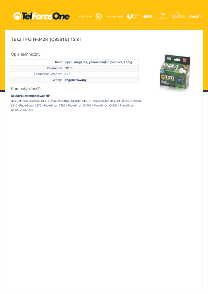 Tusz TFO H-342R (C9361E) 12ml Opis techniczny Kolor cyan, magenta, yellow (błękit, purpura, żółty) Pojemność 12 ml Producent urządzeń HP Wersja regenerowany Kompatybilność Drukarki atramentowe: HP DeskJet 5420 \ DeskJet 5440 \ DeskJet 5440xi \ DeskJet 5442 \ DeskJet 5443 \ DeskJet D4160 \ OfficeJet 6310 \ PhotoSmart 2575 \ PhotoSmart 7850 \ PhotoSmart C3180 \ PhotoSmart C4180 \ PhotoSmart C4190 \ PSC1510