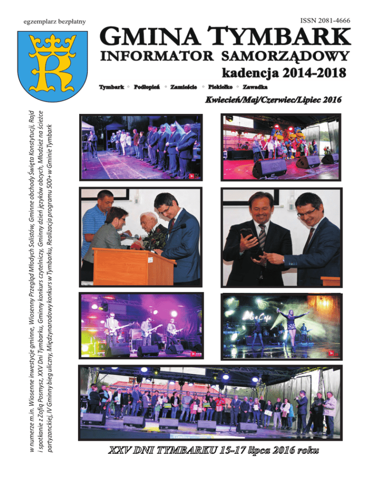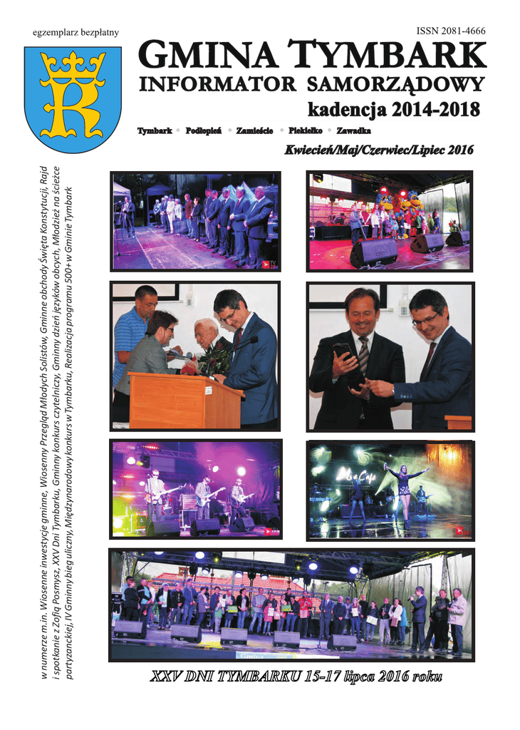 w numerze m.in. Wiosenne inwestycje gminne, Wiosenny Przegl¹d M³odych Solistów, Gminne obchody Œwiêta Konstytucji, Rajd i spotkanie z Zofi¹ Posmysz, XXV Dni Tymbarku, Gminny konkurs czytelniczy, Gminny dzieñ jêzyków obcych, M³odzie¿ na œcie¿ce partyzanckiej, IV Gminny bieg uliczny, Miêdzynarodowy konkurs w Tymbarku, Realizacja programu 500+ w Gminie Tymbark kadencja 2014-2018 Tymbark Pod³opieñ Zamieœcie Piekie³ko Zawadka Kwiecieñ/Maj/Czerwiec/Lipiec 2016 XXV DNI TYMBARKU 15-17 lipca 2016 roku Wójt do Mieszkañców w kilku s³owach Szanowni Pañstwo, Za nami pierwsze pó³rocze 2016 roku. W tym wydaniu „Informatora Samorz¹dowego” chcia³em Pañstwu przedstawiæ najwa¿niejsze wydarzenia gminne ostatnich kilku miesiêcy,w tym realizowane inwestycje oraz liczne wydarzenia kulturalne i edukacyjne. Inwestycje w trakcie realizacji Rozpoczê³a siê wspólna inwestycja Powiatu Limanowskiego i Gminy Tymbark, polegaj¹ca na budowie chodników, zatok przystankowych oraz oœwietlenia ulicznego na odcinku drogi Tymbark Pod³opieñ - Zawadka. Przewidywany termin zakoñczenia to koniec wrzeœnia br. Realizacja projektu, finansowanego z Narodowego Programu Przebudowy Dróg Lokalnych, przyczyni siê do wzrostu bezpieczeñstwa Mieszkañców Gminy Tymbark, w tym przede wszystkim pieszych oraz uporz¹dkowania ruchu. W trakcie realizacji jest równie¿ budowa oœwietlenia w Zamieœciu, przebudowa trybun na boisku sportowym KS „Tymbark” oraz budowa ogrodzenia na boisku sportowym w Piekie³ku. Obecnie trwaj¹ prace przy odbudowie trzech dróg gminnych ? w 80% finansowana ze œrodków Ministerstwa Spraw Wewnêtrznych i Administracji oraz modernizacja drogi dojazdowej do gruntów rolnych ? finansowana tak¿e ze Ÿróde³ zewnêtrznych. Ponadto gmina przyst¹pi³a do modernizacji dwóch dróg w Tymbarku i w Zawadce, która pokryta zostanie ze œrodków w³asnych. W czerwcu br. zlecone zosta³o opracowanie koncepcji przebudowy skrzy¿owañ dróg gminnych ,,Podlas” oraz do ,,NOKU” z drog¹ krajow¹ nr 28 oraz drog¹ powiatow¹ w kierunku Rynku w Tymbarku. Dokument ten zgodnie z ustaleniami z GDDKiA stanie siê podstaw¹ do opracowania projektu przebudowy skrzy¿owania, uwzglêdniaj¹cego ruch pieszych (wykonanie oœwietlenia wraz z chodnikami). Wiêcej informacji o bie¿¹cych i zakoñczonych inwestycjach gminnych znajduj¹ siê na s. 4-5. XXV Dni Tymbarku W tym roku obchodziliœmy jubileuszowe, 25 Dni Tymbarku po³¹czone z 80-leciem firmy „Tymbark”. Tegoroczne Dni Tymbarku sta³y siê okazj¹ do spojrzenia na historiê Zak³adu 2 www.tymbark.pl ,,Tymbark” nieod³¹cznie zwi¹zan¹ z nasz¹ gmin¹ oraz do podsumowania 25 lat organizacji Dni Tymbarku, które na sta³e wpisa³y siê w kalendarz imprez gminnych. Kwestia absolutorium Kwestia wykonania bud¿etu zosta³a obszernie opisana na stronie 3 Informatora. W tym miejscu chcia³em podkreœliæ, i¿ bud¿et za 2015 rok zosta³ wykonany zgodnie z prawem oraz z zasadami celowoœci i gospodarnoœci, a Regionalna Izba Obrachunkowa zaopiniowa³a pozytywnie, bez uwag wykonanie bud¿etu. Pragnê podziêkowaæ wszystkim, którzy przyczynili siê do jego realizacji w szczególnoœci Radnym Rady Gminy, którzy bud¿et uchwalili i akceptowali jego zmiany, Pani Skarbnik, pracownikom Urzêdu Gminy z Pani¹ Sekretarz na czele, kierownikom jednostek organizacyjnych, a tak¿e So³tysom i Radom So³eckich. Sytuacja w oœwiacie Szczególnej uwagi wymaga sytuacja w oœwiacie. Zmniejszaj¹ca siê liczba uczniów i zwi¹zane z tym zmniejszenie subwencji oœwiatowej wyp³acanej przez pañstwo powoduje koniecznoœæ szukania oszczêdnoœci w wydatkach bie¿¹cych na oœwiatê. Mam pe³n¹ œwiadomoœæ jak trudne s¹ to decyzje, lecz niestety wynika to z ogólnej sytuacji demograficznej. Proponowane na wiosnê oszczêdnoœci, wynikaj¹ce z przekszta³cenia sto³ówek nie zyska³y akceptacji œrodowisk szkolnych, w tym rodziców, a tak¿e wiêkszoœci Radnych Rady Gminy. Nie zmienia to faktu, i¿ pozostaje problem bie¿¹cego utrzymania finansowania oœwiaty w sytuacji zmniejszaj¹cej siê subwencji oœwiatowej zwi¹zanej ze spadkiem liczby uczniów. Ponadto proponowane przez rz¹d RP zmiany systemu oœwiaty, które oznaczaj¹ dalsze zmniejszenie liczby uczniów uczêszczaj¹cych do szkó³ gminnych bêd¹ stanowiæ nowe wyzwanie dla nas wszystkich. Podsumowanie Zapraszam Pañstwa do odwiedzania oficjalnej strony internetowej Gminy Tymbark www.tymbark.pl, gdzie na bie¿¹co zamieszczane s¹ informacje samorz¹dowe. Zapraszam równie¿ na gminny profil na facebook'u. Przede wszystkim zachêcam do dyskusji na tematy zwi¹zane z Gmin¹ Tymbark, do zadawania pytañ poprzez internet, a tak¿e w bezpoœrednich kontaktach. Pawe³ Ptaszek Wójt Gminy Tymbark Wójt do Mieszkañców w kilku s³owach Informacja o realizacji bud¿etu za 2015 i absolutorium Ponadto Rada Gminy by³a na bie¿¹co zapoznana z przyczynami tych¿e opóŸnieñ i ? co szczególnie istotne ? wyrazi³a zgodê na przesuniêcie tych trzech zadañ na 2016 rok, nie wnosz¹c wtedy ¿adnych zastrze¿eñ. Nadmieniæ nale¿y, i¿ zadania te zosta³y wykonane w roku bie¿¹cym, a dodatkowo poprzez po³¹czenie zadañ projektowych wyst¹pi³y oszczêdnoœci w kwocie 22 tys. z³. Bud¿et gminy po zmianach na koniec 2015 roku po stronie dochodów wynosi³ 22,5 mln z³, a po stronie wydatków 21,5 mln z³ i w trakcie roku bud¿etowego zosta³ zwiêkszony o kwotê ponad 1,8 mln. Wydatki inwestycyjne na pocz¹tku roku 2015 planowane by³y na 1,28 mln, a w trakcie roku zosta³y zwiêkszone do kwoty 2,1 mln. Dochody zosta³y zrealizowane w 100,4%, wydatki 96,58%, w tym wydatki maj¹tkowe w wysokoœci 89%. W tym miejscu nale¿y dodaæ, i¿ wartoœci te nie odbiegaj¹ od lat poprzednich oraz s¹ na poziomie podobnym do wykonania bud¿etu w oœciennych samorz¹dach. Wygospodarowane w trakcie roku wolne œrodki w kwocie 827 tys. z³ zasili³y tegoroczny bud¿et, pozwalaj¹c na zmniejszenie d³ugu na rok 201