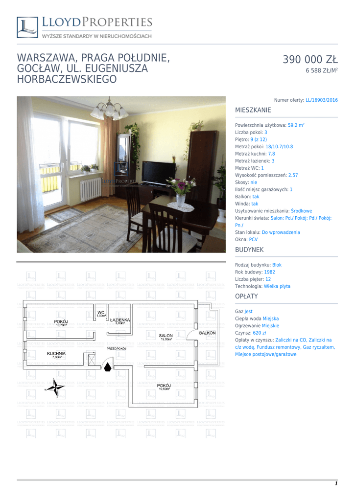 WARSZAWA, PRAGA POŁUDNIE, GOCŁAW, UL. EUGENIUSZA HORBACZEWSKIEGO 390 000 ZŁ 6 588 ZŁ/M2 Numer oferty: LL/16903/2016 MIESZKANIE Powierzchnia użytkowa: 59.2 m2 Liczba pokoi: 3 Piętro: 9 (z 12) Metraż pokoi: 18/10.7/10.8 Metraż kuchni: 7.8 Metraż łazienek: 3 Metraż WC: 1 Wysokość pomieszczeń: 2.57 Skosy: nie Ilość miejsc garażowych: 1 Balkon: tak Winda: tak Usytuowanie mieszkania: Środkowe Kierunki świata: Salon: Pd./ Pokój: Pd./ Pokój: Pn./ Stan lokalu: Do wprowadzenia Okna: PCV BUDYNEK Rodzaj budynku: Blok Rok budowy: 1982 Liczba pięter: 12 Technologia: Wielka płyta OPŁATY Gaz Jest Ciepła woda Miejska Ogrzewanie Miejskie Czynsz: 620 zł Opłaty w czynszu: Zaliczki na CO, Zaliczki na c/z wodę, Fundusz remontowy, Gaz ryczałtem, Miejsce postojowe/garażowe 1 Michał Wleklik Property Expert & Manager + 48 533 300 908 [email protected] OPIS Przedstawione mieszkanie prezentuje się naprawdę bardzo dobrze. Właściciele przeprowadzili w nim szeroko zakrojony remont w 2012 roku. Zrobili to dla siebie, starannie. W ramach przeprowadzonych prac m.in. wygładzono ściany i je odmalowani, wycyklinowano elegancki parkiet, wymieniono drzwi wewnętrzne i zewnętrzne, wstawiono nową szafę w przedpokoju, całkowicie wyremontowano łazienkę i WC, a także dokonano rewolucji w kuchni wyposażając ją w nową zabudowę i sprzęt. Wcześniej, około 2007 roku, wymieniono wszystkie okna na nowe PCV, a także zamontowano parapety z konglomeratu. Lokal jest dwustronny, okna wychodzą na południe i północ, więc słońce gości w mieszkaniu przez znakomitą część dnia, a lokal, będący mieszkaniem środkowym, pozostaje ciepły w ciągu roku, nie przegrzewając się latem. Na mieszkanie to składają się: przestronny salon, z którego wychodzi się na 6-metrowy balkon; dwie niezależne sypialnie, obie bardzo ustawne; widna kuchnia z częścią na stolik jadalniany; łazienka z wanną i oddzielne WC; przedpokój z szafą. Dodatkową przestrzeń zapewnia piwnica (1.39 m2) przypisana do mieszkania oraz część zabudowanego korytarza, która pozostaje do wyłącznego użytku właścicieli. Czynsz przy 2 osobach oscyluje w granicach 600 złotych, mieszkanie to pełna własność z czystą księgą wieczystą. Dodatkowo, z mieszkaniem związany jest udział w gruncie, co przekłada się na brak konieczności opłacania ewentualnego podatku za wieczyste użytkowanie jak na większości Gocławia. Mieszkanie to zlokalizowane jest w jednej z najciekawszych części Gocławia, na spokojnym osiedlu przy ul Horbaczewskiego. Terenem zarządza prężna Wspólnota Mieszkaniowa, całość schowana jest w drugiej linii zabudowy, więc pobliskie skrzyżowanie Bora-Komorowskiego z Fieldorfa jest zupełnie niesłyszalne. W okolicy funkcjonuje bardzo dobrze zorganizowany pasaż handlowy, na który składa się sieć sklepów, punktów gastronomicznych i usługowych. Mieszkańcy mogą też zaopatrywać się w codzienne produkty w osiedlowych marketach, nieopodal budynku funkcjonuje supermarket Tesco. Pod względem infrastruktury okolica prezentuje się rewelacyjnie - nieopodal działa basen Wodnik, na spacery wybrać się można do rewitalizowanego Parku nad Balatonem, a na niedzielne wyjście do kina idealnym miejscem jest CH Promenada. Dojazd do centrum zajmuje niewiele czasu, niedaleko funkcjonują przystanki autobusowe, z których można dotrzeć w każdy zakątek miasta. Z Gocławia wychodzi 14 dziennych linii autobusowych - dojazd do ścisłego centrum Warszawy zajmuje nie więcej niż 15 minut. Mieszkańcy parkować mogą na osiedlowym parkingu, który przeznaczony jest właśnie dla nich, więc nie ma problemu z miejscem. Właściciele korzystają z konkretnego miejsca postojowego, opłata za które wynosi 20 złotych miesięcznie i ujęta jest w podanym czynszu. Budynek, w którym znajduje się prezentowane mieszkanie jest w bardzo dobrym stanie, m.in. Wspólnota Mieszkaniowa bardzo o niego dba i przeprowadziła już najważniejsze remonty. Gorąco polecam osobom zainteresowanym zakupem mieszkania bez ponoszenia nakładów na jego wykończenie i zapraszam na prezentację! Michał Wleklik, 533-300-908 2