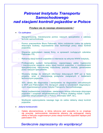 Patronat Instytutu Transportu Samochodowego nad stacjami kontroli pojazdów w Polsce Przyłącz się do naszego stowarzyszenia ! • • Co zyskujesz: R - Nieograniczoną, merytoryczna pomoc naszych specjalistów z zakresu techniki samochodowej, - Pomoc pracowników Biura Patronatu, które codziennie czeka na pytania dotyczące budowy, wyposażenia oraz technologii pracy stacji kontroli pojazdów, - Wsparcie autorytetem naszej firmy, w sprawach nurtujących członków Patronatu ITS, - Reklamę stacji kontroli pojazdów w internecie na witrynie WWW Instytutu, - Profesjonalny system komputerowy, zapewniający pełne logistyczne i merytoryczne wsparcie pracy stacji kontroli pojazdów, z możliwościami specjalistycznej kierunkowej rozbudowy poprzez moduły generowane przez naszych specjalistów, - Wczesny dostęp do istotnych informacji dotyczących SKP już w fazie projektu, wraz z interpretacją przepisów związanych z badaniami technicznymi pojazdów, - 30% rabatu dla diagnostów i kandydatów na diagnostów zatrudnionych w SKP pod Patronatem ITS, biorących udział w szkoleniach diagnostycznych organizowanych przez Instytut Transportu Samochodowego, - Nasze wydawnictwa instytutowe, zawierające istotne informacje dotyczące pojazdów i urządzeń eksploatowanych w Polsce (Katalog marek i typów pojazdów eksploatowanych w Polsce, Informator SKP, itd.), - Możliwość wykorzystania naszego logo do celów reklamy stacji kontroli pojazdów. Jedyna konieczność: - Opłata abonamentowa, w którą wliczona jest wszystko to co znajduje się powyżej. Jednocześnie nieustannie staramy się wzbogacać naszą ofertę w kierunku sugerowanym przez stacje kontroli pojazdów będące pod patronatem ITS. Serdecznie zapraszamy do współpracy! • Geneza powstania Patronatu ITS. W 1998 roku w Serocku, na konferencji organizowanej przez Instytut Transportu Samochodowego p.t.: ”Badania techniczne pojazdów w świetle obowiązujących przepisów”, środowisko osób współpracujących ze stacjami kontroli pojazdów oraz diagnostów zasygnalizowało Instytutowi konieczność stworzenia silnej niezależnej, a co najważniejsze polskiej organizacji w obliczu planowanego przystąpienia Polski do Unii Europejskiej. W odpowiedzi na sugestie podjęliśmy inicjatywę na rzecz stworzenia silnej grupy lobbingowej wpływającej na proces tworzenia nowych przepisów i nazwaliśmy ją Patronatem ITS wykorzystując uznaną markę naszego Instytutu na rynku motoryzacyjnym w Polsce i za granicą. Dzisiaj już możemy śmiało powiedzieć, że owocem naszej współpracy z patronackimi stacjami kontroli pojazdów są w 90% ujednolicone przepisy z aktami prawnymi obowiązującymi w Unii Europejskiej. • Założenia Po reformie administracyjnej naszego kraju, w systemie badań technicznych powstało nieuniknione zamieszanie. Pojawiły się trudności w dostępie do podstawowych aktów prawnych, przepisów wykonawczych, danych homologacyjnych pojazdów. Pojawiła się ogromna liczba całkowicie sprzecznych interpretacji tych samych przepisów, a konflikty pomiędzy wydziałami komunikacji, a stacjami kontroli pojazdów nieustannie narastały. Postawiliśmy sobie za cel uporządkowanie tej sytuacji. System badań technicznych w naszym kraju w konfrontacji z systemami innych krajów Europy, reprezentuje dobry, fachowy poziom, a nasi specjaliści posiadają ogromną wiedzę i doświadczenie, które chcemy wykorzystywać w tworzeniu przepisów, bo nic chyba lepiej nie weryfikuje obowiązującego prawa niż samo życie. Nasze stowarzyszenie ma na celu stworzenie spójnego organizmu zajmującego się urzędową kontrolą pojazdów zleconą stacjom kontroli pojazdów przez Ministra Transportu i Gospodarki Morskiej. Najistotniejszą jego cechą jest ciągły, dwukierunkowy przepływ informacji za pośrednictwem ITS pomiędzy Ministerstwem Transportu i Gospodarki Morskiej a stacjami kontroli pojazdów i starostwami powiatowymi nadzorujących pracę tychże stacji. Robimy to czego nikt przed nami się nie podjął. Mamy nadzieję, że członków Patronatu ITS będzie przybywało dalej w tak lawinowym tempie, jak w ostatnim okresie. Cieszymy się, że środowisko diagnostów w obliczu własnej konkurencji potrafi wznieść się ponad podziały w imię stworzenia idealnego – polskiego systemu badań technicznych pojazdów w pełni zgodnego z wymogami Unii Europejskiej. Zadanie jest tym trudniejsze, że na terenie naszego kraju nie da się zaadoptować wzorów spoza naszych granic, gdyż działamy w oparciu o odmienny system prawny, który nie zawsze odpowiednio szybko reaguje na wszelkie zmiany. R • Środki pracy W celu pomocy merytorycznej stacjom kontroli pojazdów, oferujemy nieograniczoną pomoc naszych specjalistów z zakresu techniki samochodowej. W tym celu uruchomiliśmy biuro Patronatu ITS, które codziennie czeka na pytania ze strony stacji kontroli pojazdów z terenu całego naszego kraju. Jesteśmy gotowi w każdej nurtującej, naszego członka, sprawie udzielić wszelkich wyjaśnień i wspierać go naszym autorytetem w sytuacjach konfliktowych. Zasygnalizowane niejasności w przepisach, przedstawiamy MTiGM i określamy nasze stanowisko w przedmiotowych sprawach. Wszystkie sugestie dotyczące uchybień w tworzonym prawie przekazujemy do MTiGM. Stworzyliśmy profesjonalny system komputrowy zapewniający pełne logistyczne i merytoryczne wsparcie stacji kontroli pojazdów oraz mający wiele możliwości rozbudowy o elementy ułatwiające pracę SKP (np. dekoder numeru VIN, katalog świadectw homologacji, umowa ADR itp.). Mamy nadzieję, że system ten w oparciu o nasze doświadczenia docelowo stanie się ważnym elementem centralnego rejestru badań. Nie wykluczamy wykorzystania naszej pozycji na rynku motoryzacji, do wynegocjowania korzystnych cen urządzeń dla członków Patronatu ITS. Chcemy aby narzędzia pracy były jak najbardziej „przyjazne” pod względem użytkowym dla pracowników stacji kontroli pojazd