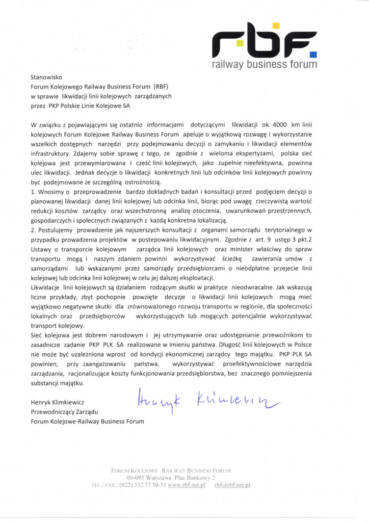 rbR railway business forum Stanowisko Forum Kolejowego Railway Business Forum (RBF) w sprawie likwidacji linii kolejowych zarza.dzanych przez PKP Polskie Linie Kolejowe SA W zwia.zku z pojawiaja.cymi sie. ostatnio informacjami dotyczqcymi likwidacji ok. 4000 km linii kolejowych Forum Kolejowe Railway Business Forum apeluje o wyja.tkowa. rozwage. i wykorzystanie wszelkich doste.pnych narze.dzi przy podejmowaniu decyzji o zamykaniu i likwidacji elementow infrastruktury. Zdajemy sobie sprawe. z tego, ze zgodnie z wieloma ekspertyzami, polska siec kolejowa jest przewymiarowana i czesc linii kolejowych, jako zupetnie nieefektywna, powinna ulec likwidacji. Jednak decyzje o likwidacji konkretnych linii lub odcinkow linii kolejowych powinny bye podejmowane ze szczegolna. ostroznoscia,. 1. Wnosimy o przeprowadzenie bardzo doktadnych badari i konsultacji przed podje^ciem decyzji o planowanej likwidacji danej linii kolejowej lub odcinka linii, biora.c pod uwage. rzeczywista. wartosc redukcji kosztow zarza.dcy oraz wszechstronna. analize. otoczenia, uwarunkowah przestrzennych, gospodarczych i spotecznych zwia.zanych z kazda. konkretna lokalizacja.. 2. Postulujemy prowadzenie jak najszerszych konsultacji z organami samorza.du terytorialnego w przypadku prowadzenia projektow w postepowaniu likwidacyjnym. Zgodnie z art. 9 uste,p 3 pkt.2 Ustawy o transporcie kolejowym transportu moga. i samorza.dami zarzqdca linii kolejowych naszym zdaniem powinni oraz minister wfasciwy do spraw wykorzystywac sciezke, zawierania umow z lub wskazanymi przez samorza.dy przedsie^biorcami o nieodptatne przejecie linii kolejowej lub odcinka linii kolejowej w celu jej dalszej eksploatacji. Likwidacje linii kolejowych sa. dziataniem rodza.cym skutki w praktyce nieodwracalne. Jak wskazuja. liczne przyktady, zbyt pochopnie powzi^te decyzje o likwidacji linii kolejowych moga. miec wyja.tkowo negatywne skutki dla zrownowazonego rozwoju transportu w regionie, dla spotecznosci lokalnych oraz przedsie.biorcow wykorzystuja.cych lub moga.cych potencjalnie wykorzystywac transport kolejowy. Siec kolejowa jest dobrem narodowym i jej utrzymywanie oraz udoste_pnianie przewoznikom to zasadnicze zadanie PKP PLK SA realizowane w imieniu paristwa. Dtugosc linii kolejowych w Polsce nie moze bye uzalezniona wprost od kondycji ekonomicznej zarza.dcy tego maj^tku. PKP PLK SA powinien, przy zaangazowaniu pahstwa, wykorzystywac proefektywnosciowe narze.dzia zarza,dzania, racjonalizuja.ce koszty funkcjonowania przedsie.biorstwa, bez znacznego pomniejszenia substancji majqtku. Henryk Klimkiewicz Przewodnicza.cy Forum Kolejowe-Railway Business Forum FORI M Km I n i \ \ R \ l l \ Hi SIM ss ()()-()')> V\,ns/.iu;i Pkif Hankow\ M i . i \ \ . : ( 0 2 2 ) 3 3 2 7 7 50-51 www.rbf.nel.nl ijifrnhrik-i pi