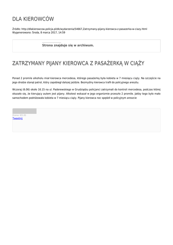 DLA KIEROWCÓW Źródło: http://dlakierowcow.policja.pl/dk/wydarzenia/54667,Zatrzymany-pijany-kierowca-z-pasazerka-w-ciazy.html Wygenerowano: Środa, 8 marca 2017, 14:59 Strona znajduje się w archiwum. ZATRZYMANY PIJANY KIEROWCA Z PASAŻERKĄ W CIĄŻY Ponad 2 promile alkoholu miał kierowca mercedesa, którego pasażerką była kobieta w 7 miesiącu ciąży. Na szczęście na jego drodze stanął patrol, który zapobiegł dalszej jeździe. Bezmyślny kierowca trafił do policyjnego aresztu. Wczoraj (6.06) około 16.15 na ul. Paderewskiego w Grudziądzu policjanci zatrzymali do kontroli mercedesa, podczas której okazało się, że kierujący autem jest pijany. Alkotest wskazał w jego organizmie przeszło 2 promile. Jakby tego było mało samochodem podróżowała kobieta w 7 miesiącu ciąży. Pijany kierowca noc spędził w policyjnym areszcie Ocena: 0/5 (0) Tweetnij