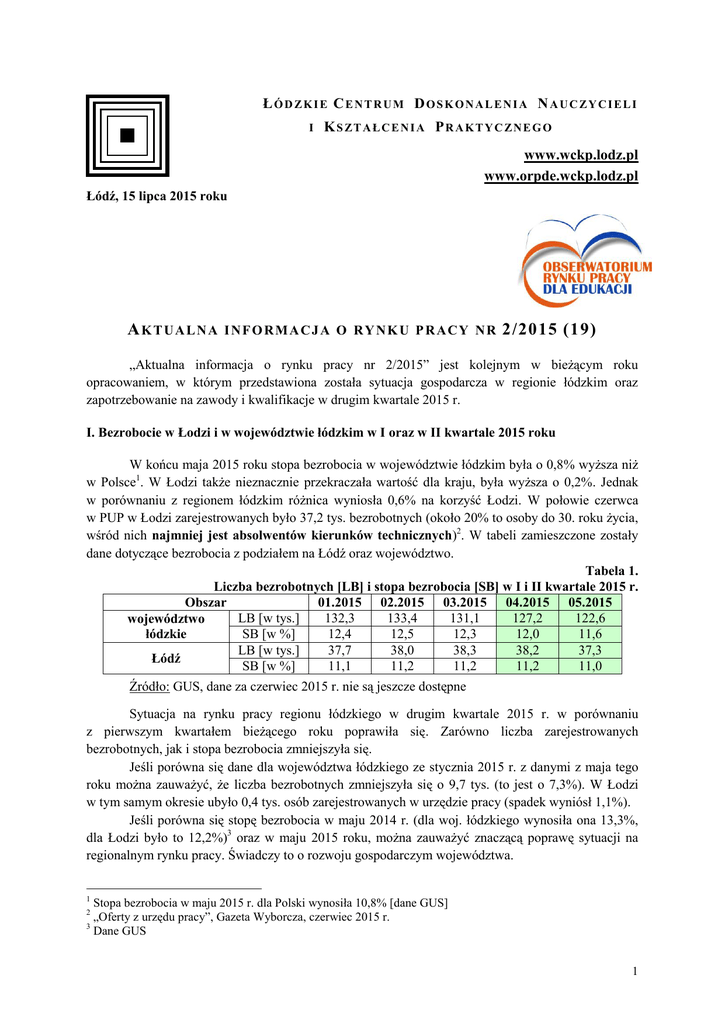 ŁÓDZKIE CENTRUM DOSKONALENIA NAUCZYCIELI I KS ZTAŁCENIA PR AKTYC ZNEGO www.wckp.lodz.pl www.orpde.wckp.lodz.pl Łódź, 15 lipca 2015 roku AKTUALNA INFORMACJA O RYNKU PRACY NR 2/2015 (19) „Aktualna informacja o rynku pracy nr 2/2015” jest kolejnym w bieżącym roku opracowaniem, w którym przedstawiona została sytuacja gospodarcza w regionie łódzkim oraz zapotrzebowanie na zawody i kwalifikacje w drugim kwartale 2015 r. I. Bezrobocie w Łodzi i w województwie łódzkim w I oraz w II kwartale 2015 roku W końcu maja 2015 roku stopa bezrobocia w województwie łódzkim była o 0,8% wyższa niż w Polsce1. W Łodzi także nieznacznie przekraczała wartość dla kraju, była wyższa o 0,2%. Jednak w porównaniu z regionem łódzkim różnica wyniosła 0,6% na korzyść Łodzi. W połowie czerwca w PUP w Łodzi zarejestrowanych było 37,2 tys. bezrobotnych (około 20% to osoby do 30. roku życia, wśród nich najmniej jest absolwentów kierunków technicznych)2. W tabeli zamieszczone zostały dane dotyczące bezrobocia z podziałem na Łódź oraz województwo. Tabela 1. Liczba bezrobotnych [LB] i stopa bezrobocia [SB] w I i II kwartale 2015 r. Obszar 01.2015 02.2015 03.2015 04.2015 05.2015 LB [w tys.] 132,3 133,4 131,1 127,2 122,6 województwo łódzkie SB [w %] 12,4 12,5 12,3 12,0 11,6 LB [w tys.] 37,7 38,0 38,3 38,2 37,3 Łódź SB [w %] 11,1 11,2 11,2 11,2 11,0 Źródło: GUS, dane za czerwiec 2015 r. nie są jeszcze dostępne Sytuacja na rynku pracy regionu łódzkiego w drugim kwartale 2015 r. w porównaniu z pierwszym kwartałem bieżącego roku poprawiła się. Zarówno liczba zarejestrowanych bezrobotnych, jak i stopa bezrobocia zmniejszyła się. Jeśli porówna się dane dla województwa łódzkiego ze stycznia 2015 r. z danymi z maja tego roku można zauważyć, że liczba bezrobotnych zmniejszyła się o 9,7 tys. (to jest o 7,3%). W Łodzi w tym samym okresie ubyło 0,4 tys. osób zarejestrowanych w urzędzie pracy (spadek wyniósł 1,1%). Jeśli porówna się stopę bezrobocia w maju 2014 r. (dla woj. łódzkiego wynosiła ona 13,3%, dla Łodzi było to 12,2%)3 oraz w maju 2015 roku, można zauważyć znaczącą poprawę sytuacji na regionalnym rynku pracy. Świadczy to o rozwoju gospodarczym województwa. 1 Stopa bezrobocia w maju 2015 r. dla Polski wynosiła 10,8% [dane GUS] „Oferty z urzędu pracy”, Gazeta Wyborcza, czerwiec 2015 r. 3 Dane GUS 2 1 II. Zapotrzebowanie na zawody i kwalifikacje (na podstawie analizy internetowych ofert pracy) W dalszej części informacji o rynku pracy przedstawione zostało zapotrzebowanie na zawody oraz kwalifikacje w regionie łódzkim w drugim kwartale 2015 r. Analizowane były oferty umieszczone w portalu pracuj.pl. Dane dotyczące średniej miesięcznej liczby ofert pracy w okresie od kwietnia do czerwca 2015 roku pokazane zostały na poniższym wykresie. Wykres 1. Średnia miesięczna liczba ofert pracy w poszczególnych branżach w portalu pracuj.pl (II kwartał 2015 r., woj. łódzkie) sprzedaż 607 obsługa klienta 331 finanse, ekonomia 215 inżynieria 198,7 IT - rozwój oprogramowania 197 produkcja 130 IT - administracja 110,3 human resources, zasoby ludzkie 104,7 bankowość 91 łańcuch dostaw 89,3 praca fizyczna 88,7 administracja biurowa 87,7 doradztwo, konsulting 76,7 budownictwo 50,3 transport, spedycja 49 praktyki, staże 48 call center 47,7 marketing 40,7 zakupy 38,3 kontrola jakości 35,3 internet, e-commerce, nowe media 32,7 badania i rozwój 32,7 nieruchomości 18,3 reklama, grafika, kreacja, fotografia 18 edukacja, szkolenia 17,3 hotelarstwo, gastronomia, turystyka 16,7 zdrowie, uroda, rekreacja 16 ubezpieczenia 14 prawo 14 BHP, ochrona środowiska 10,3 energetyka 9,7 inne 8 media, sztuka, rozrywka 4,7 0 100 200 300 400 500 600 700 Źródło: Opracowanie własne Obserwatorium Rynku Pracy dla Edukacji 2 W porównaniu z pierwszym kwartałem 2015 r. (Aktualna informacja o rynku pracy nr 1/2015) liczba ofert pracy dostępna w prawie wszystkich sekcjach reprezentowanych w portalu pracuj.pl pozostała na porównywalnym poziomie. Przybyło ofert w czterech branżach. Największy wzrost (o około 100%) zanotowano w następujących sekcjach: „BHP, ochrona środowiska”, „doradztwo, konsulting”. Więcej wolnych miejsc pracy oferowała także branża „human resources, zasoby ludzkie” (wzrost wyniósł 61%) oraz „administracja biurowa” (41%). Nieznacznie mniej ofert znalazło się w sekcji „sprzedaż” (różnica wyniosła 7,1%). W dalszej części opracowania analizowane były oferty dostępne w portalu pracuj.pl w czerwcu 2015 roku. W tym miesiącu dokonano uszczegółowionej analizy wolnych miejsc pracy z następujących sekcji: „inżynieria”, „IT – rozwój oprogramowania” oraz „produkcja”. Nazwy branż odpowiadają terminologii przyjętej w portalu. Na kolejnym, czwartym miejscu znalazła się branża „inżynieria”. W czerwcu 2015 r. dostępne były 223 oferty. Jest to sekcja związana ściśle z wykształceniem technicznym. Poszukiwani byli między innymi pracownicy na następujące stanowiska: specjalista ds. serwisu (11 ofert, tzn. najwięcej), elektryk (10 ofert), konstruktor (10 ofert), mechanik (9 ofert), a także: technik utrzymania ruchu, technolog, automatyk, elektromechanik, projektant, inżynier produktu, monter, telemonter, mechanik – monter turbin wiatrowych. Pracodawcy oczekiwali od przyszłych pracowników następujących kwalifikacji: doświadczenie zawodowe, wiedza kierunkowa, posiadanie specjalistycznych uprawnień i umiejętności (w zależności od stanowiska, np. znajomość programu AutoCAD, uprawnienia SEP dla elektryków, uprawnienia do obsługi wózków widłowych), znajomość języka obcego (często dwa języki), wykształcenie wyższe lub średnie, dyspozycyjność, umiejętność pracy w zespole, umiejętności analityczne, umiejętności interpersonalne. Firmy poszukujące pracowników w sekcji „inżynieria” prowadzą bardzo zróżnicowaną dzia
