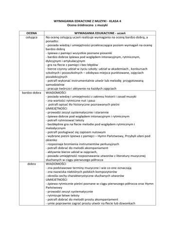 WYMAGANIA EDKACYJNE Z MUZYKI - KLASA 4 Ocena śródroczna z muzyki OCENA celująca bardzo dobra dobra WYMAGANIA EDUKACYJNE - uczeń Na ocenę celującą uczeń realizuje wymagania na ocenę bardzo dobrą, a ponadto: - posiada wiedzę i umiejętności przekraczające poziom wymagań na ocenę bardzo dobrą - śpiewa z pamięci wszystkie poznane piosenki - bardzo dobrze śpiewa pod względem intonacyjnym, rytmicznym, dykcyjnym i artykulacyjnym - gra na flecie z pamięci i bez błędów - bierze czynny udział w życiu szkoły: udział w akademiach , konkursach szkolnych i pozaszkolnych – zdobywa miejsca punktowane, zajęciach pozalekcyjnych - potrafi wykonać instrumentalnie utwór lub melodię przygotowaną samodzielnie - pracuje twórczo i aktywnie na każdych zajęciach WIADOMOŚCI - posiada wiedzę i umiejętności z zakresu historii i zasad muzyki - zna wartości rytmiczne nut i pauz - potrafi opisać tło historyczne poznawanych pieśni UMIEJĘTNOŚCI - prowadzi zeszyt systematycznie i starannie - śpiewa dobrze pod względem intonacyjnym i rytmicznym - potrafi rytmizować teksty - bezbłędnie gra na flecie melodie pod względem rytmicznym i melodycznym - potrafi posługiwać się zapisem nutowym - wybrane pieśni śpiewa z pamięci – Hymn Państwowy, Przybyli ułani pod okienko - rozpoznaje brzmienia instrumentów perkusyjnych - potrafi dobrać do melodii akompaniament - aktywnie bierze udział w zajęciach, - posiada umiejętność rozpoznawania utworów z literatury muzycznej słuchanych w ciągu pierwszego półrocza WIADOMOŚCI - zna podstawowe terminy muzyczne i wie co one oznaczają - zna nazwiska niektórych polskich kompozytorów - określa cechy charakterystyczne słuchanych utworów UMIEJETNOŚCI -.śpiewa rytmicznie pieśni poznane w ciągu pierwszego półrocza oraz Hymn Państwowy - prowadzi zeszyt systematycznie - rytmizuje łatwe teksty - potrafi dobrać do melodii prosty akompaniament - umie poprawnie zagrać prosty utwór na flecie lub dzwonkach dostateczna WIADOMOŚCI - zna niektóre terminy muzyczne - zna nazwy solmizacyjne dźwięków, wartości rytmiczne nut i pauz, rozróżnia elementy muzyki – tempo, dynamikę UMIEJĘTNOŚCI - śpiewa piosenki ale ma kłopoty z intonacją - gra na flecie ale z błędami i nierytmicznie - prowadzi zeszyt - wykonuje najprostsze ćwiczenia rytmiczne dopuszczająca WIADOMOŚCI - myli pojęcia i terminy muzyczne odnośnie wartości rytmicznych , nazw solmizacyjnych i literowych dźwięków - jego wiedza jest fragmentaryczna UMIEJETNOŚCI - prowadzi zeszyt niesystematycznie - zamiast śpiewania recytuje piosenki - gra pojedyncze dźwięki na flecie lub dzwonkach - niechętnie podejmuje działania muzyczne niedostateczna Ocenę niedostateczna otrzymuje uczeń, który nie spełnia wymagań na ocenę dopuszczającą i mimo usilnych starań nauczyciela ma negatywny stosunek do przedmiotu. KLASA 4 Ocena roczna z muzyki OCENA celująca bardzo dobra WYMAGANIA EDUKACYJNE - uczeń Na ocenę celującą uczeń realizuje wymagania na ocenę bardzo dobrą, a ponadto: - posiada wiedzę i umiejętności przekraczające poziom wymagań na ocenę bardzo dobrą - śpiewa z pamięci wszystkie poznane piosenki - bardzo dobrze śpiewa pod względem intonacyjnym, rytmicznym, dykcyjnym i artykulacyjnym - gra na flecie z pamięci i bez błędów - bierze czynny udział w życiu szkoły: udział w akademiach , konkursach szkolnych i pozaszkolnych – zdobywa miejsca punktowane, zajęciach pozalekcyjnych - potrafi wykonać instrumentalnie utwór lub melodię przygotowaną samodzielnie - pracuje twórczo i aktywnie na każdych zajęciach WIADOMOŚCI - zna Polskie Tańce Narodowe i ich cechy, rozpoznaje typy zespołów wokalnych - zna wartości rytmiczne nut i pauz - zna zapis nutowy w obrębie gamy C-dur, potrafi czytać nuty UMIEJĘTNOŚCI - prowadzi zeszyt systematycznie i starannie - śpiewa dobrze pod względem intonacyjnym i rytmicznym - potrafi rytmizować teksty - bezbłędnie gra na flecie melodie pod względem rytmicznym i melodycznym - potrafi posługiwać się zapisem nutowym - wybrane pieśni śpiewa z pamięci Wiosna, Ja mam tylko jeden świat - rozpoznaje brzmienia instrumentów - potrafi dobrać do melodii akompaniament - aktywnie bierze udział w zajęciach, - posiada umiejętność rozpoznawania utworów z literatury muzycznej słuchanych w ciągu roku dobra WIADOMOŚCI - zna podstawowe terminy muzyczne ( fraza, poprzednik, następnik) i wie co one oznaczają - zna nazwiska niektórych polskich kompozytorów UMIEJĘTNOŚCI -.śpiewa rytmicznie pieśni poznane w ciągu drugiego półrocza - prowadzi zeszyt systematycznie - rytmizuje łatwe teksty - potrafi dobrać do melodii prosty akompaniament - umie poprawnie zagrać prosty utwór na flecie lub dzwonkach - określa cechy charakterystyczne słuchanych utworów - rozpoznaje typy zespołów wokalnych dostateczna WIADOMOŚCI - zna niektóre terminy muzyczne - zna nazwy solmizacyjne dźwięków, wartości rytmiczne nut i pauz, nazwy Polskich Tańców narodowych, rozróżnia elementy muzyki – tempo, dynamiki UMIEJĘTNOŚCI - śpiewa piosenki ale ma kłopoty z intonacją - gra na flecie ale z błędami i nierytmicznie - prowadzi zeszyt - wykonuje najprostsze ćwiczenia rytmiczne dopuszczająca WIADOMOŚCI - myli pojęcia i terminy muzyczne - jego wiedza jest fragmentaryczna - wymienia nazwy dźwięków gamy C- dur – solmizacyjne UMIEJĘTNOŚCI - prowadzi zeszyt niesystematycznie - zamiast śpiewania recytuje piosenki - gra pojedyncze dźwięki na flecie lub dzwonkach - niechętnie podejmuje działania muzyczne niedostateczna Ocenę niedostateczna otrzymuje uczeń, który nie spełnia wymagań na ocenę dopuszczającą i mimo usilnych starań nauczyciela ma negatywny stosunek do przedmiotu.