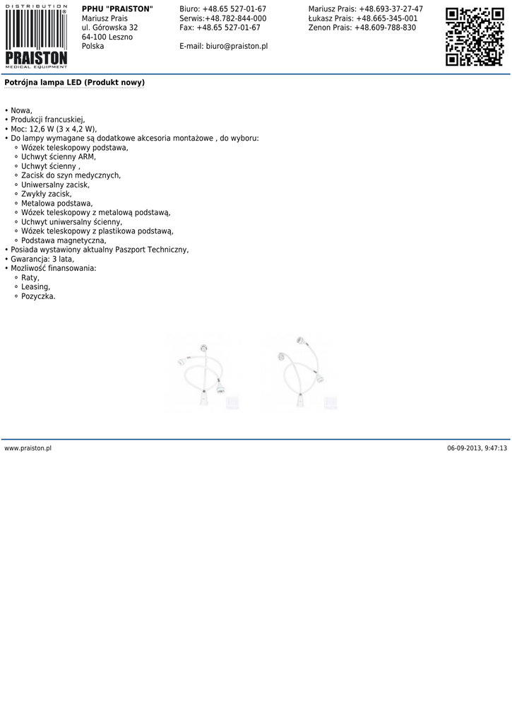 PPHU "PRAISTON" Mariusz Prais ul. Górowska 32 64-100 Leszno Polska Biuro: +48.65 527-01-67 Serwis:+48.782-844-000 Fax: +48.65 527-01-67 Mariusz Prais: +48.693-37-27-47 Łukasz Prais: +48.665-345-001 Zenon Prais: +48.609-788-830 E-mail: [email protected] Potrójna lampa LED (Produkt nowy) • Nowa, • Produkcji francuskiej, • Moc: 12,6 W (3 x 4,2 W), • Do lampy wymagane są dodatkowe akcesoria montażowe , do wyboru: ⚬ Wózek teleskopowy podstawa, ⚬ Uchwyt ścienny ARM, ⚬ Uchwyt ścienny , ⚬ Zacisk do szyn medycznych, ⚬ Uniwersalny zacisk, ⚬ Zwykły zacisk, ⚬ Metalowa podstawa, ⚬ Wózek teleskopowy z metalową podstawą, ⚬ Uchwyt uniwersalny ścienny, ⚬ Wózek teleskopowy z plastikowa podstawą, ⚬ Podstawa magnetyczna, • Posiada wystawiony aktualny Paszport Techniczny, • Gwarancja: 3 lata, • Mozliwość finansowania: ⚬ Raty, ⚬ Leasing, ⚬ Pozyczka. www.praiston.pl 06-09-2013, 9:47:13