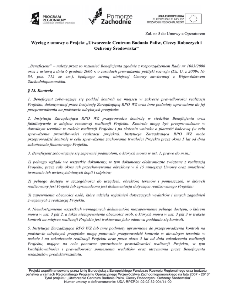 Zał. nr 5 do Umowy z Operatorem Wyciąg z umowy o Projekt „Utworzenie Centrum Badania Paliw, Cieczy Roboczych i Ochrony Środowiska” „Beneficjent” – należy przez to rozumieć Beneficjenta zgodnie z rozporządzeniem Rady nr 1083/2006 oraz z ustawą z dnia 6 grudnia 2006 r. o zasadach prowadzenia polityki rozwoju (Dz. U. z 2009r. Nr 84, poz. 712 ze zm.), będącego stroną niniejszej Umowy zawieranej z Województwem Zachodniopomorskim. § 13. Kontrole 1. Beneficjent zobowiązuje się poddać kontroli na miejscu w zakresie prawidłowości realizacji Projektu, dokonywanej przez Instytucję Zarządzającą RPO WZ oraz inne podmioty uprawnione do jej przeprowadzenia na podstawie odrębnych przepisów. 2. Instytucja Zarządzająca RPO WZ przeprowadza kontrolę w siedzibie Beneficjenta oraz fakultatywnie w miejscu rzeczowej realizacji Projektu. Kontrole mogą być przeprowadzane w dowolnym terminie w trakcie realizacji Projektu i po złożeniu wniosku o płatność końcową (w celu sprawdzenia prawidłowości realizacji projektu). Instytucja Zarządzająca RPO WZ może przeprowadzić kontrolę w celu sprawdzenia zachowania trwałości Projektu przez okres 5 lat od dnia zakończenia finansowego Projektu. 3. Beneficjent zobowiązuje się zapewnić podmiotom, o których mowa w ust. 1, prawo do m.in.: 1) pełnego wglądu we wszystkie dokumenty, w tym dokumenty elektroniczne związane z realizacją Projektu, przez cały okres ich przechowywania określony w § 15 niniejszej Umowy oraz umożliwić tworzenie ich uwierzytelnionych kopii i odpisów; 2) pełnego dostępu w szczególności do urządzeń, obiektów, terenów i pomieszczeń, w których realizowany jest Projekt lub zgromadzona jest dokumentacja dotycząca realizowanego Projektu; 3) zapewnienia obecności osób, które udzielą wyjaśnień dotyczących wydatków i innych zagadnień związanych z realizacją Projektu. 4. Nieudostępnienie wszystkich wymaganych dokumentów, niezapewnienie pełnego dostępu, o którym mowa w ust. 3 pkt 2, a także niezapewnienie obecności osób, o których mowa w ust. 3 pkt 3 w trakcie kontroli na miejscu realizacji Projektu jest traktowane jako odmowa poddania się kontroli. 5. Instytucja Zarządzająca RPO WZ lub inne podmioty uprawnione do przeprowadzenia kontroli na podstawie odrębnych przepisów mogą ponownie przeprowadzić kontrole w dowolnym terminie w trakcie i na zakończenie realizacji Projektu oraz przez okres 5 lat od dnia zakończenia realizacji Projektu, mające na celu ponowne sprawdzenie prawidłowości realizacji Projektu, w tym kwalifikowalności i prawidłowości poniesienia wydatków oraz utrzymania przez Beneficjenta wskaźników produktu/rezultatu. Projekt współfinansowany przez Unię Europejską z Europejskiego Funduszu Rozwoju Regionalnego oraz budżetu państwa w ramach Regionalnego Programu Operacyjnego Województwa Zachodniopomorskiego na lata 2007 - 2013” Tytuł projektu: „Utworzenie Centrum Badania Paliw, Cieczy Roboczych i Ochrony Środowiska” Numer umowy o dofinansowanie: UDA-RPZP.01.02.02-32-004/14-00 6. W przypadku przeprowadzenia kontroli lub audytów Projektu przez inne podmioty niż Instytucja Zarządzająca RPO WZ, Beneficjent zobowiązuje się przekazać niezwłocznie Instytucji Zarządzającej RPO WZ wyniki kontroli lub audytu, zalecenia pokontrolne lub inne równoważne dokumenty. § 14 Obowiązki w zakresie informacji i promocji 1. Beneficjent zobowiązuje się do: 1) zapewnienia informowania społeczeństwa o współfinansowaniu realizacji Projektu przez Unię Europejską, zgodnie z wymogami rozporządzenia Komisji WE nr 1828/2006 z dnia 8 grudnia 2006 r. oraz wytycznymi i zaleceniami Instytucji Zarządzającej RPO WZ; 2) wypełniania obowiązków informacji i promocji w zakresie określonym we Wniosku o dofinansowanie, o którym mowa w § 2 ust. 1 niniejszej Umowy; 3) zamieszczenia we wszystkich dokumentach i materiałach, które przygotowuje w związku z realizacją Projektu, informacji o udziale Unii Europejskiej oraz Europejskiego Funduszu Rozwoju Regionalnego we współfinansowaniu Projektu oraz oznaczania dokumentów i miejsca realizacji Projektu, a także urządzeń, obiektów, terenów i pomieszczeń, w których realizowany jest Projekt, następującymi logotypami: emblemat Unii Europejskiej, logo Narodowej Strategii Spójności, herb Województwa Zachodniopomorskiego; 4) przekazania nieodpłatnie na rzecz Instytucji Zarządzającej RPO WZ praw autorskich do materiałów związanych z realizowanym Projektem (takich jak między innymi: prezentacje, zdjęcia, zapisy audiowizualne) na potrzeby promocji Regionalnego Programu Operacyjnego Województwa Zachodniopomorskiego. § 15 Obowiązki w zakresie archiwizacji 1. Beneficjent zobowiązuje się do przechowywania kompletnej dokumentacji związanej z realizacją Projektu (obejmującej między innymi wniosek aplikacyjny wraz z załącznikami, sprawozdania i wnioski o płatność wraz z załącznikami, korespondencję dotyczącą Projektu oraz dokumenty wymagane do podpisania umowy wraz z umową) co najmniej do dnia 31 grudnia 2020 r. w swojej siedzibie, z zastrzeżeniem ust. 2 i 3. 2. Instytucja Zarządzająca RPO WZ może przedłużyć termin, o którym mowa w ust. 1, informując o tym Beneficjenta na piśmie przed upływem tego terminu. 3. Beneficjent jest zobowiązany do przechowywania dokumentów dotyczących pomocy publicznej przez okres 10 lat od dnia podpisania umowy o dofinansowanie Projektu, ale nie krócej niż do dnia 31 grudnia 2020 r. 4. W przypadku zmiany miejsca przechowywania dokumentów, o których mowa w ust. 1, jak również w przypadku zawieszenia, zaprzestania bądź likwidacji przez Beneficjenta działalności przed upływem terminów, o których mowa w ustępach poprzedzających ust. 1, Beneficjent zobowiązuje się do niezwłocznego pisemnego poinformowania Instytucji Zarządzającej RPO WZ o miejscu przechowywania dokumentów związanych z realizacją Projektu. Projekt wsp