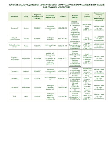 WYKAZ LEKARZY SĄDOWYCH UPRAWNIONYCH DO WYDAWANIA ZAŚWIADCZEŃ PRZY SĄDZIE OKRĘGOWYM W RADOMIU Nazwisko Krawczyk Imię Robert Nr prawa wykonywania zawodu 5062029 Posiadane specjalizacje ortopedia, traumatologia II° Telefon 608 652 030 Miejsce przyjęć SPZZOZ w Kozienicach ul. Sikorskiego 10 Oddział UrazowoOrtopedyczny Czas przyjęć poniedziałki, środy, piątki 14.00-15.00 Czas trwania umowy o wykonywanie czynności od 30.01.2008 na czas nieokreślony (pokój lekarski) KsiążekTomaszewska MatuszkiewiczKotas Napora – Grabowska Renata Maria Magdalena 9064481 medycyna rodzinna 7056491 otolaryngologia II° 8739193 pediatria Io choroby płuc IIo alergologia IIo organizacja ochrony zdrowia IIo 600 350 669 517 257 787 668 240 470 604 40 83 43 Piotrowicz Andrzej 2041287 ortopedia, traumatologia II° Piotrowicz Jolanta 1366767 otolaryngologia II° 600 074 537 Szczodry Małgorzata 5737258 medycyna rodzinna, pediatria Iº 510 295 265 5737247 medycyna ogólna II°, medycyna rodzinna II°, Żak Lech 501 345 963 Gabinet Lekarski ul. Letnia 5 05-660 Warka Poradnia laryngologiczna ul. Mieszka I 1 26-600Radom Gabinet Lekarski ul. Piłsudskiego 33 05-600 Grójec Gabinet Lekarski ul. Główna 12 26-600 Radom Gabinet ortopedyczny ul. Mieszka I 1 26-600 Radom Poradnia laryngologiczna ul. Mieszka I 1 26-600Radom Ośrodek Zdrowia w Jedlińsku ul. Konopnickiej 11 26-660 Jedlińsk Gabinet lekarski ul. Lotników 15 05-660 Warka środy 17.00-19.00 od 1.07.2008 na czas nieokreślony wtorki 17.00-18.00 czwartki 11.00-12.00 od 31.01.2008 na czas nieokreślony środy 13.00-16.00 poniedziałki 9.00-12.00 wtorki 11.00-15.00 od 20.01.2009 na czas nieokreślony poniedziałki 16.30-17.30 czwartki 16.30-17.30 środy 12.00-13.00 czwartki 17.00-18.00 środa 1400 – 1800 czwartek 800 – 1500 piątek 800 - 1500 wtorek 16.00-18.00 czwartek 16.00-18.00 od 31.01.2008 na czas nieokreślony od 30.01.2008 na czas nieokreślony od 09.05.2008 na czas nieokreślony od 05.02.2008 na czas nieokreślony